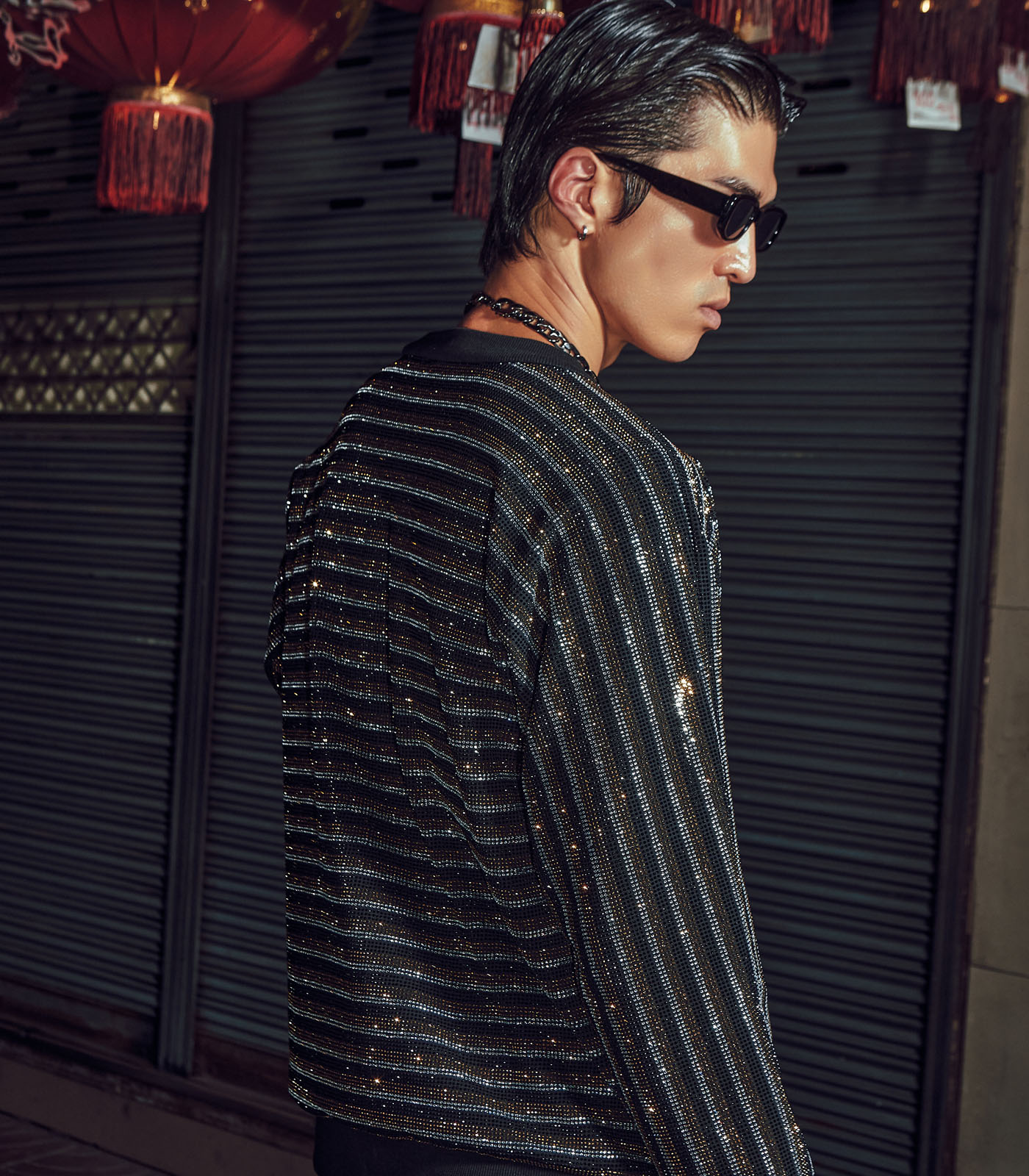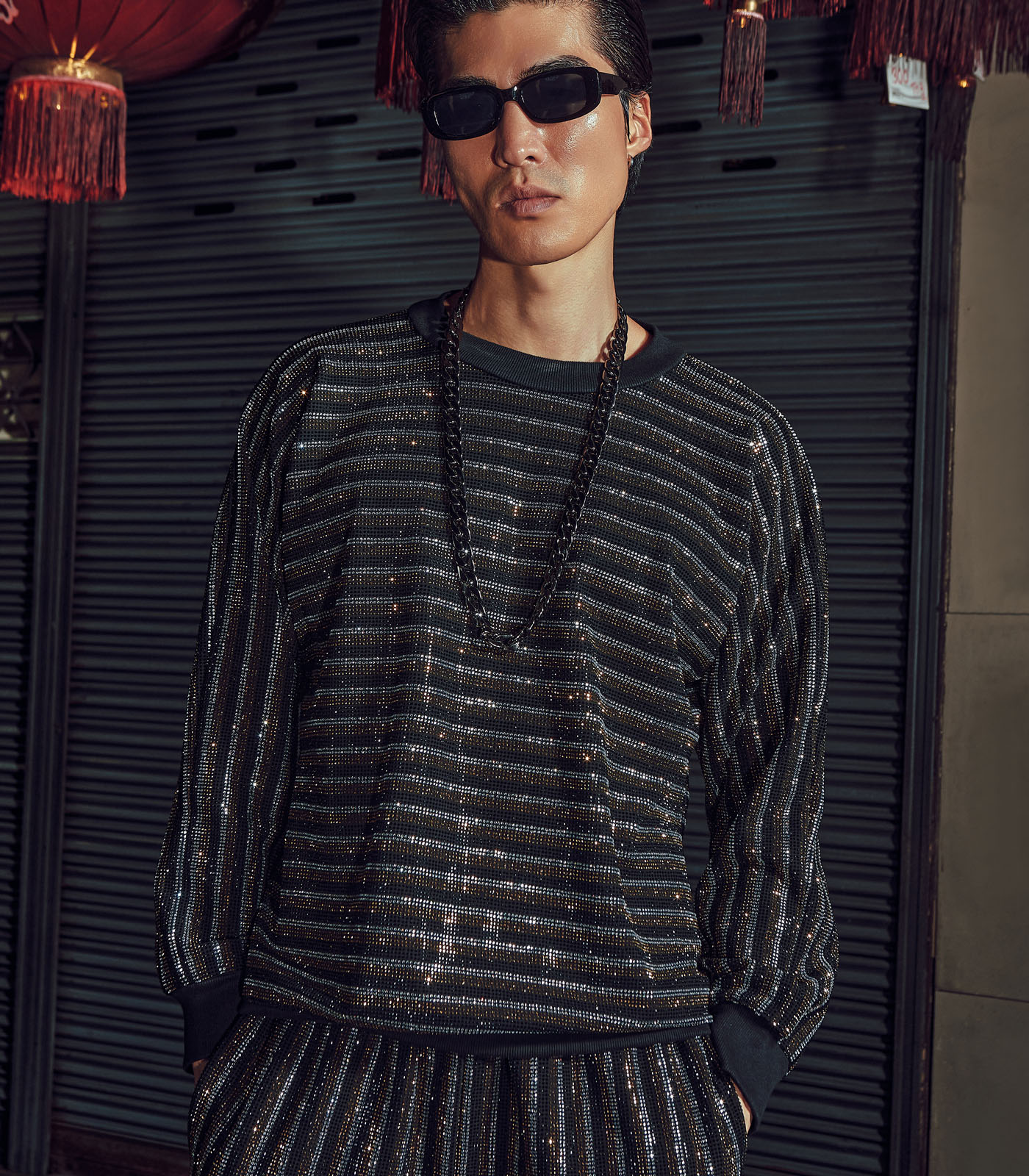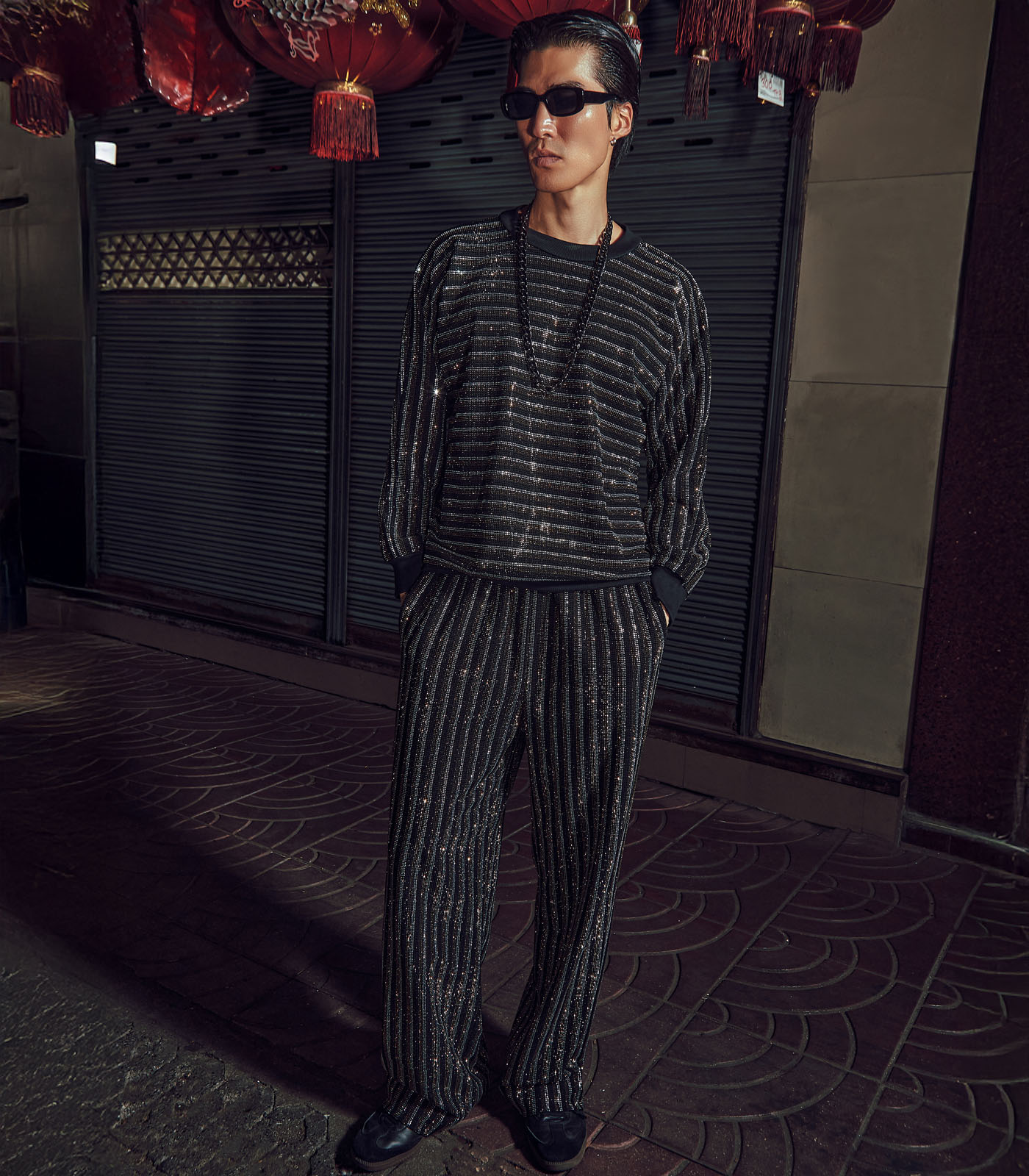 This set includes a black striped sweatshirt and matching trousers in roama fabric.