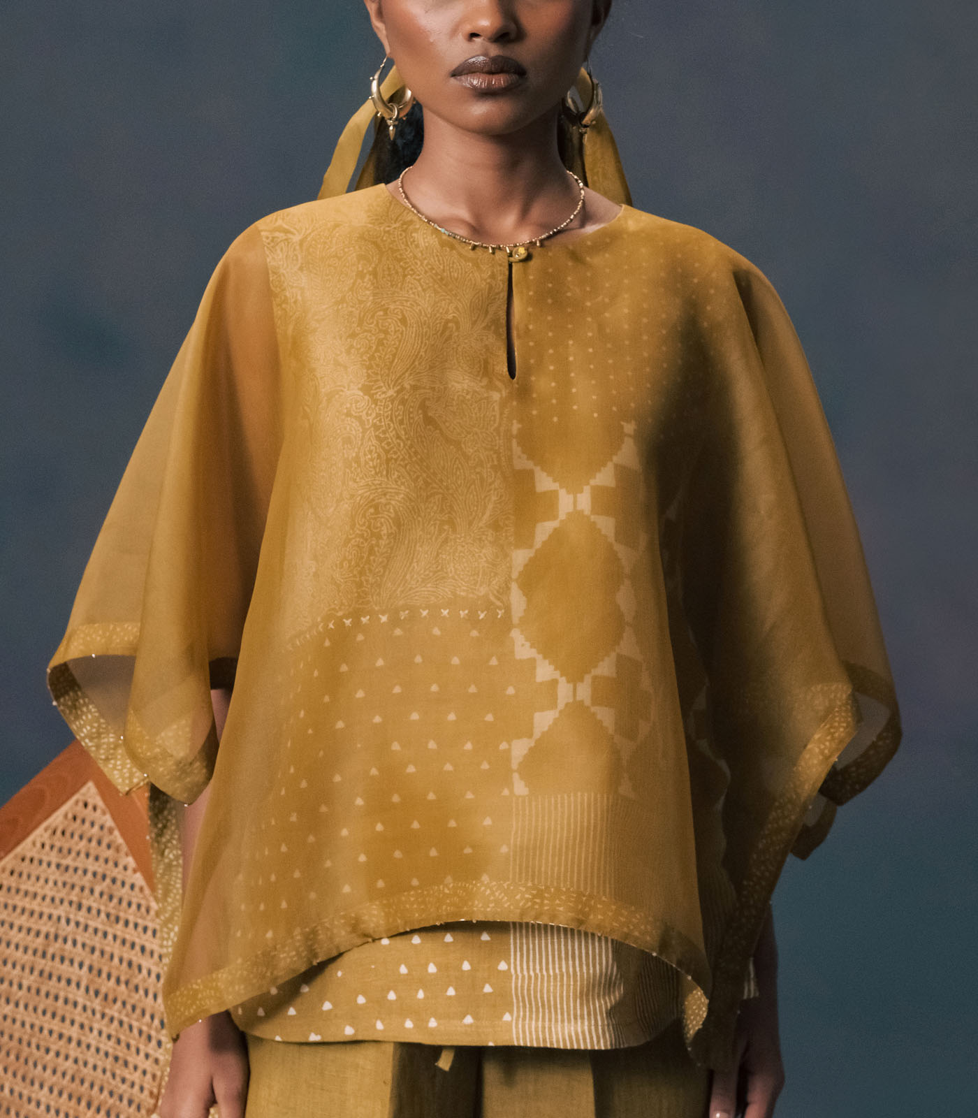 MOSS GREEN DOUBLE LAYER DISCHARGE PRINT KAFTAN SHIRT IN LINEN AND ORGANZA WITH STRAIGHT PANTS IN LINEN