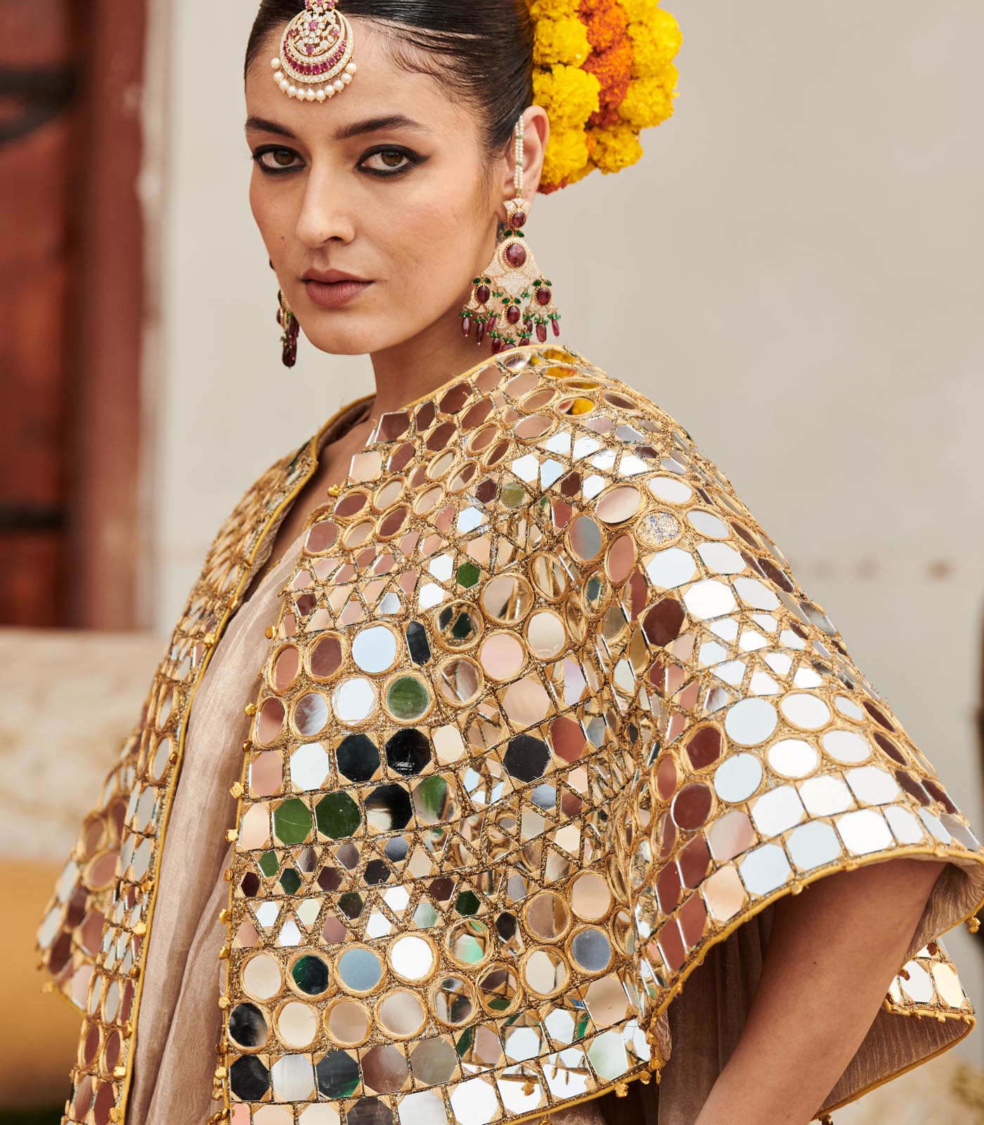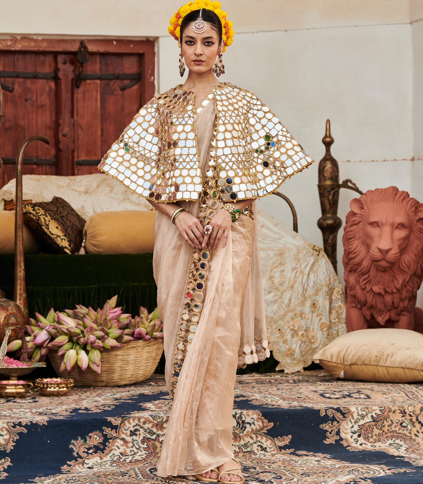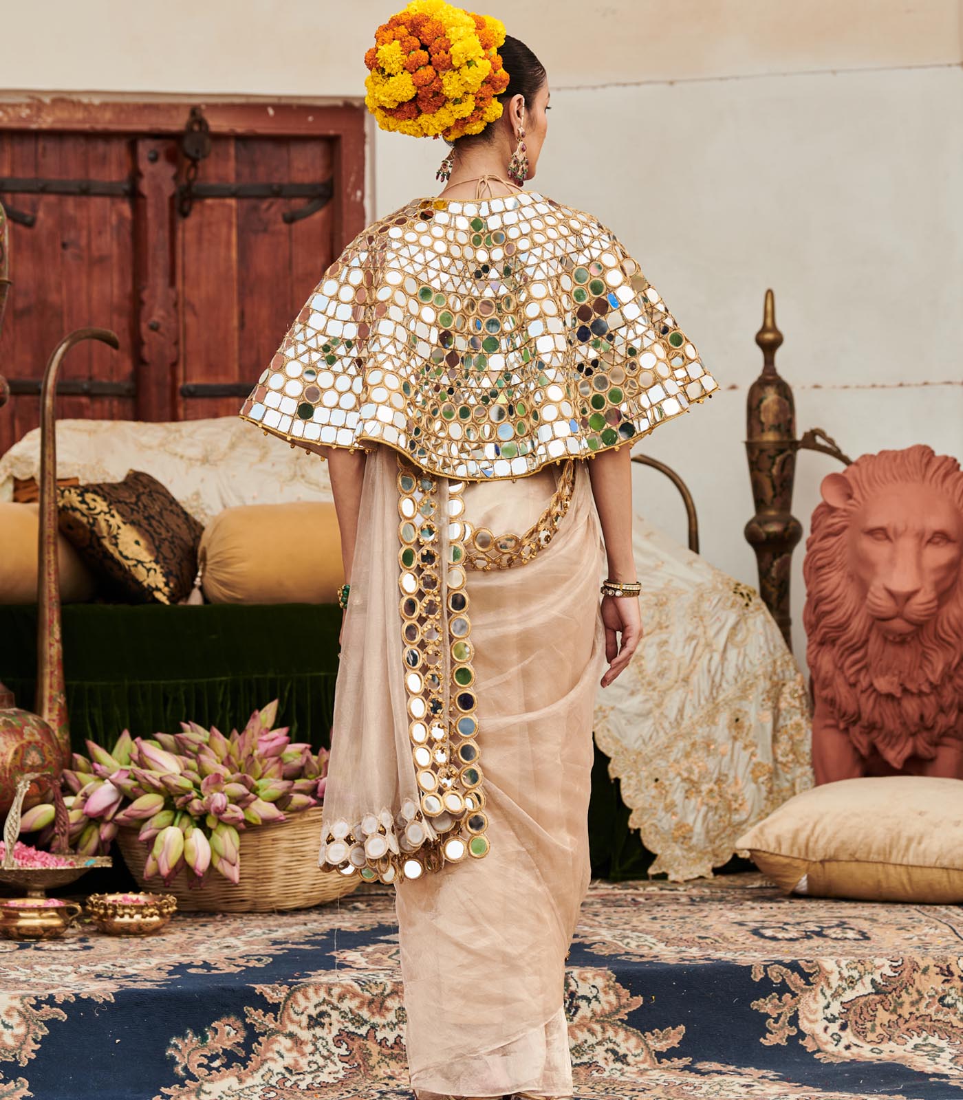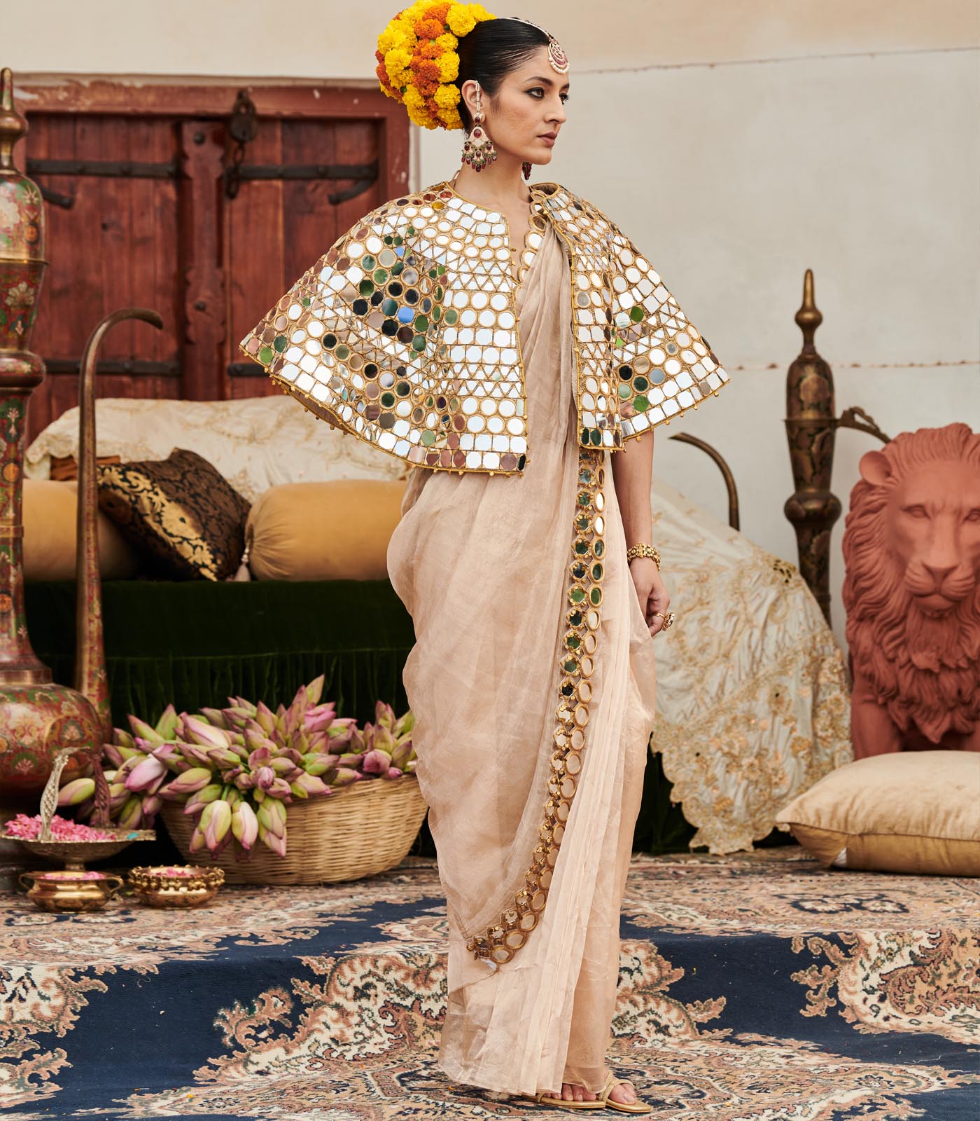 Beige Saree with mirror work border styled with a full mirror work bolero cape on gota lined with chanderi silk.