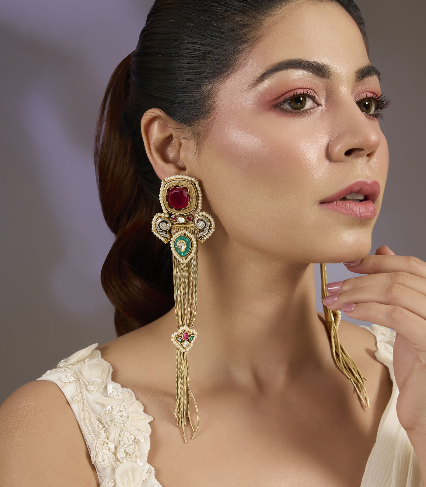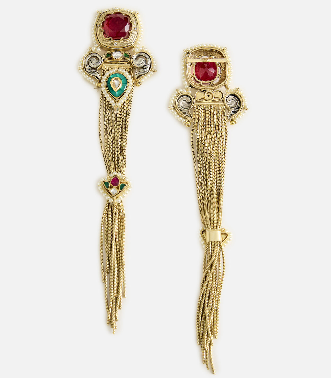 Bold multicolor stone long statement earrings featuring red, green, and pink accents with golden tassel drops. A striking fusion piece, perfect for weddings, festive occasions, and evening glamour.