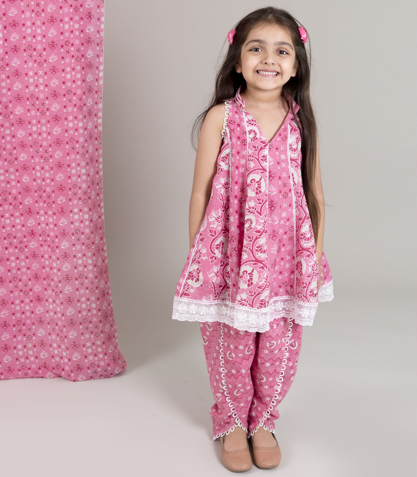 Printed muslin top in pink color with lace detailing and matching dhoti