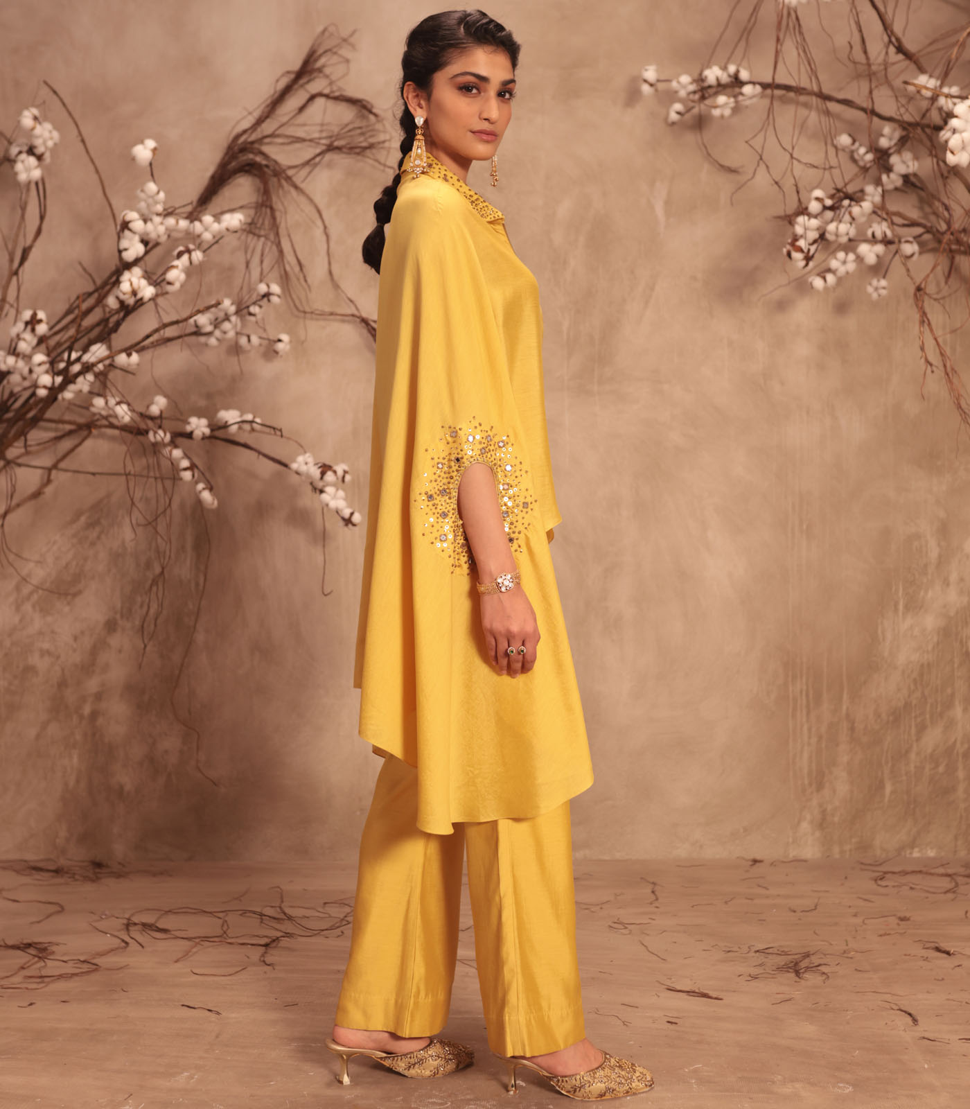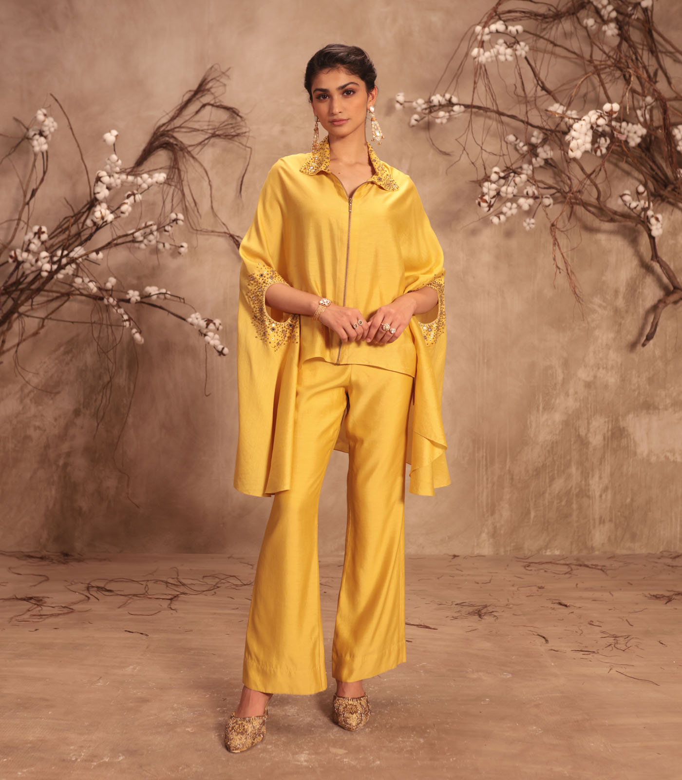 This 2 piece cape set is enhanced with tikki, zardosi and mirror embroidery. It is paired with flared pants.