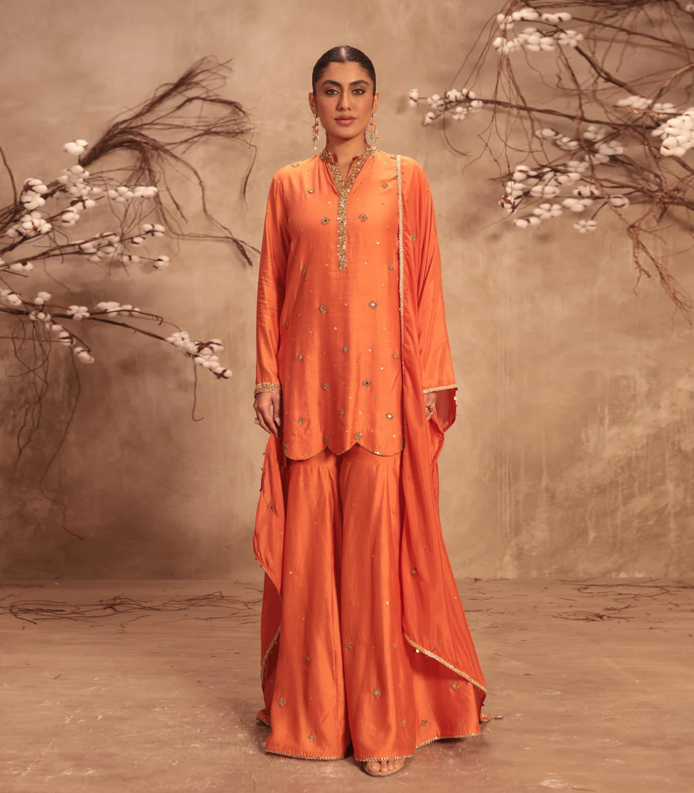 This 3 piece sharara set comes with mirror, zardosi and tikki embroidery on the collar and kurta-patti. It is enhanced with tikki and mirror butis spread all over the kurta and sharara. It is paired with embroidered dupatta with mirror butis, zari lace and tikki hangings.