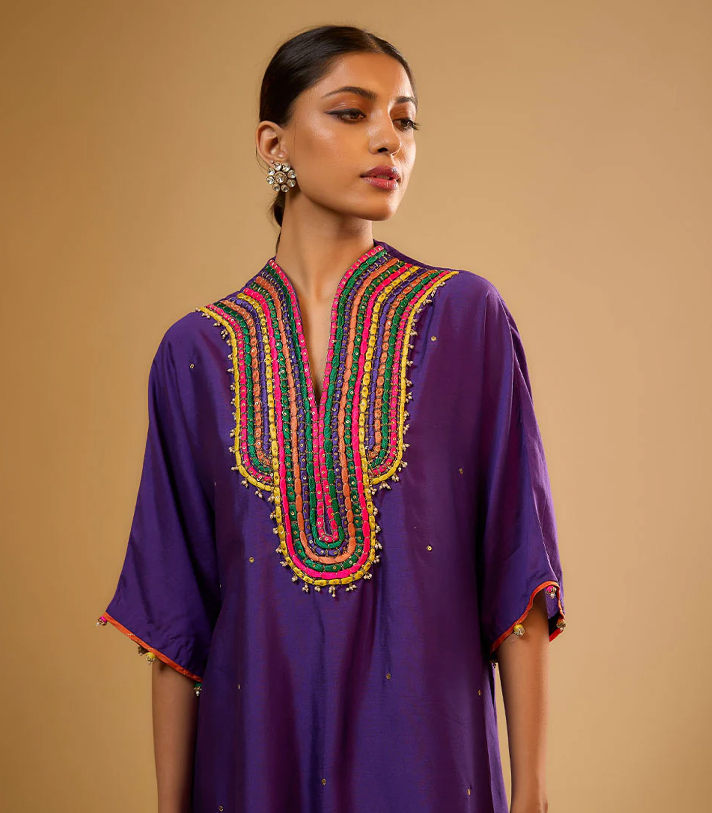 This 2 piece kurta set comes with multicolor embroidered neckline with tikki, zardosi embroidery and pearl hangings. To enhance the look it has sprinkles of tikki all over the kurta. It is paired with palazzo pants.