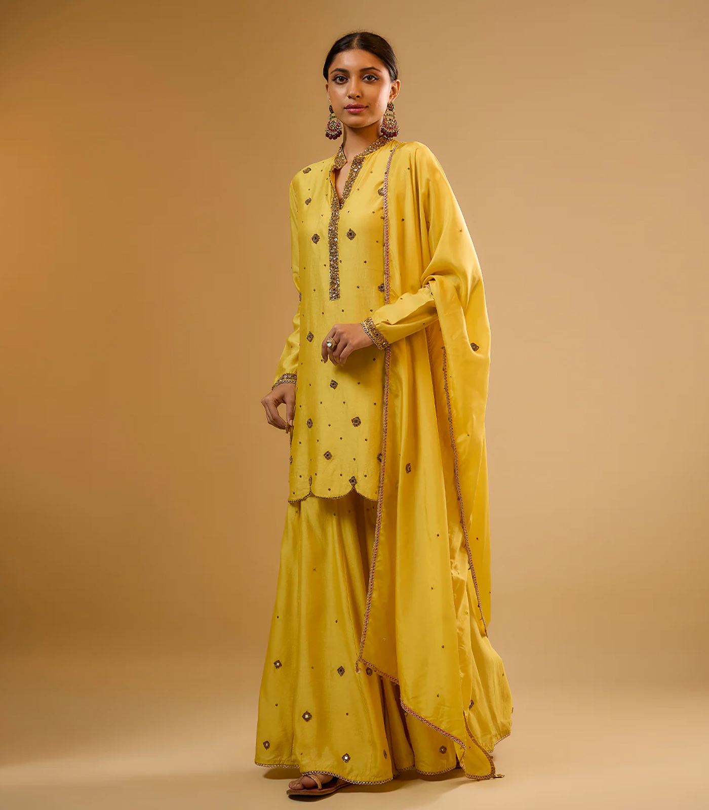 This 3 piece sharara set comes with mirror, zardosi and tikki embroidery on the collar and kurta-patti. It is enhanced with tikki and mirror butis spread all over the kurta and sharara. It is paired with embroidered dupatta with mirror butis, zari lace and tikki hangings.