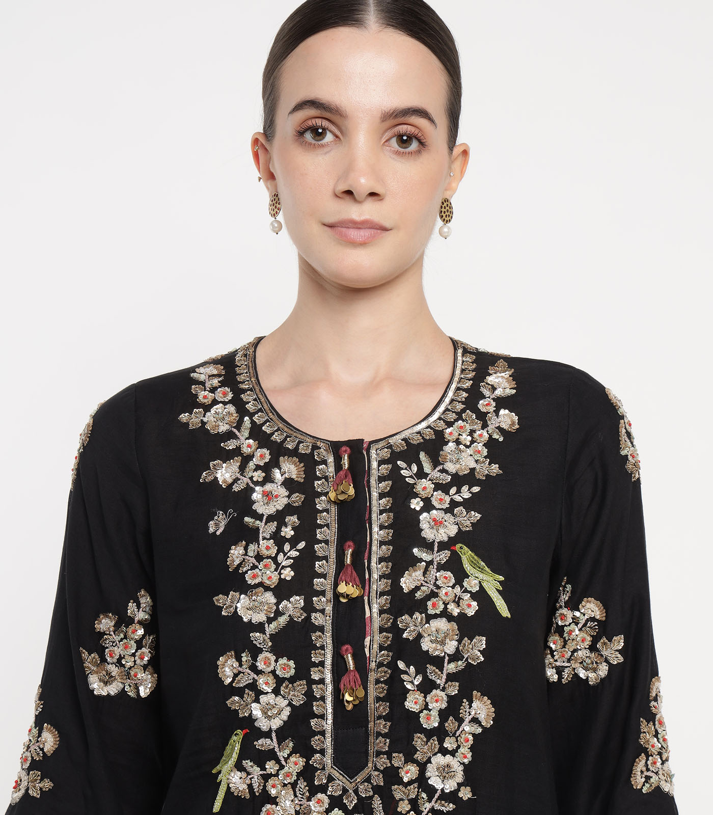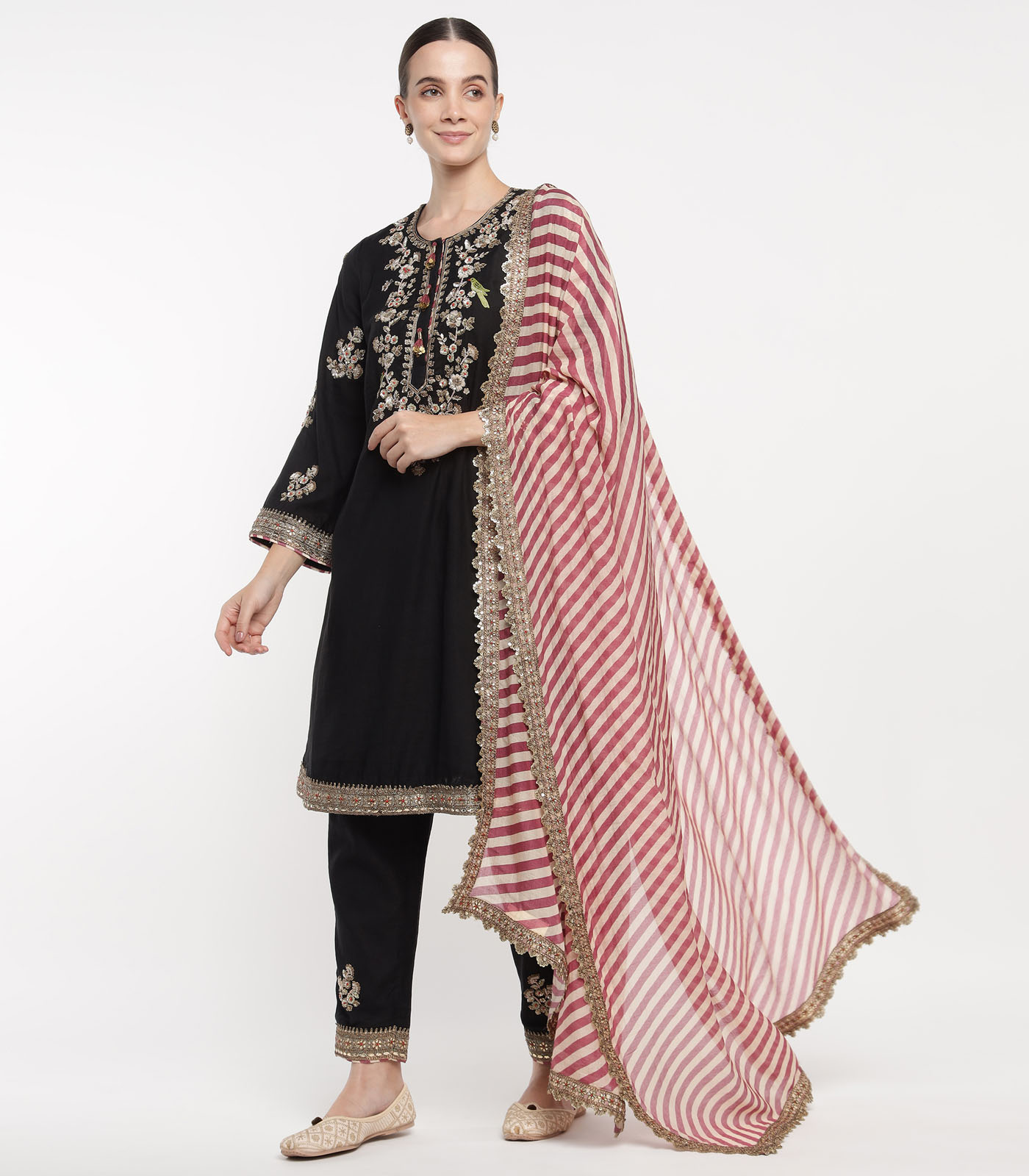 In beige mul chanderi, the Beige Noor E Summer Kurta Set comes alive with baroque embroidery with dabka and playful parrot motifs. Its graceful flare pairs beautifully with a leheriya dupatta, perfect for pooja, satsang, gurudwara and festive gatherings. For those who value artistry, heritage, and grace in every thread.