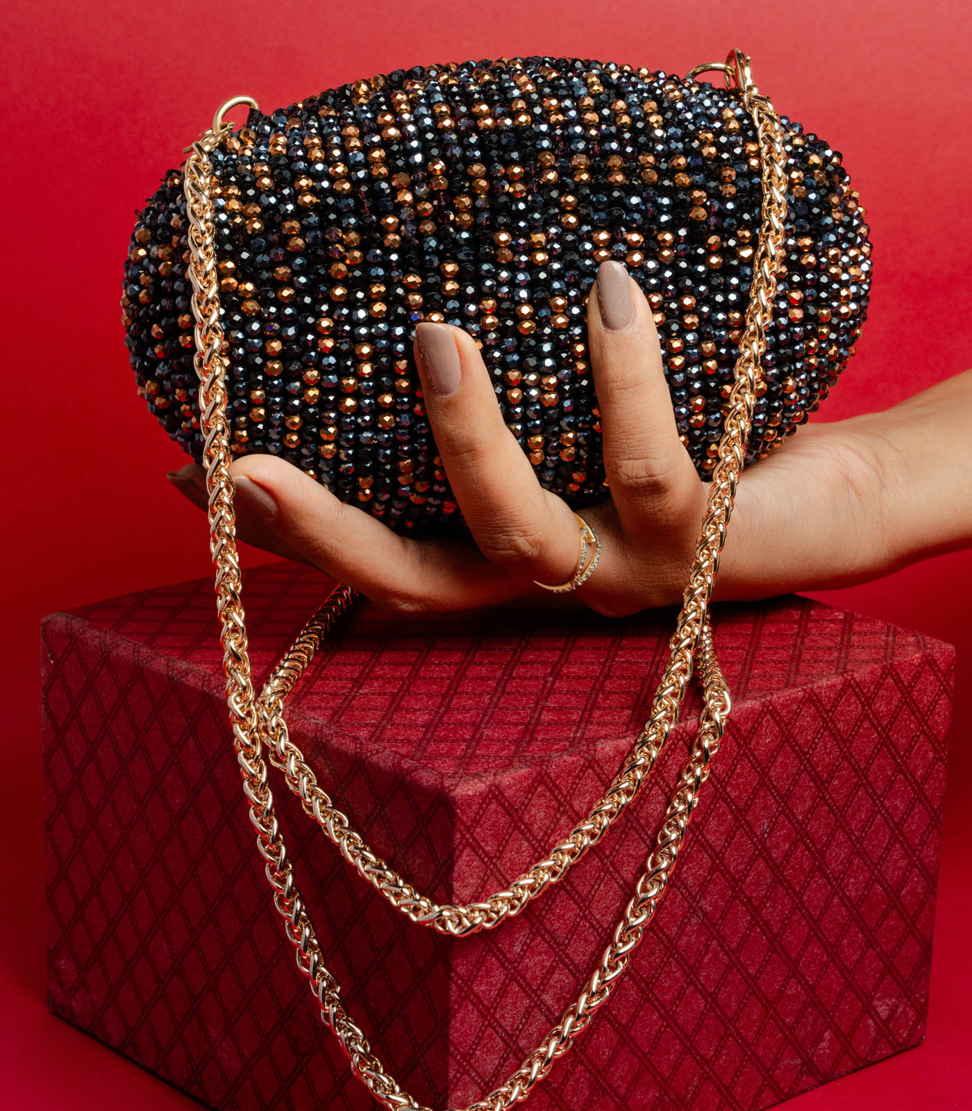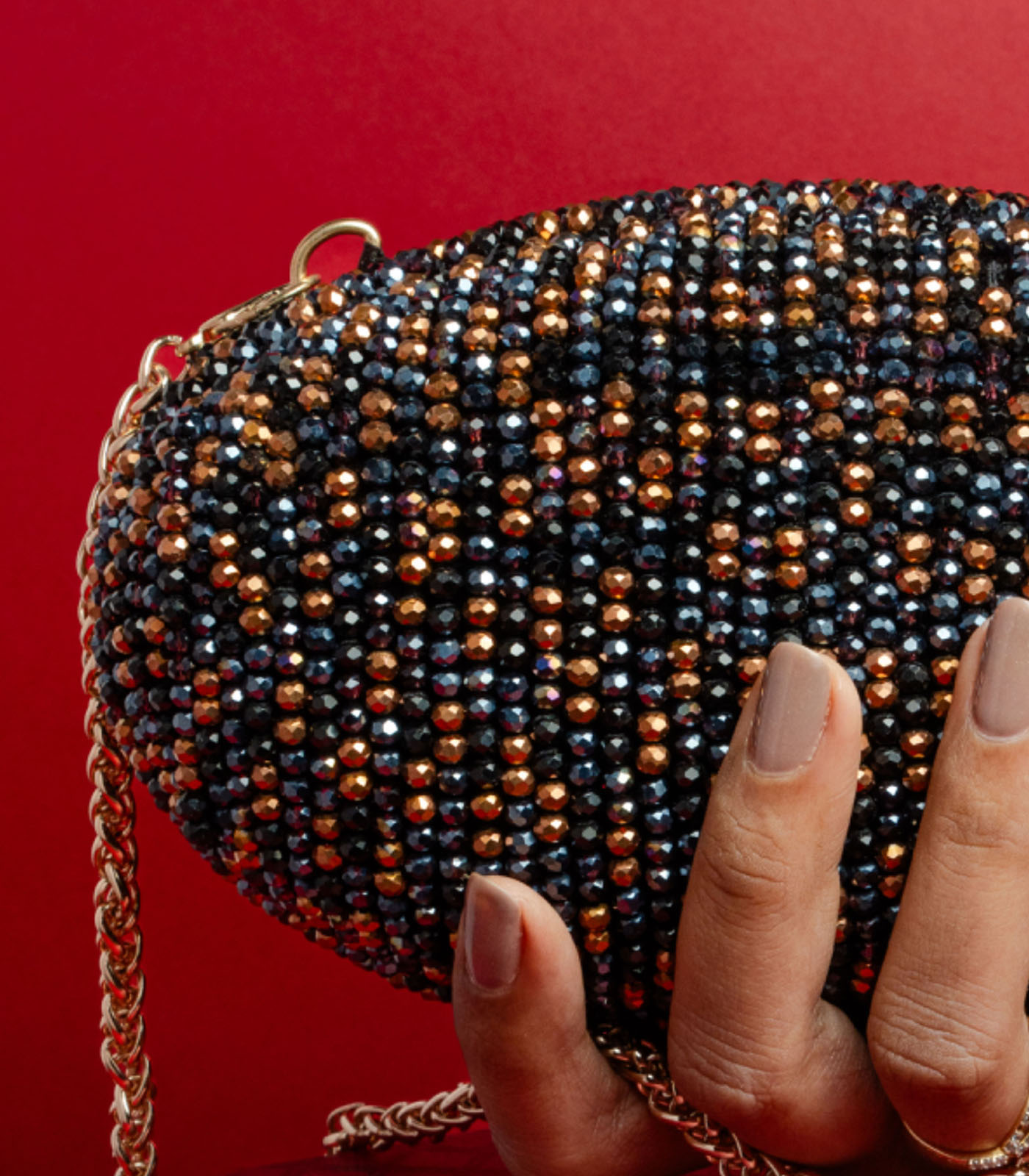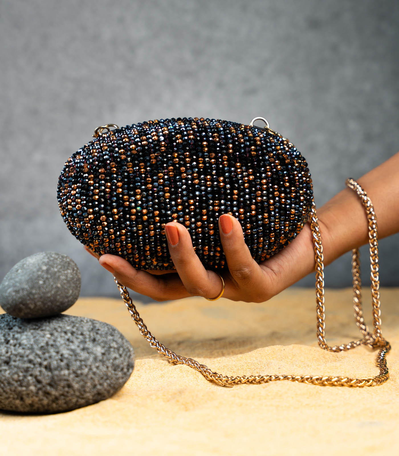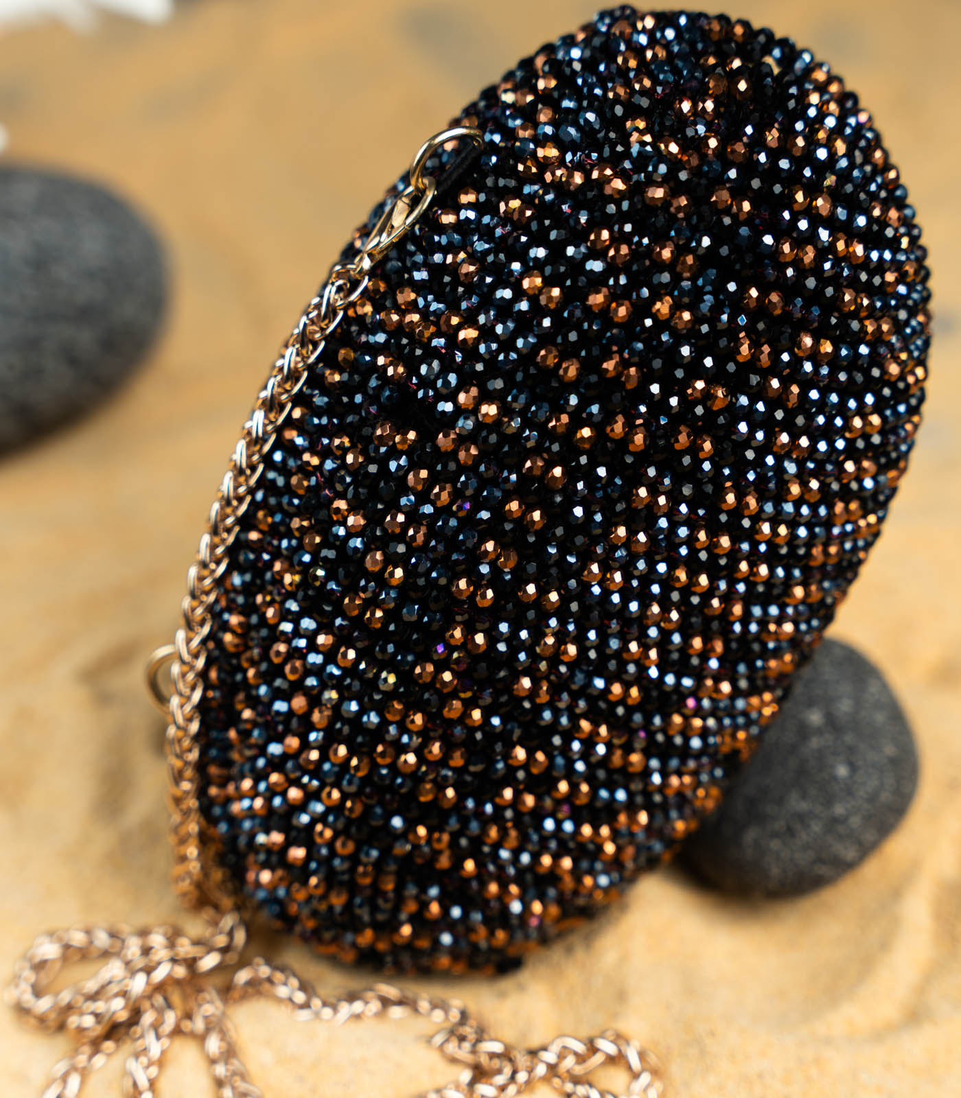 A black and copper oval accessory adorned with intricate bead work. Perfect for adding a touch of elegance and sparkle to any special occasion, this clutch blends traditional artistry with a modern, sophisticated design and can be carried as a cross body bag too