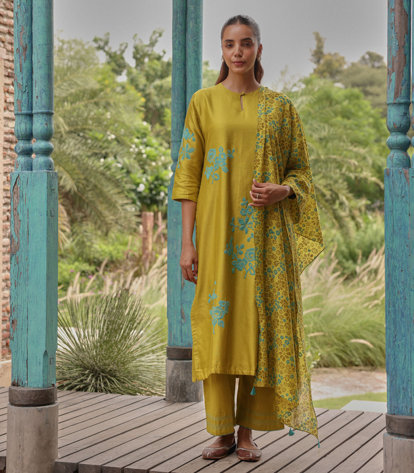 The Ochre Applique Kurta Set is adorned with contrasting applique florals for a touch of elegance, with the sleeves carrying delicate detailing. The kurta is paired with a floral printed dupatta and matching pants featuring thread accents.