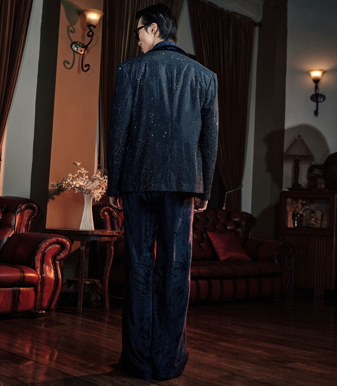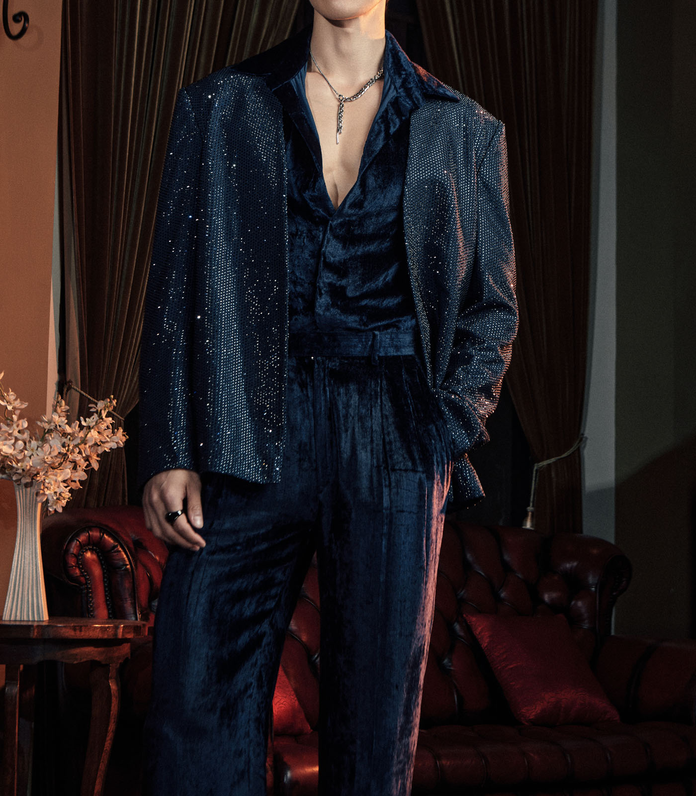 This set includes a midnight blue open jacket in melon crepe and a matching velvet coord set.