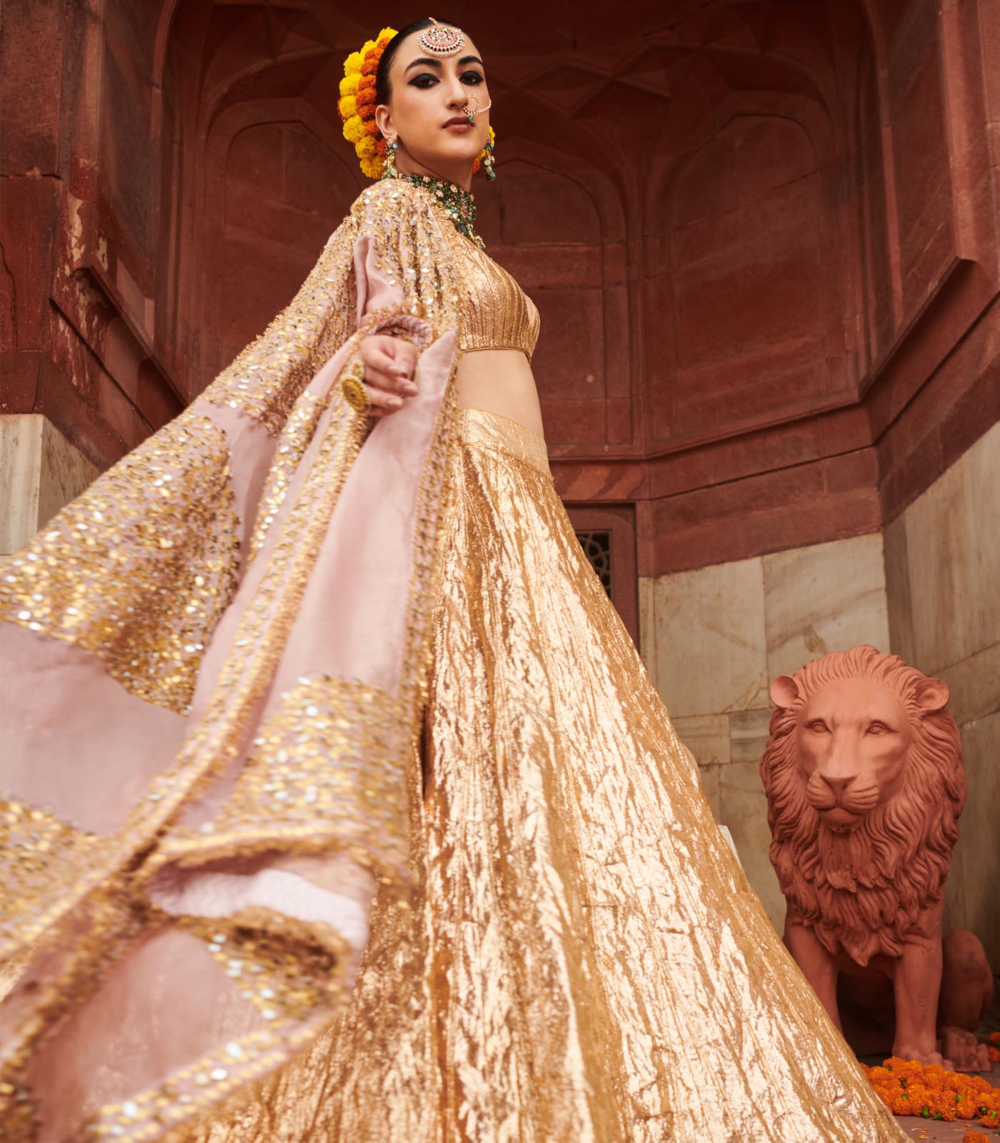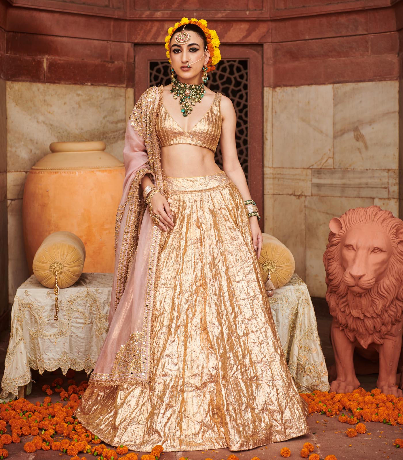 Full rose gold lampi lehenga paired with a sleeveless blouse and highlighted with pink dupatta.