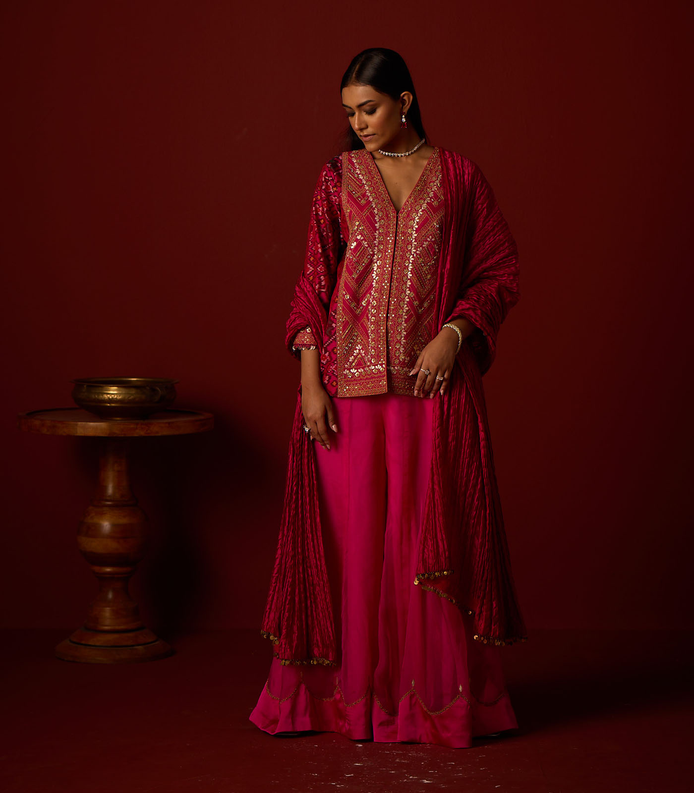 | Fabric | This Patola Weave Silk ensemble with Marodi and Zardozi work is specially designed by our team. It is crafted with great care and precision. The garment is styled with Satin Dhoti Salwar . |