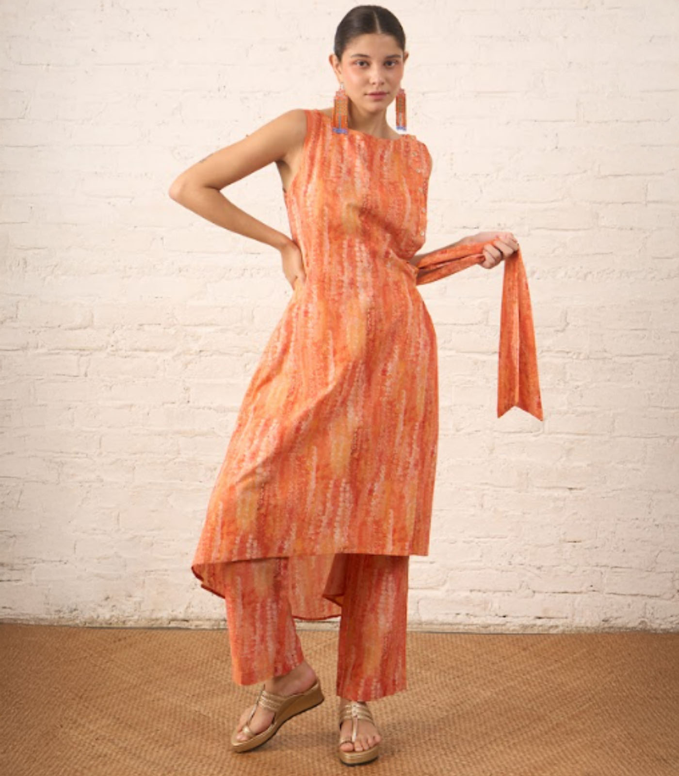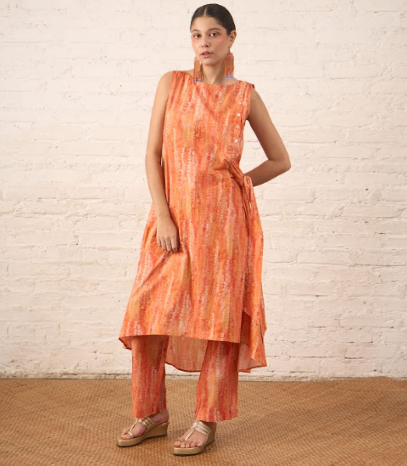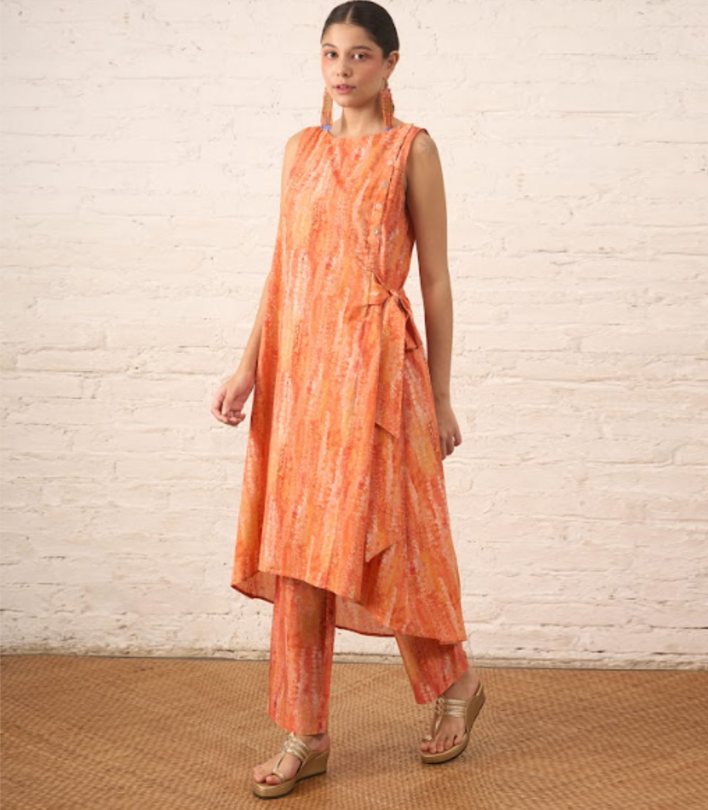 A sleeveless peach side tie-up kurta set in soft, patterned with gentle brush‑stroke prints. Light, summery, and fluid — a piece that brings effortless movement and warmth to every day.