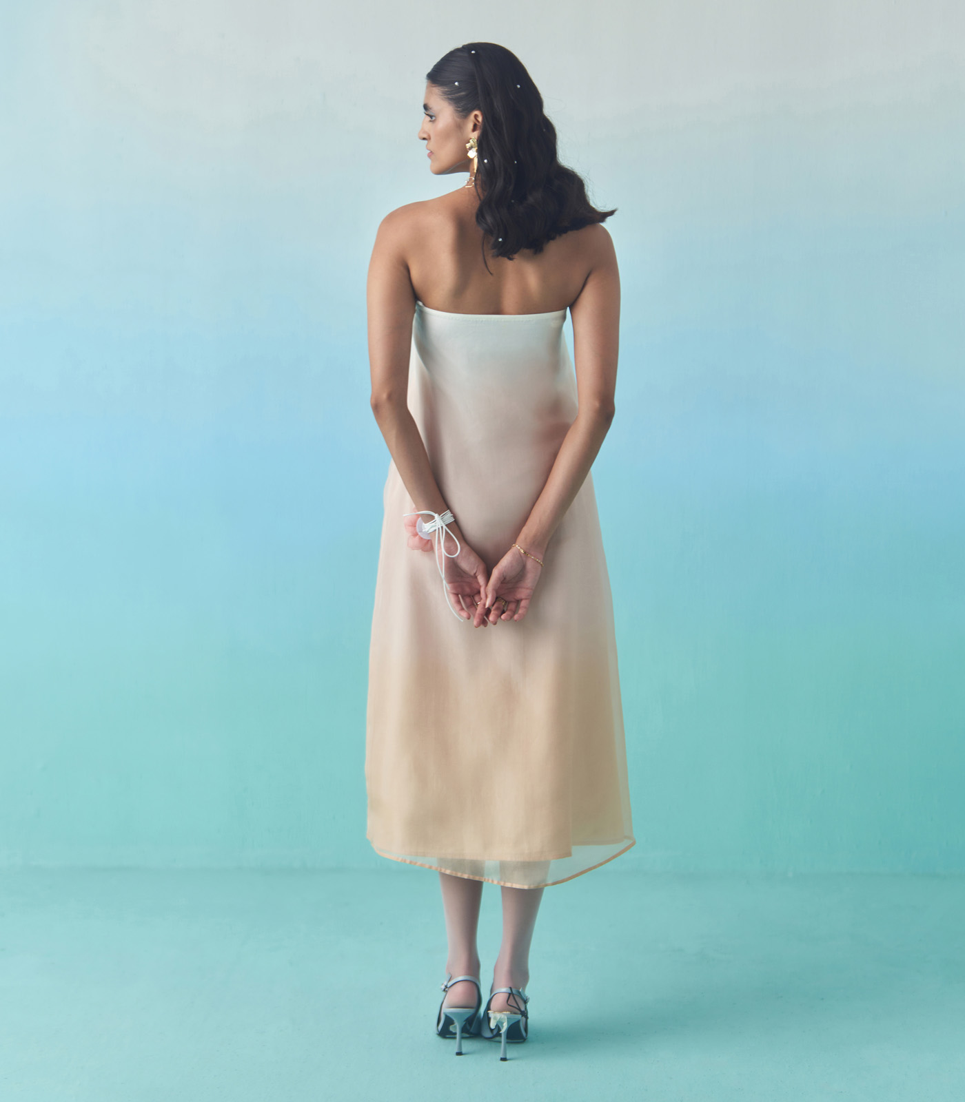 A chic tube dress featuring a poppy embellished by hand, the colour is a representation of a summer sunset in dull peaches and nude pink ombrés