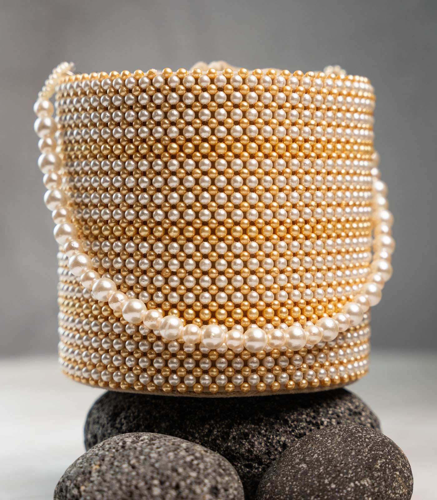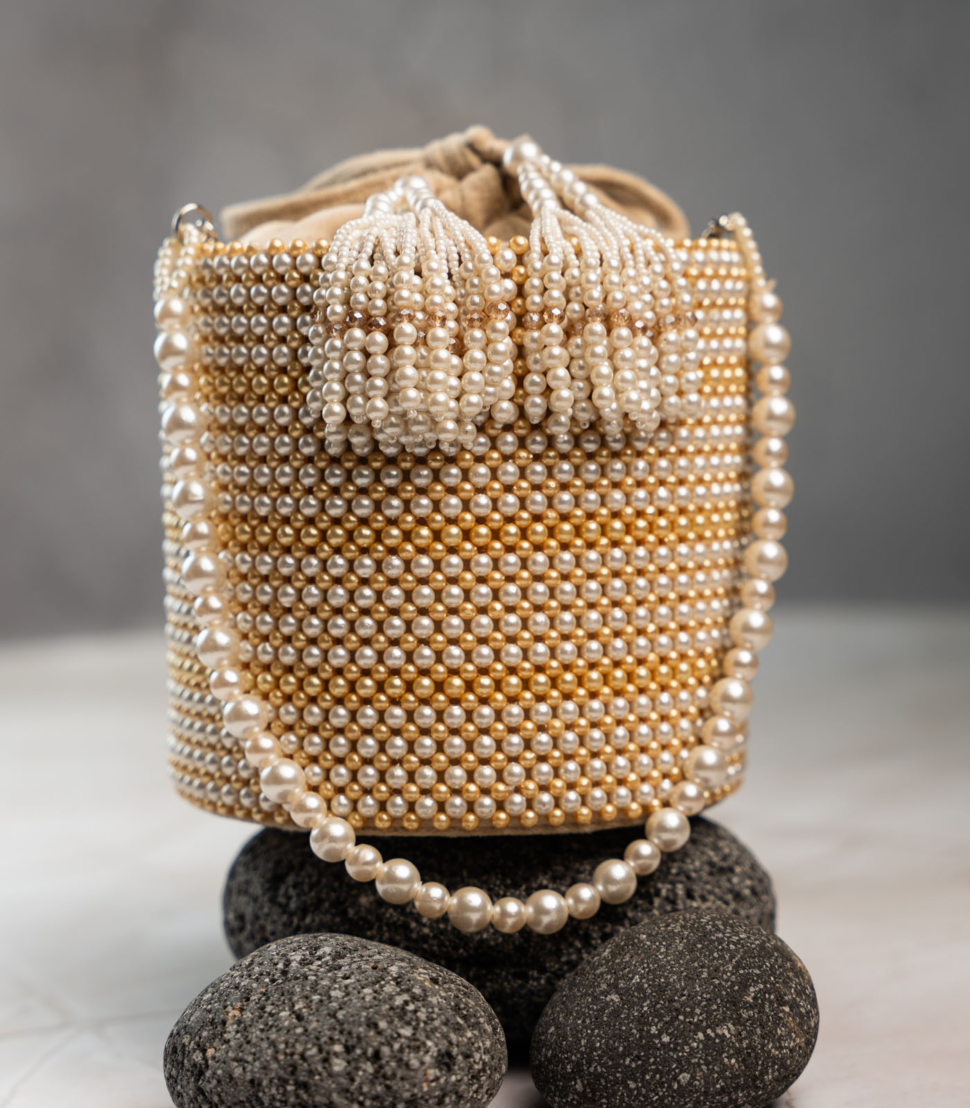 a sleek cylindrical accessory featuring a stunning mix of shimmering gold beads and intricate pearl work in a lustrous off white hue. Perfect for adding a touch of glamour to any special occasion, this potli blends traditional craftsmanship with a modern, eye-catching design.
