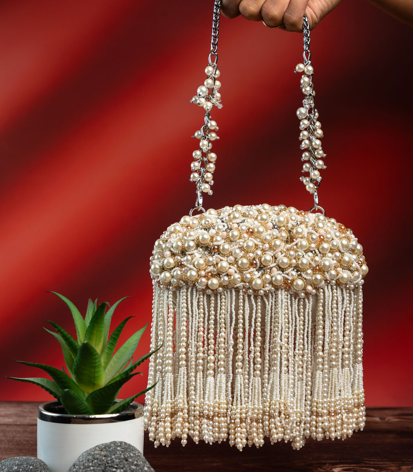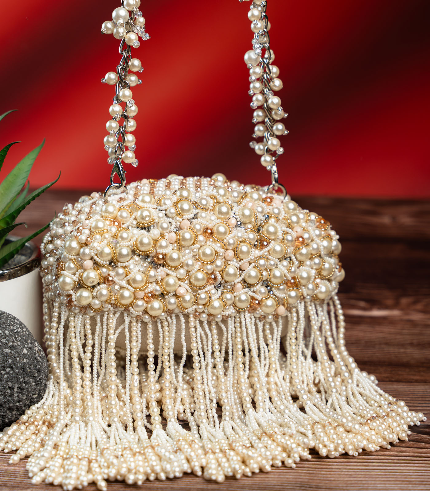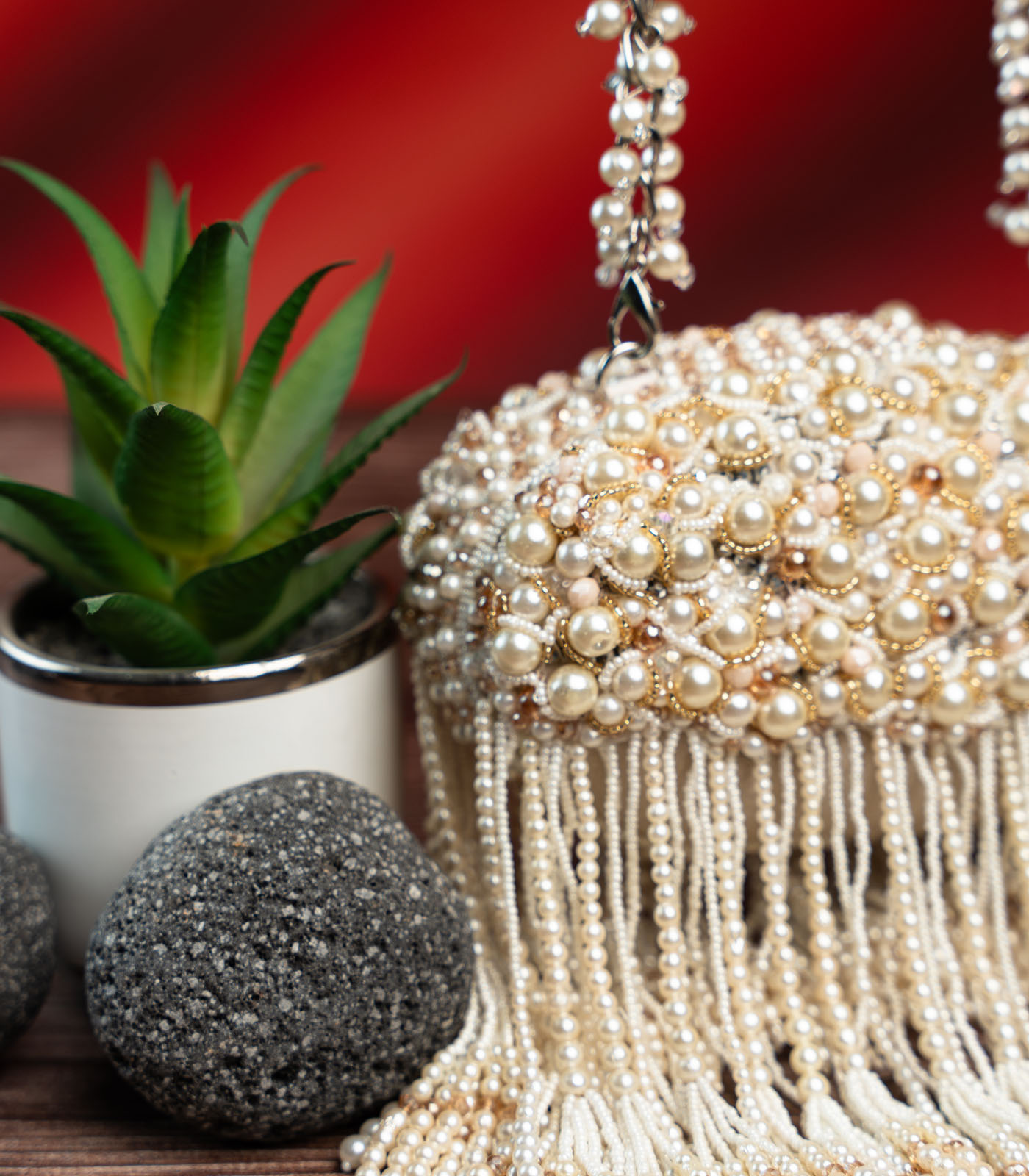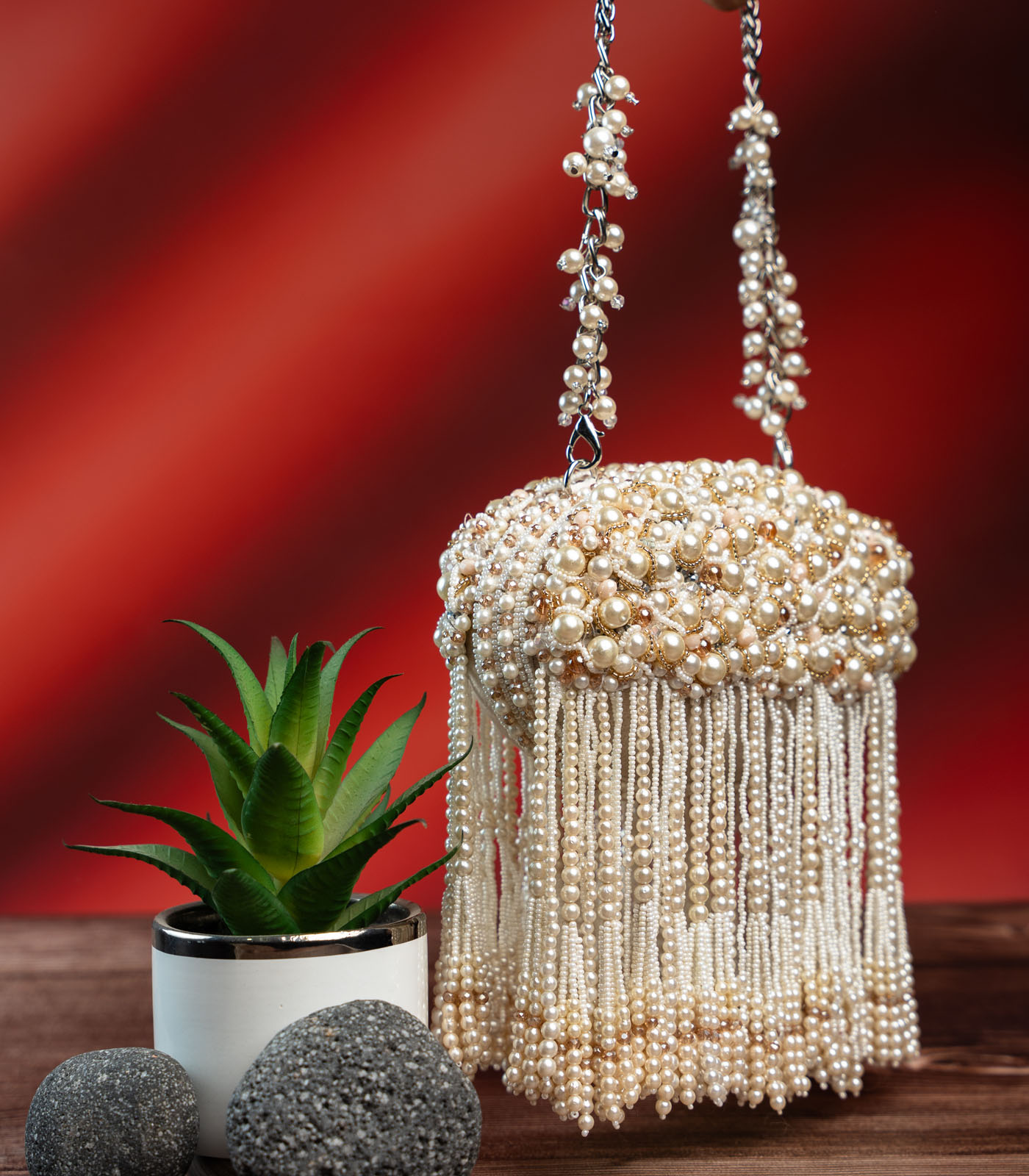 This tasseled clutch is a stunning blend of elegance and craftsmanship, featuring lustrous beads and intricate work in a pearl palette. Finished with delicate tassels, it’s the perfect accessory for weddings, festive events, or evening soirées. The bag may come with a silver or gold handle