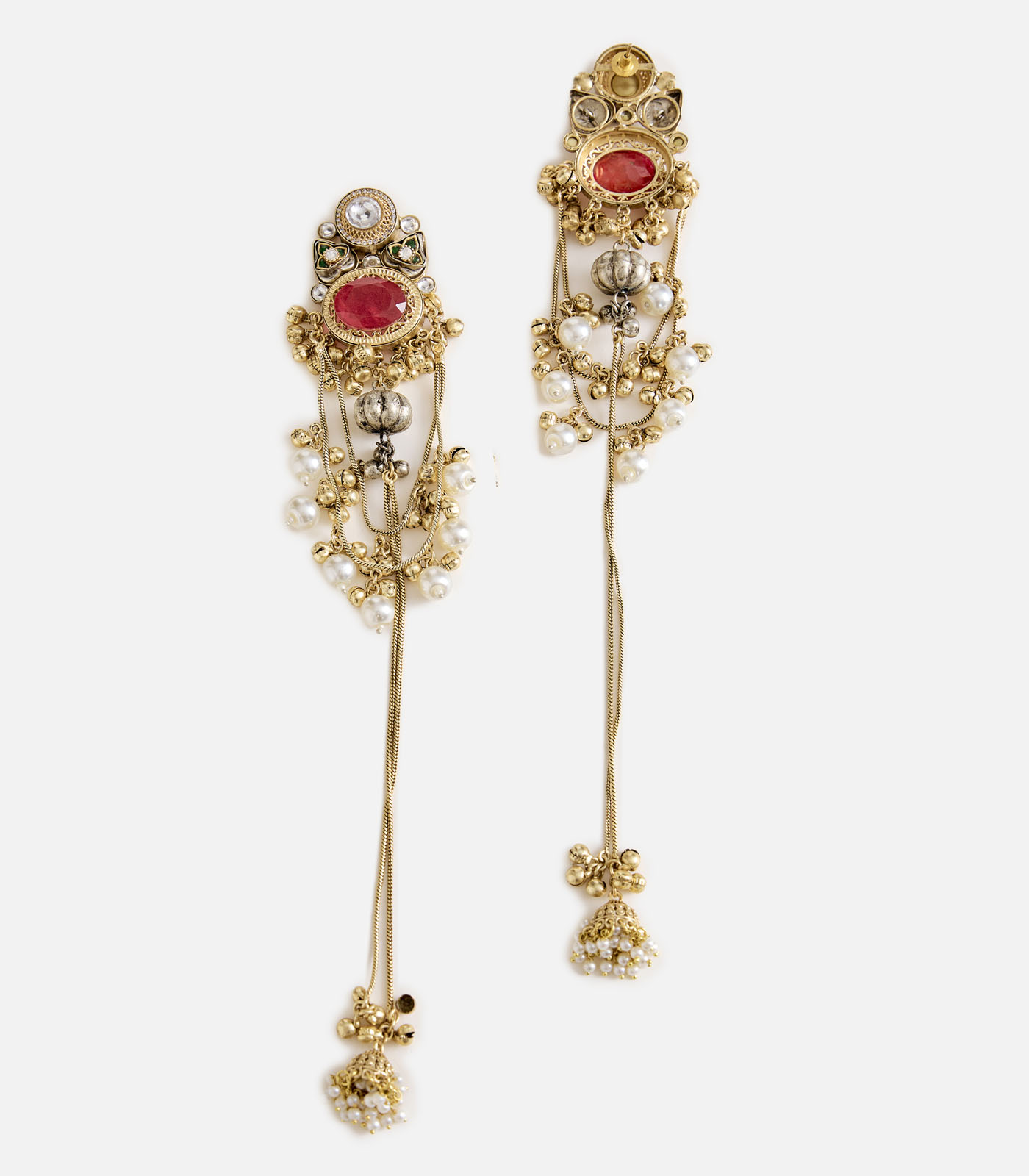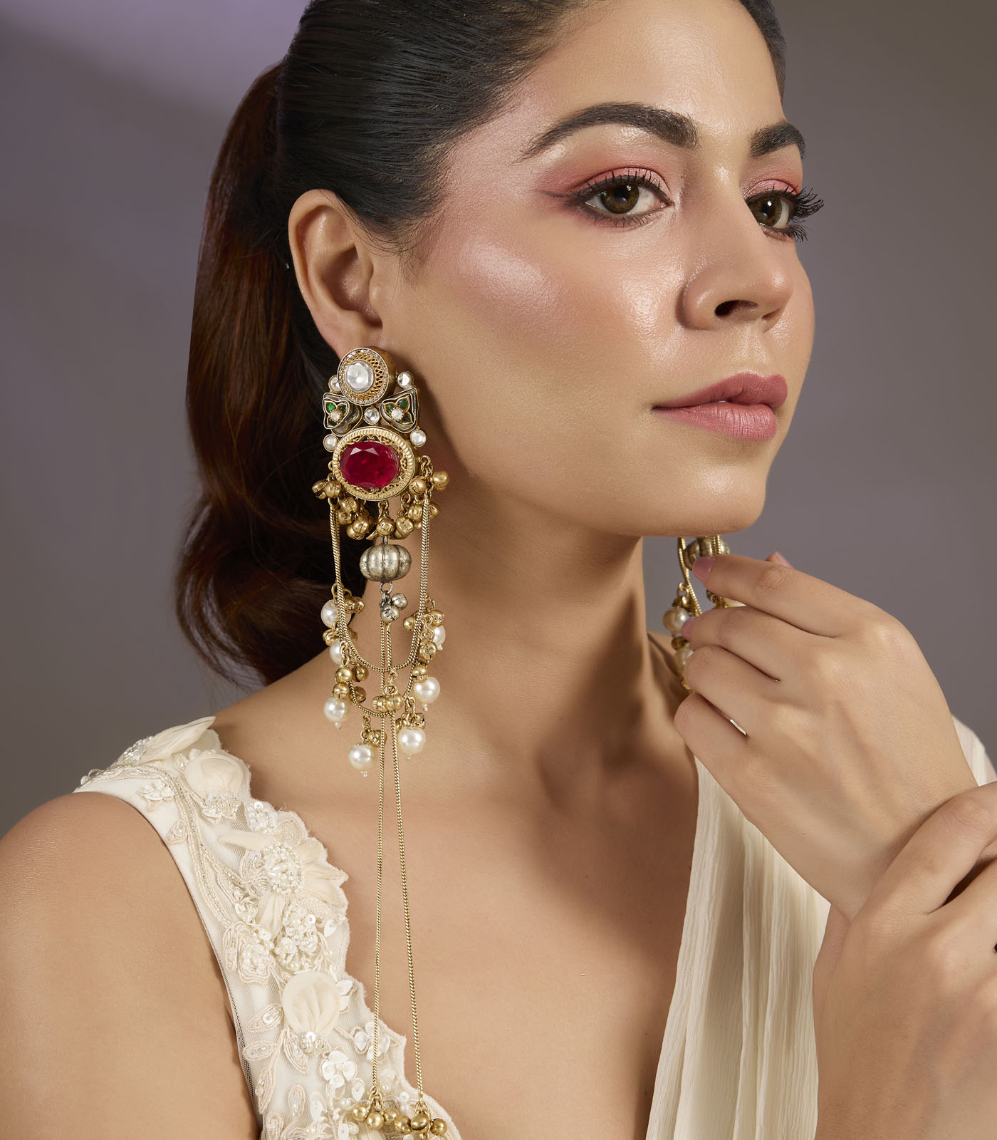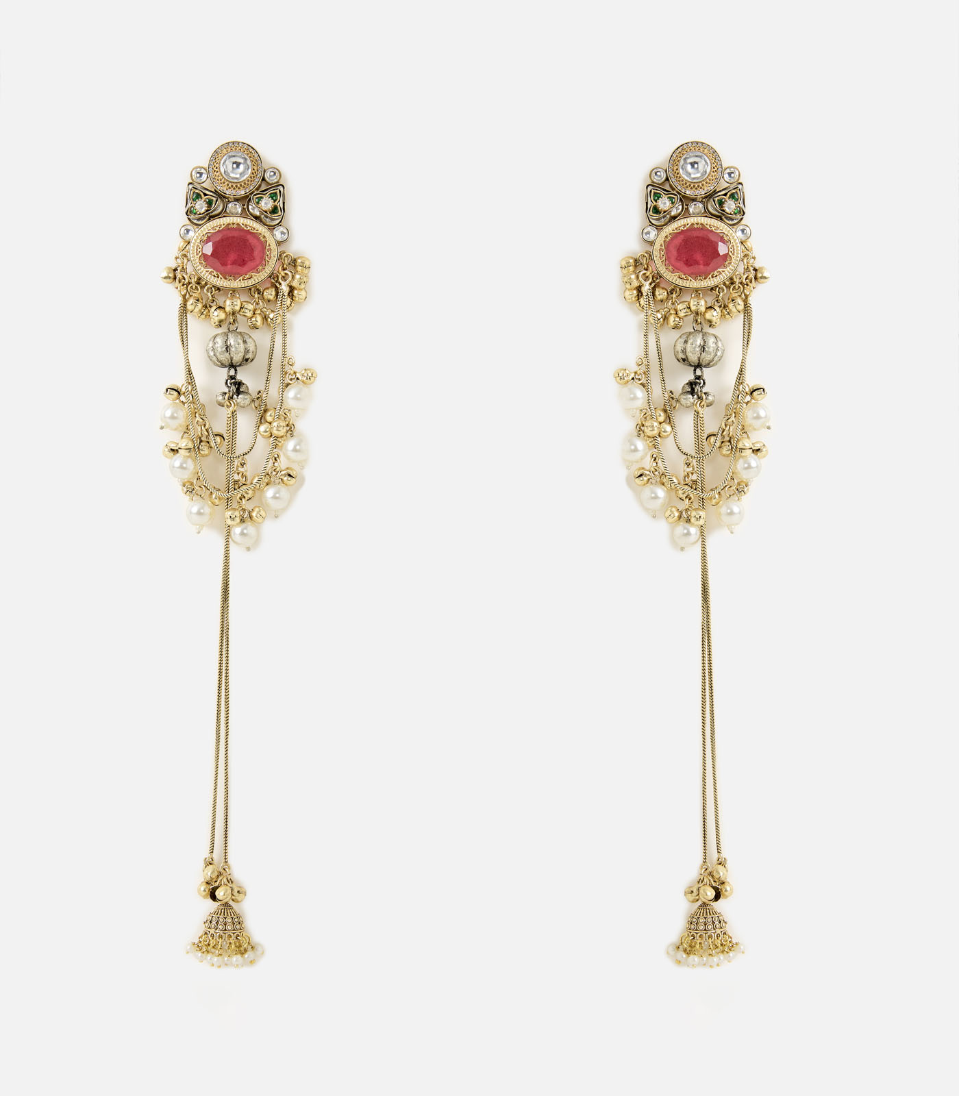 Elegant pearl drop kundan statement earrings with pink stone detailing and cascading chains. A dramatic and regal accessory, perfect for weddings, festive occasions, and bridal looks.