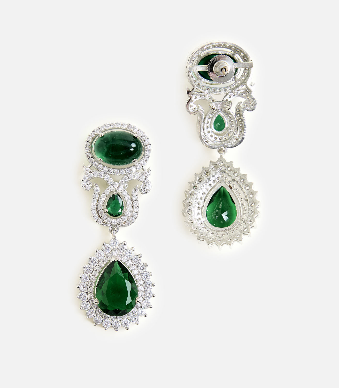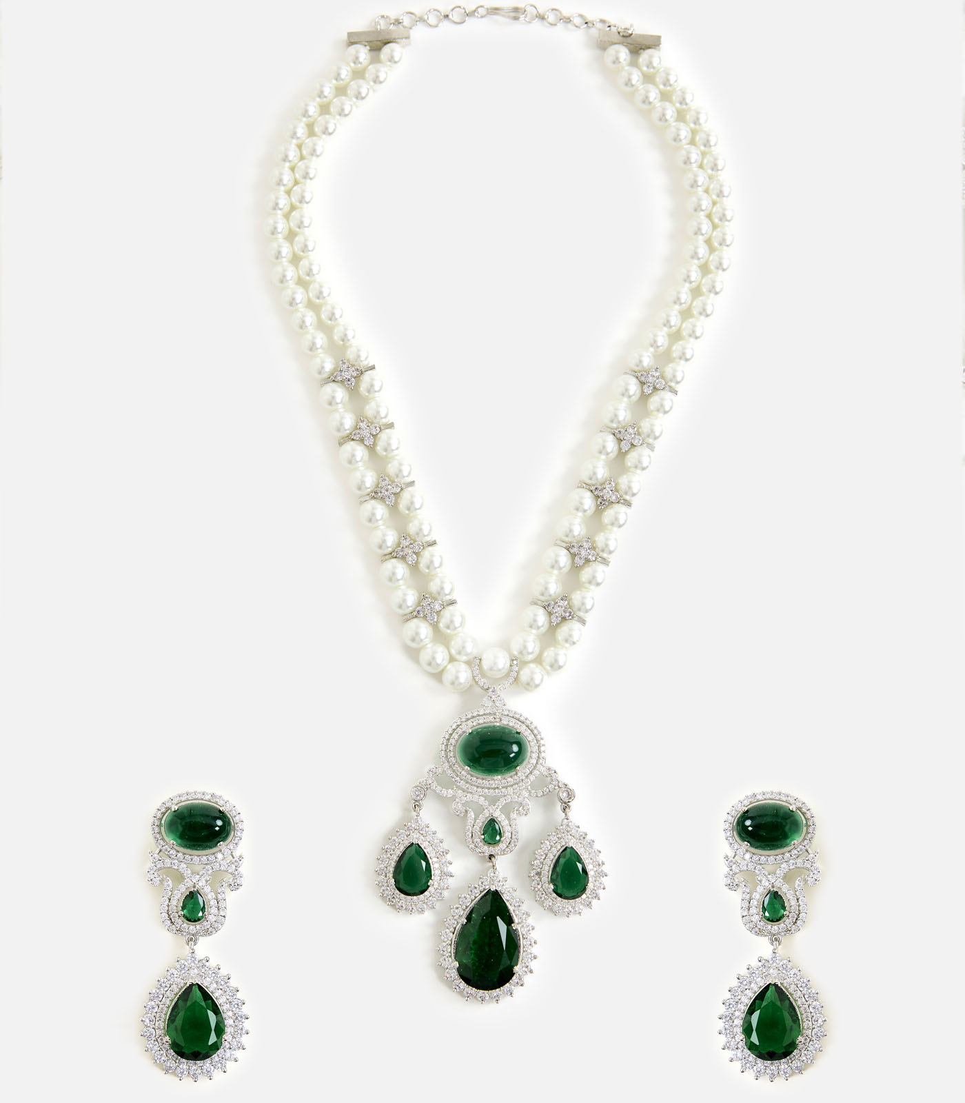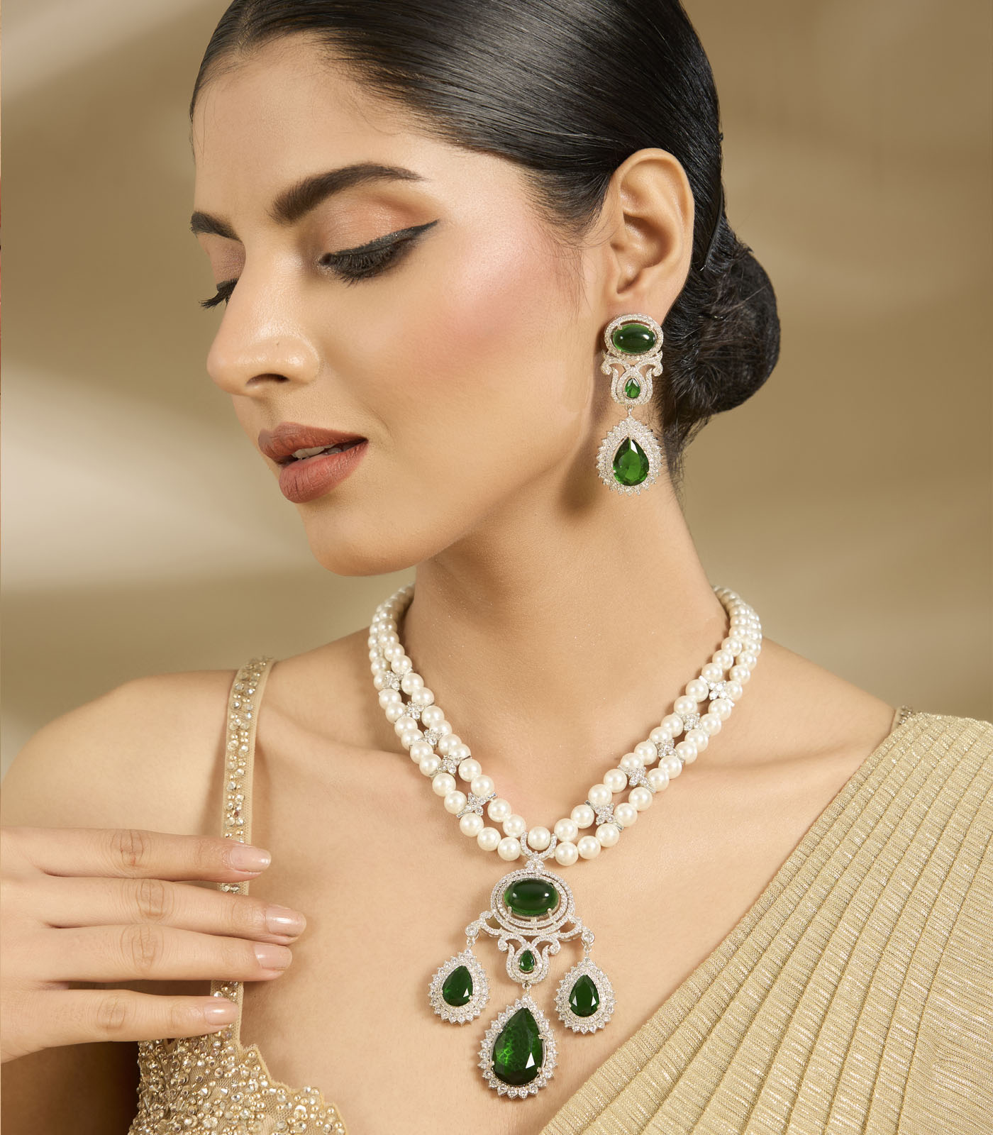 A graceful pearl and green stone necklace set featuring a layered design with matching earrings. Perfect for weddings, festive occasions, and parties, adding timeless elegance to any attire.