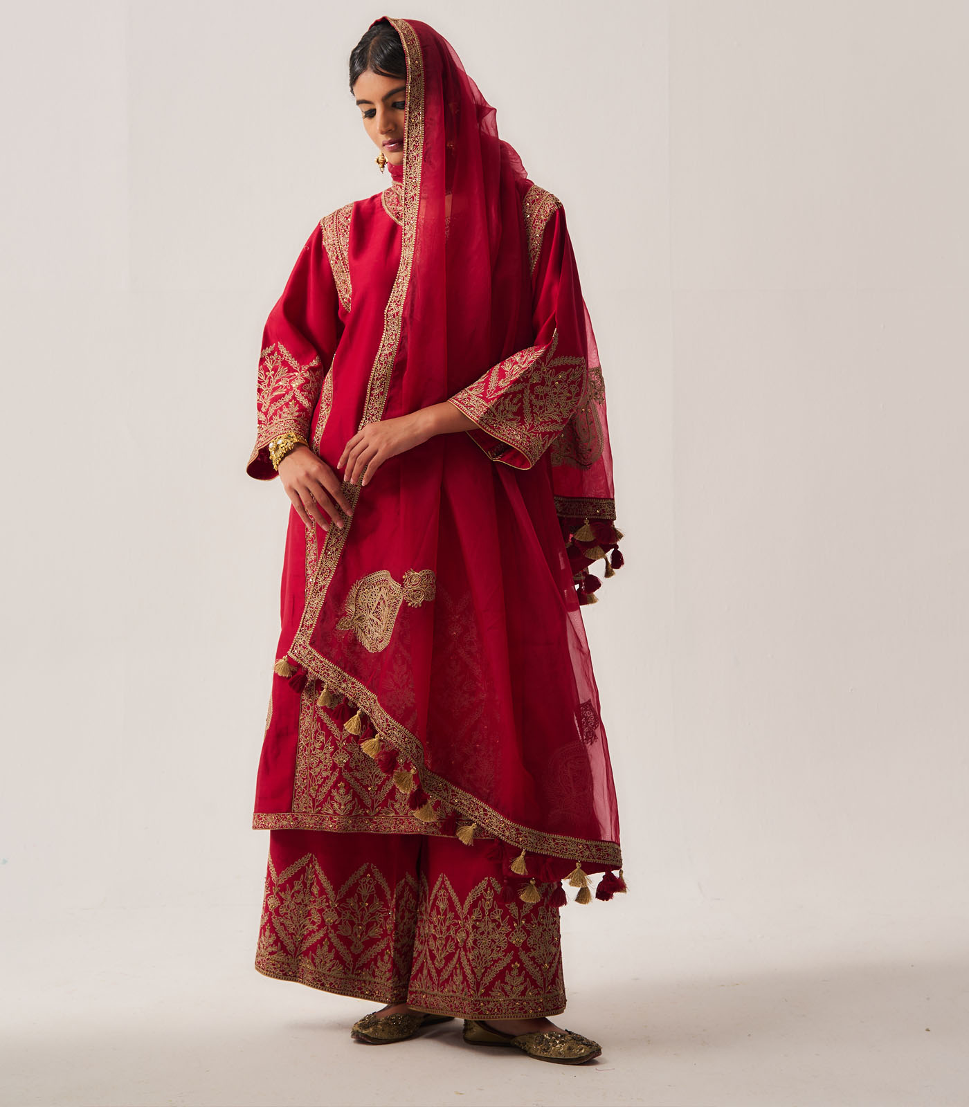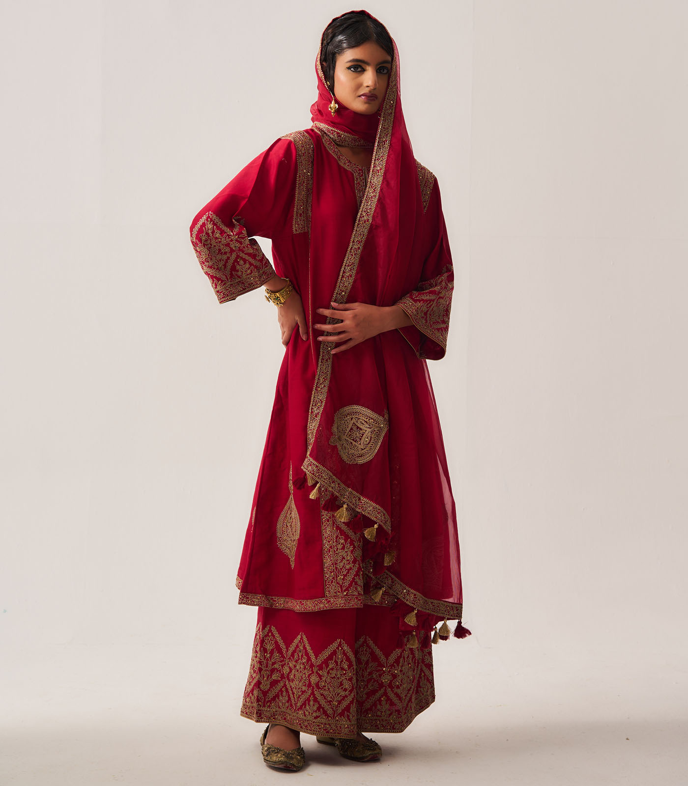 Phiran Kurta with Flare Pants and Dupatta / Chanderi / Deep Red / Floral Nest / Aari/Hand Embroidery