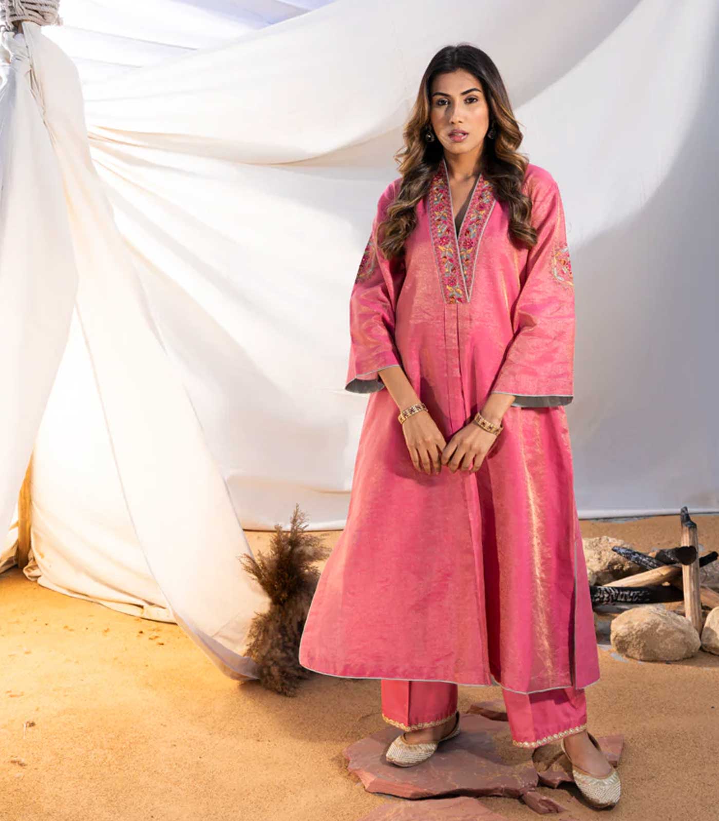 The V neckline is a masterpiece, crafted through the intersection of intricately embroidered borders, featuring the gleam of gold zari and the soft sheen of silk threads. Drawing inspiration from Suzani motifs, each stitch weaves a story of cultural richness and timeless allure.