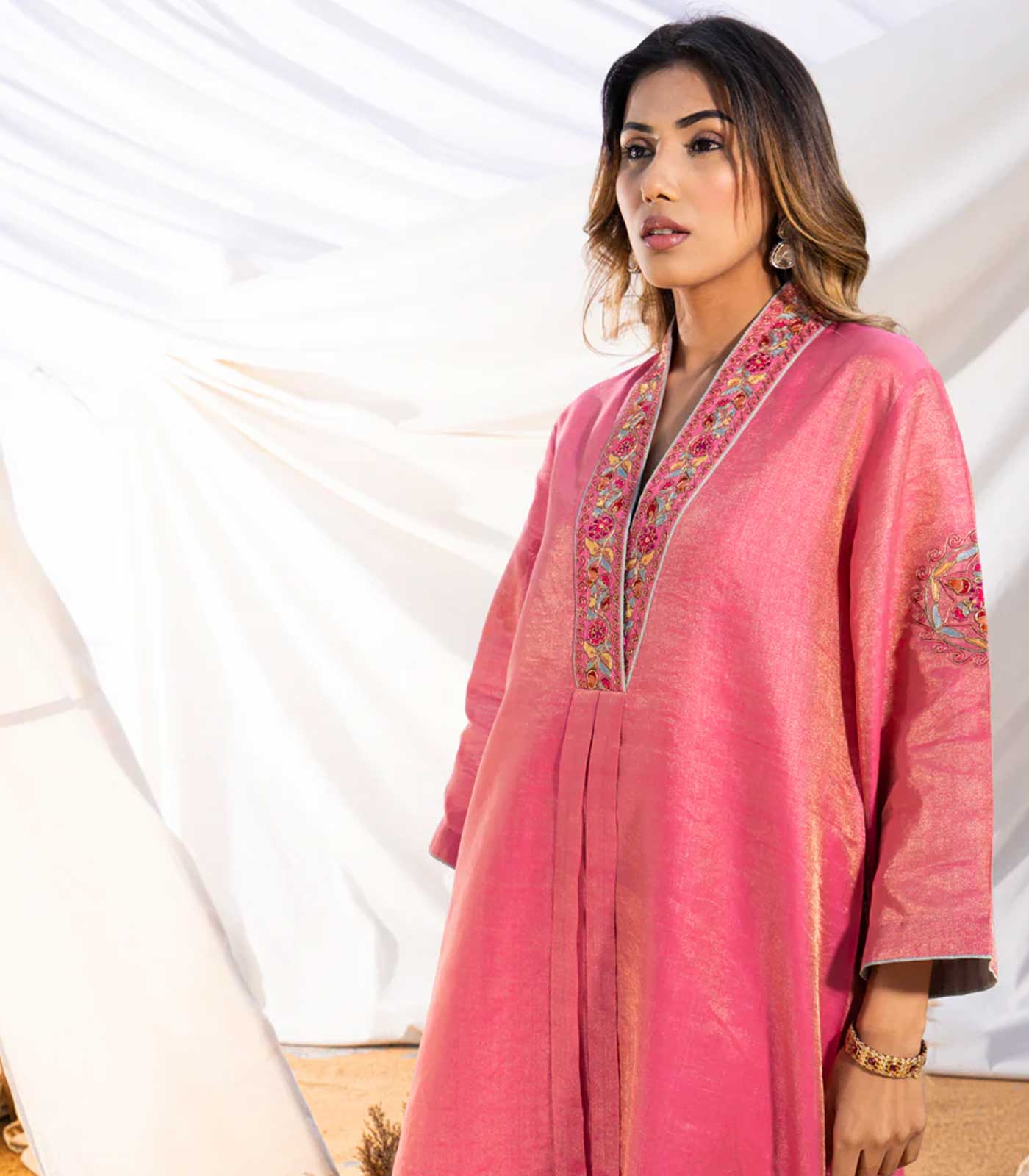 Paired seamlessly with glazed cotton pants featuring a gold-embroidered border.