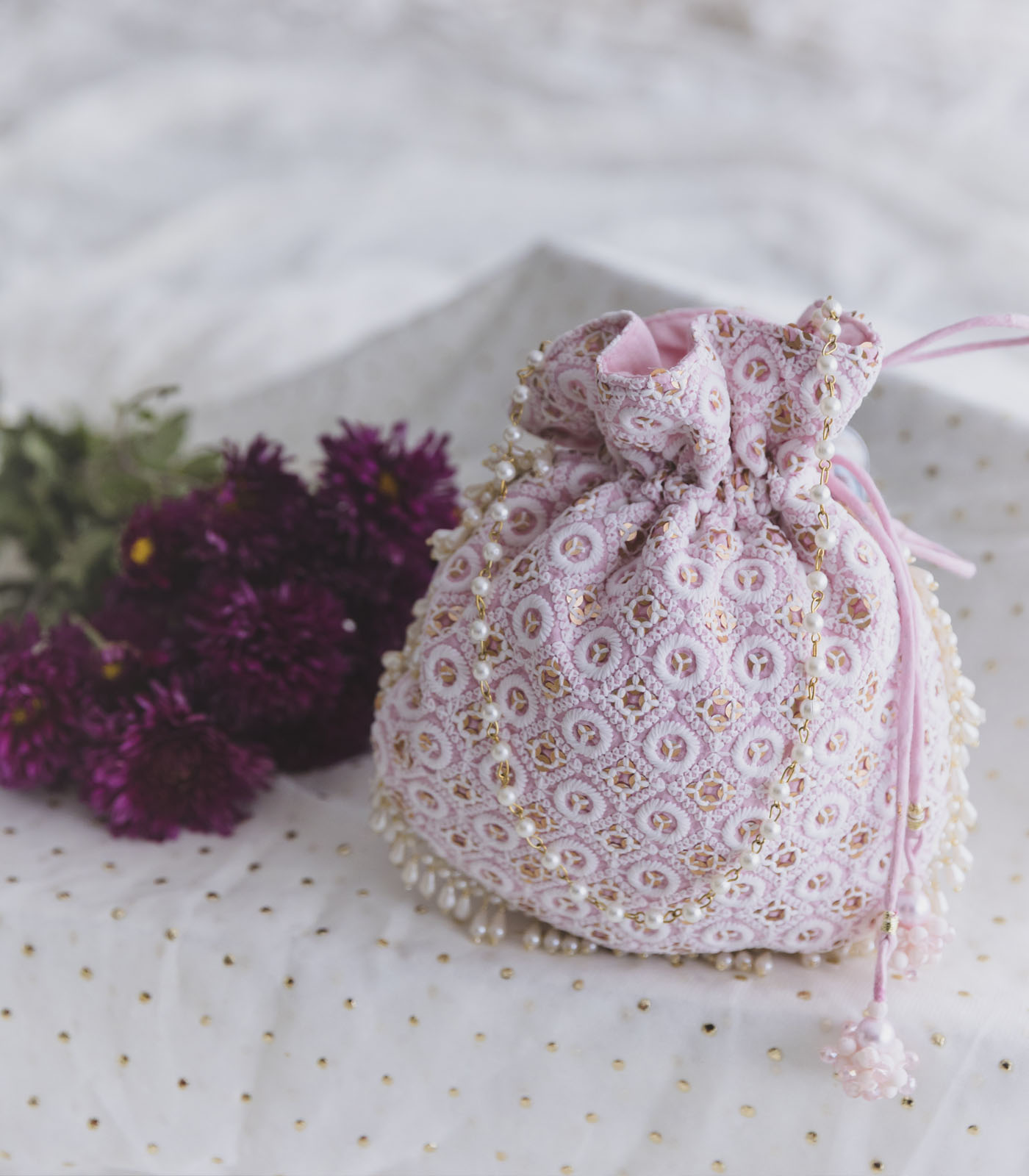 - Ornated with delicate laces and pearl hanging.