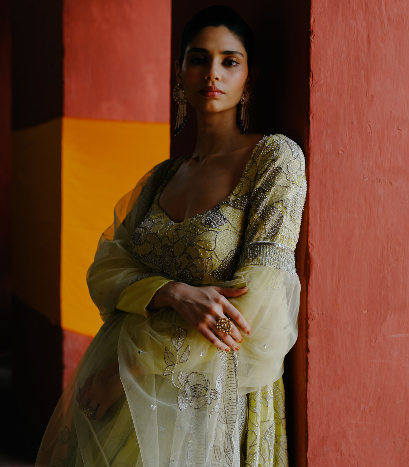 The Primrose Anarkali features exquisitely hand-embroidered zardozi, pearls, and threadwork, complemented by its soft and airy silhouette, imparting an elegant and feminine look. Alongside its beautiful embroidery, its striking color elevatinng its look.