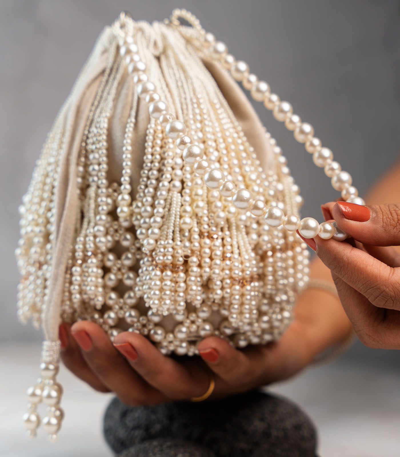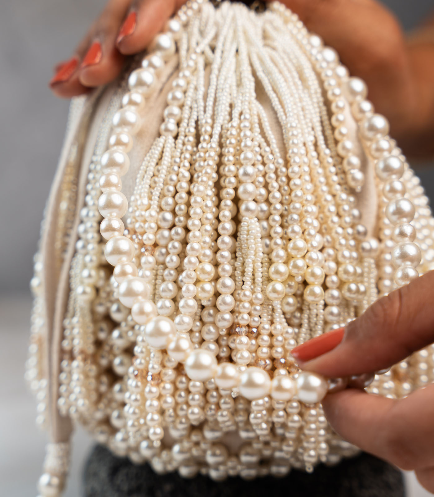 This tasseled potli is a stunning blend of elegance and craftsmanship, featuring lustrous beads and intricate work in a pearl palette. Finished with delicate tassels, it’s the perfect accessory for weddings, festive events, or evening soirées.