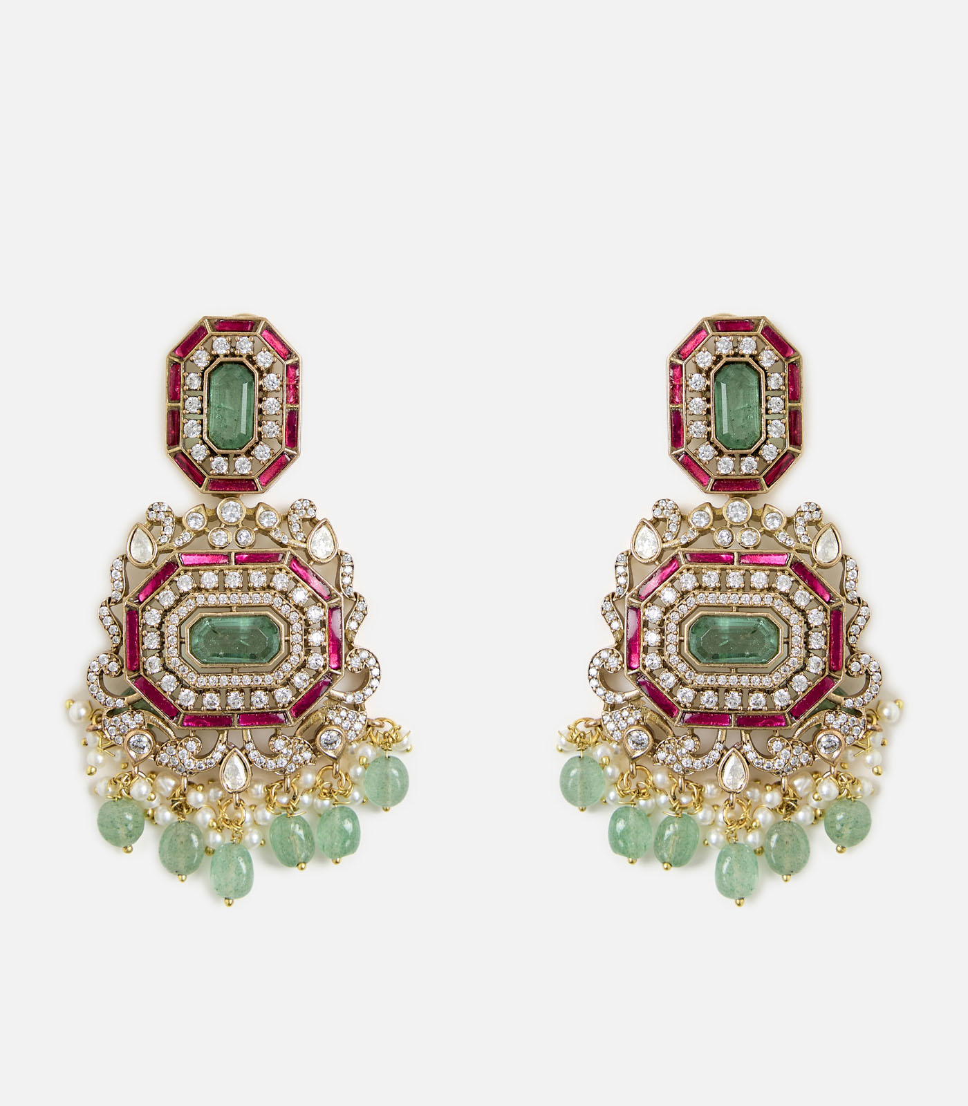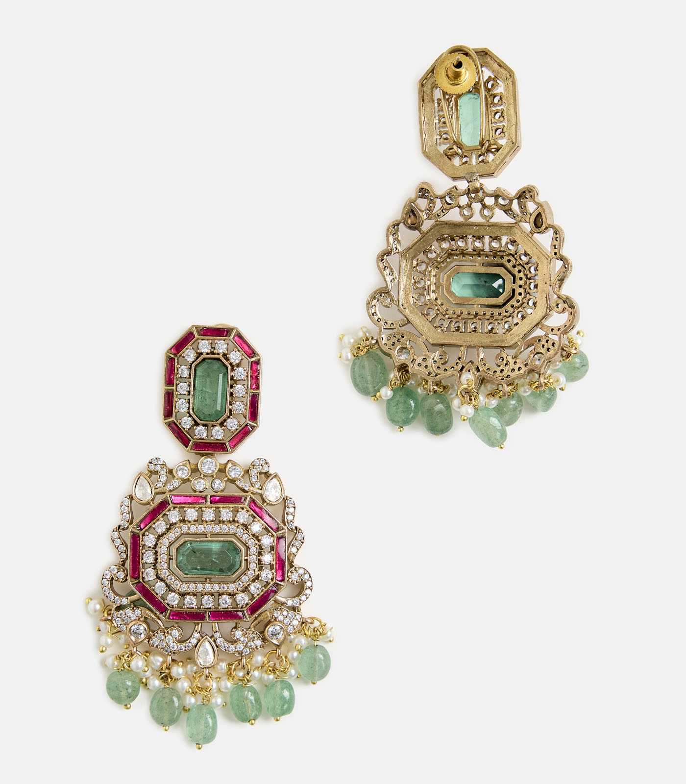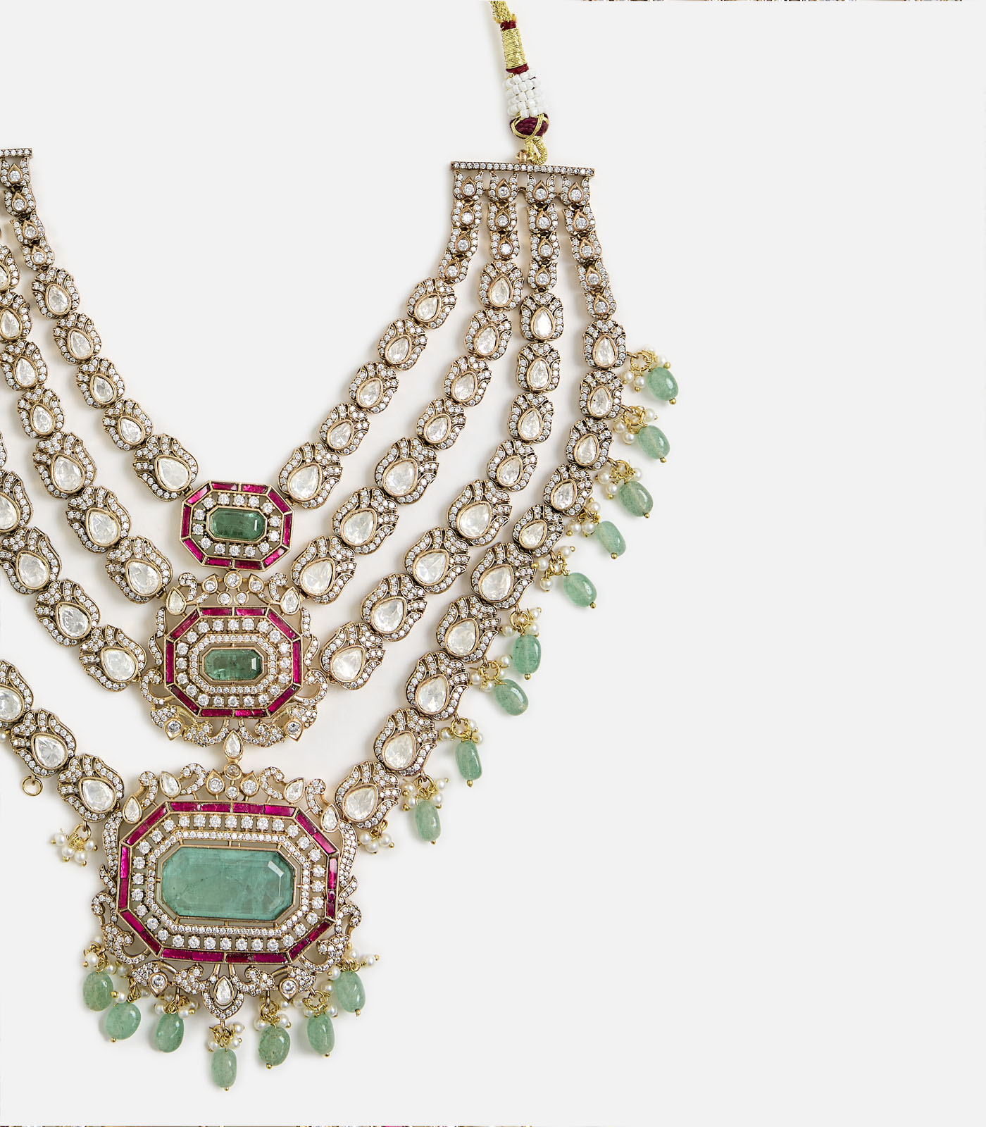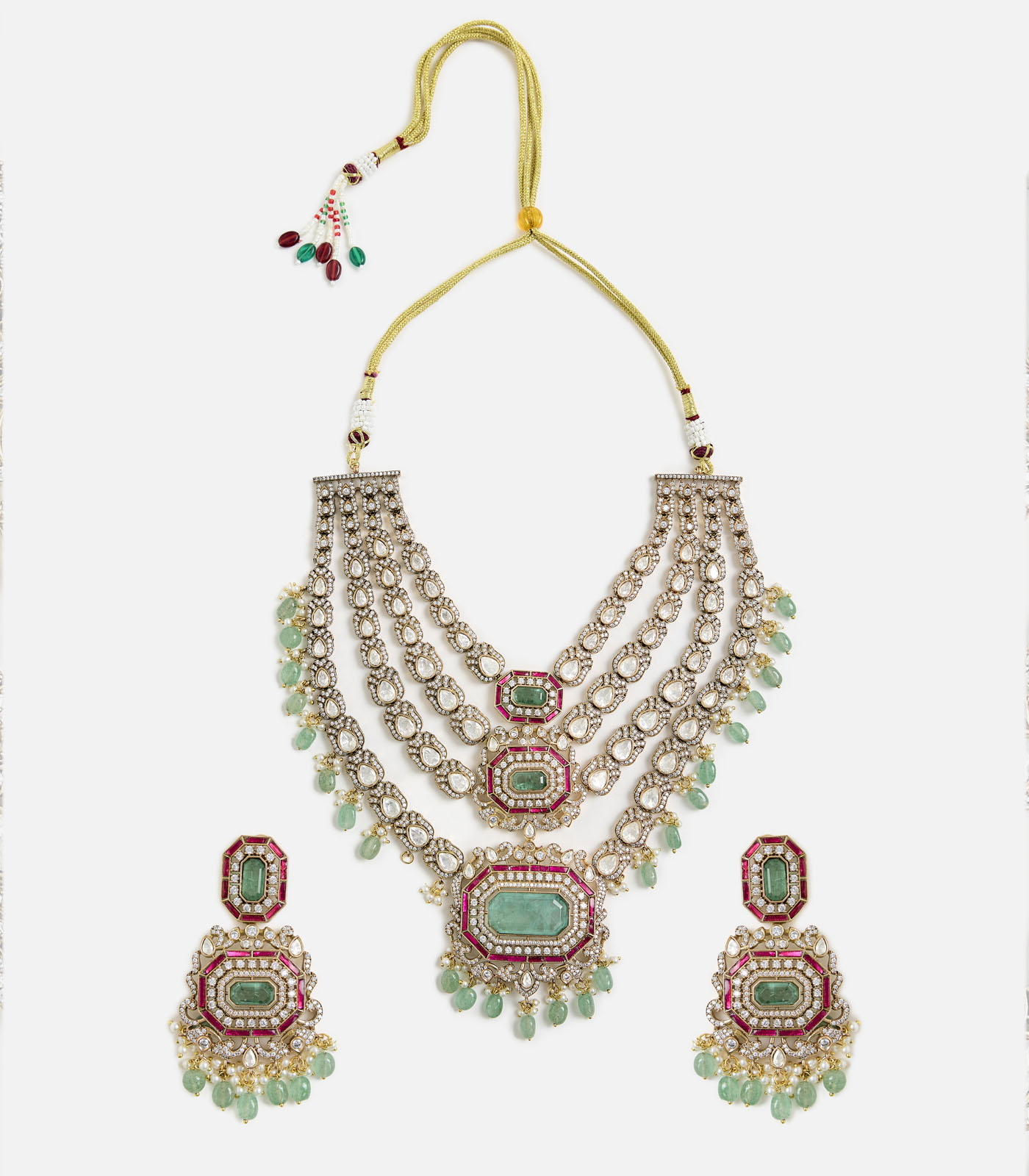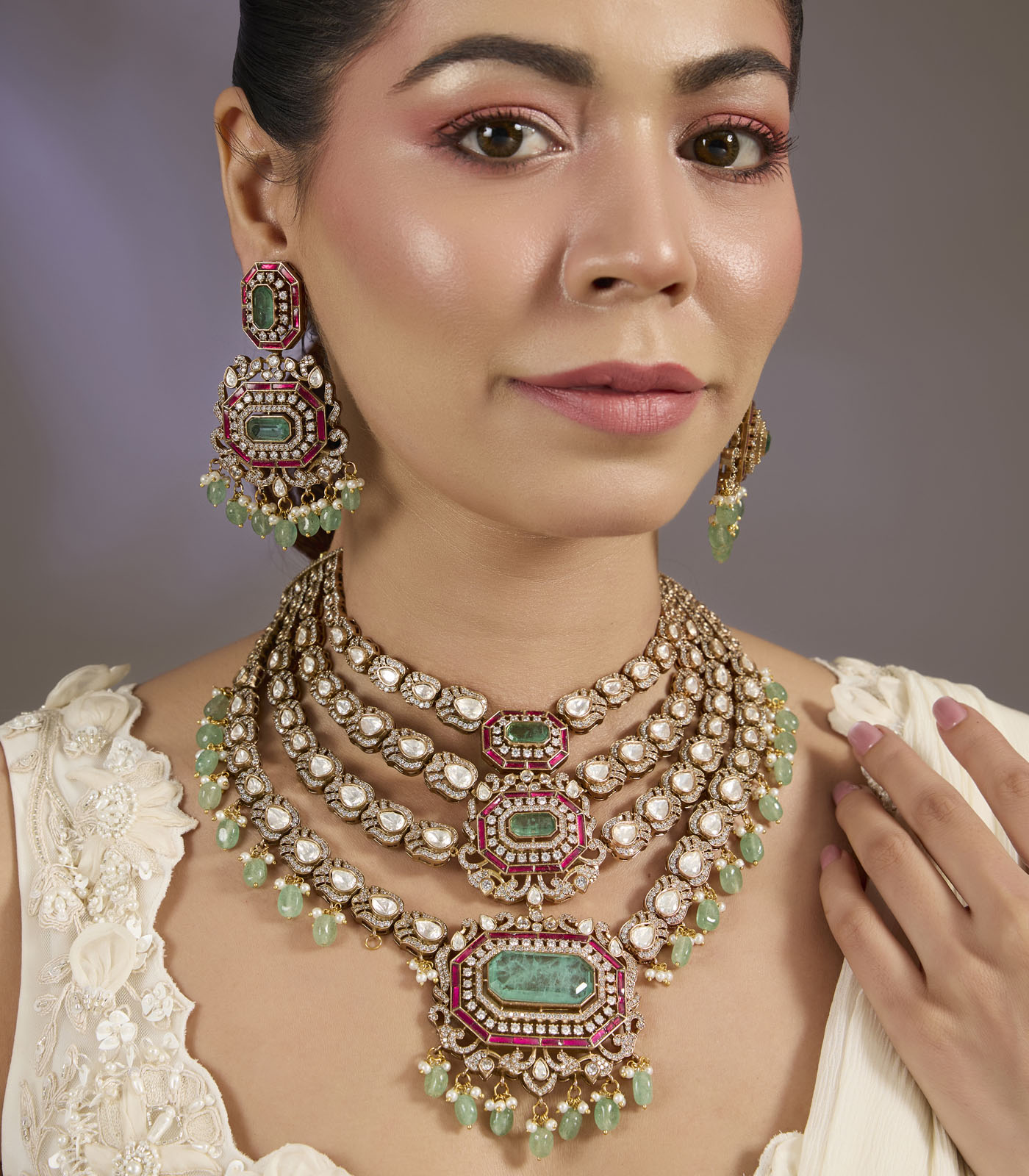 Elevate your style with this regal Kundan & emerald statement Necklace Set. Featuring intricate detailing and bold design, it adds luxury and charm, making it perfect for weddings and festive occasions.