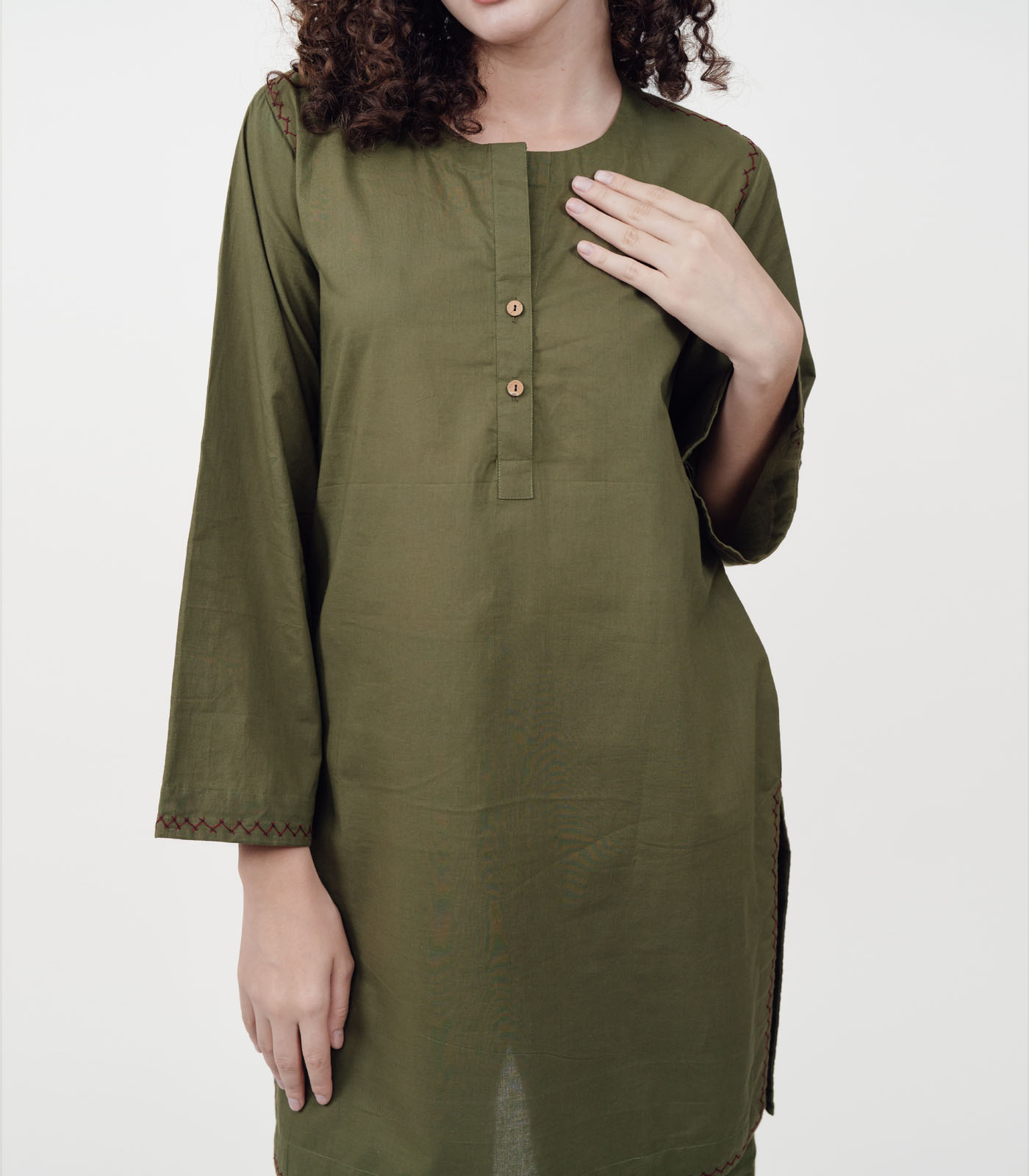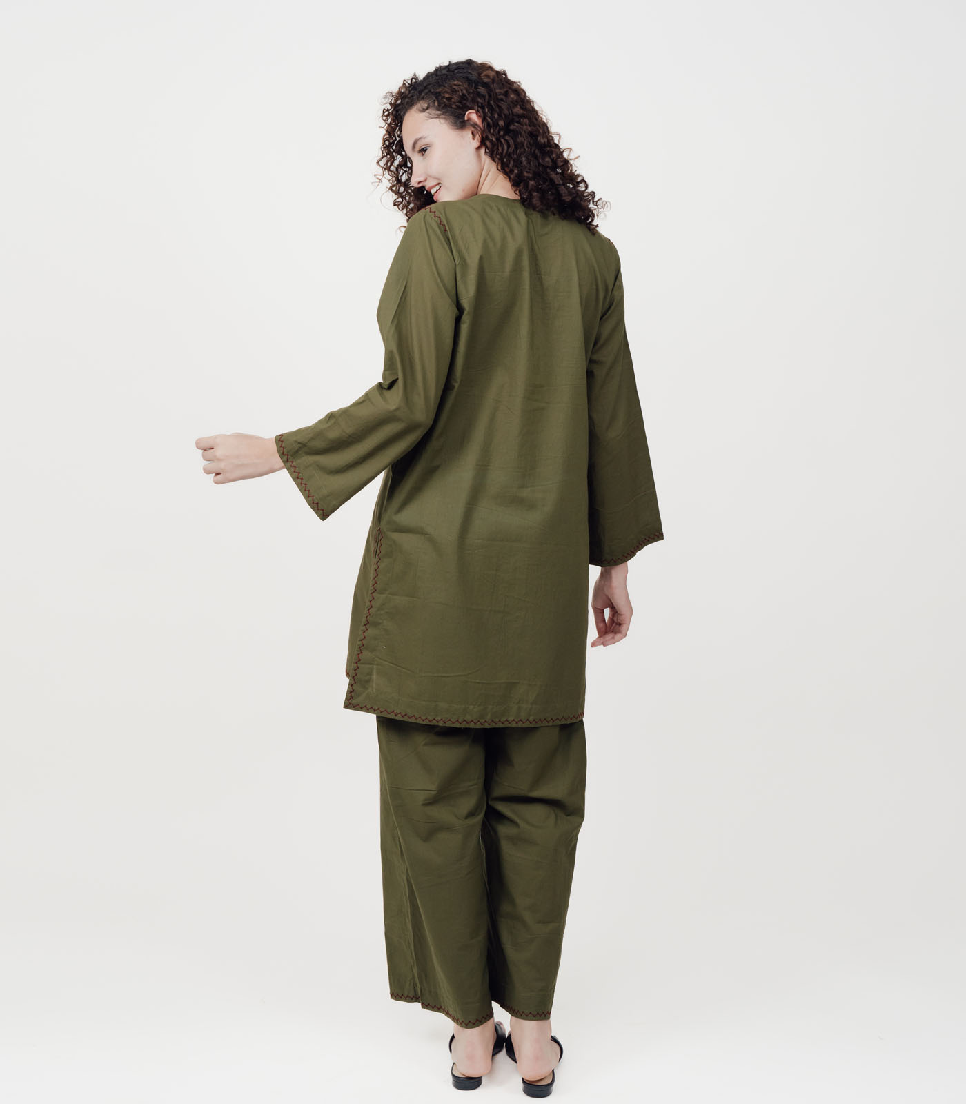 Crafted in lightweight and breathable pure cotton fabric, this Co-Ord set features a straight fit, long kurta adorned with minimal hand embroidery and button closure on neck- paired withrelaxed fit elasticated pajama bottom. This set is every wardrobe’s understated yet the OG essential, designed for ease and movement. It is perfect for days when you want to stay comfortable without compromising on style- a go to piece for work, travel or casual gatherings