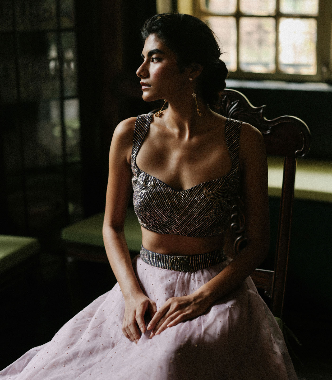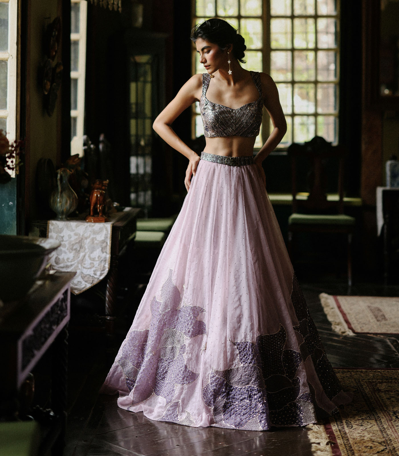 Our rosa patchwork lehenga set showcases beautifully hand-embroidered patchwork, enriched with antique gold work throughout. This unique piece is enhanced with our signature GK buckle, embodying an exquisite blend of traditional craftsmanship and modern elegance.
