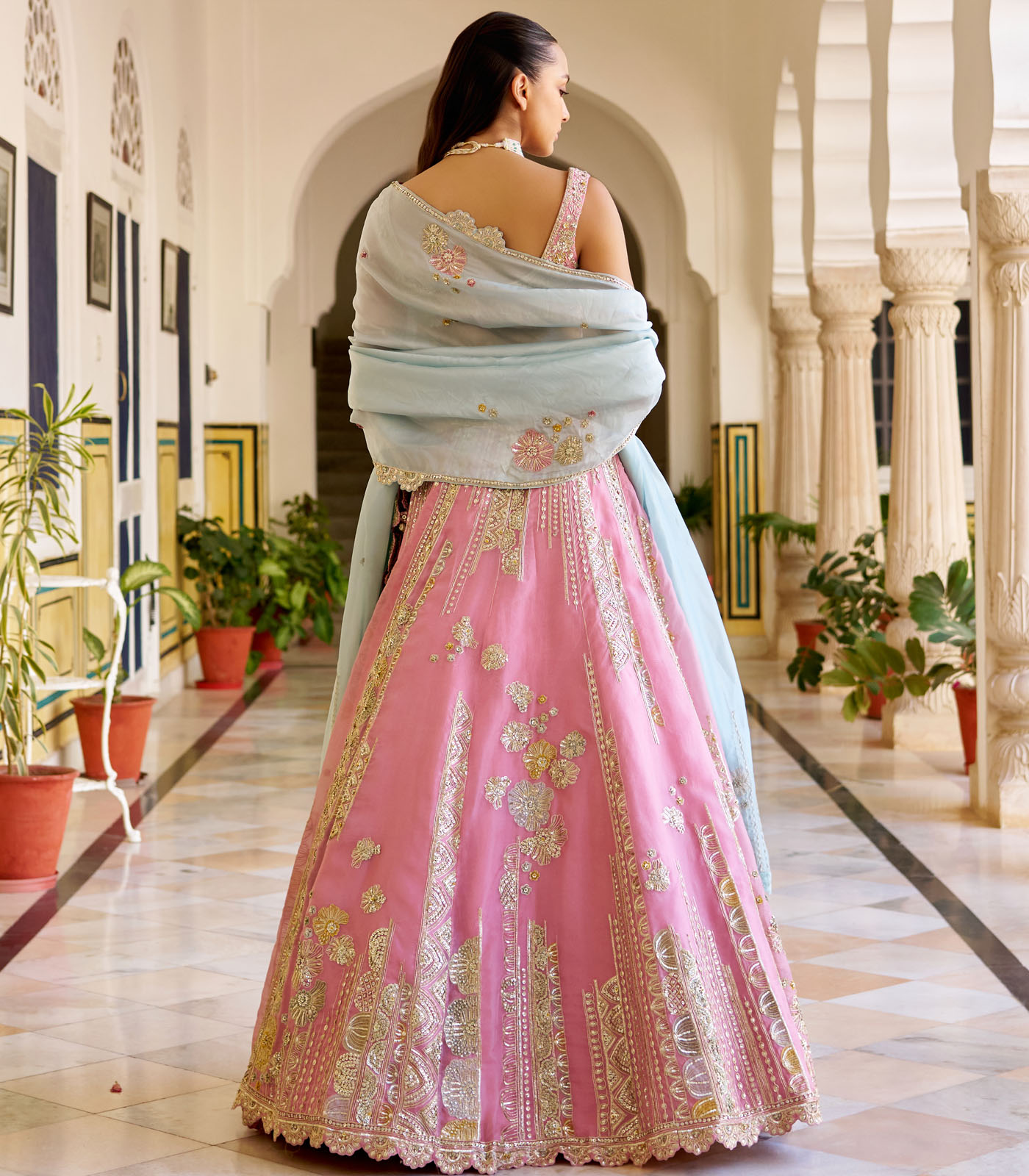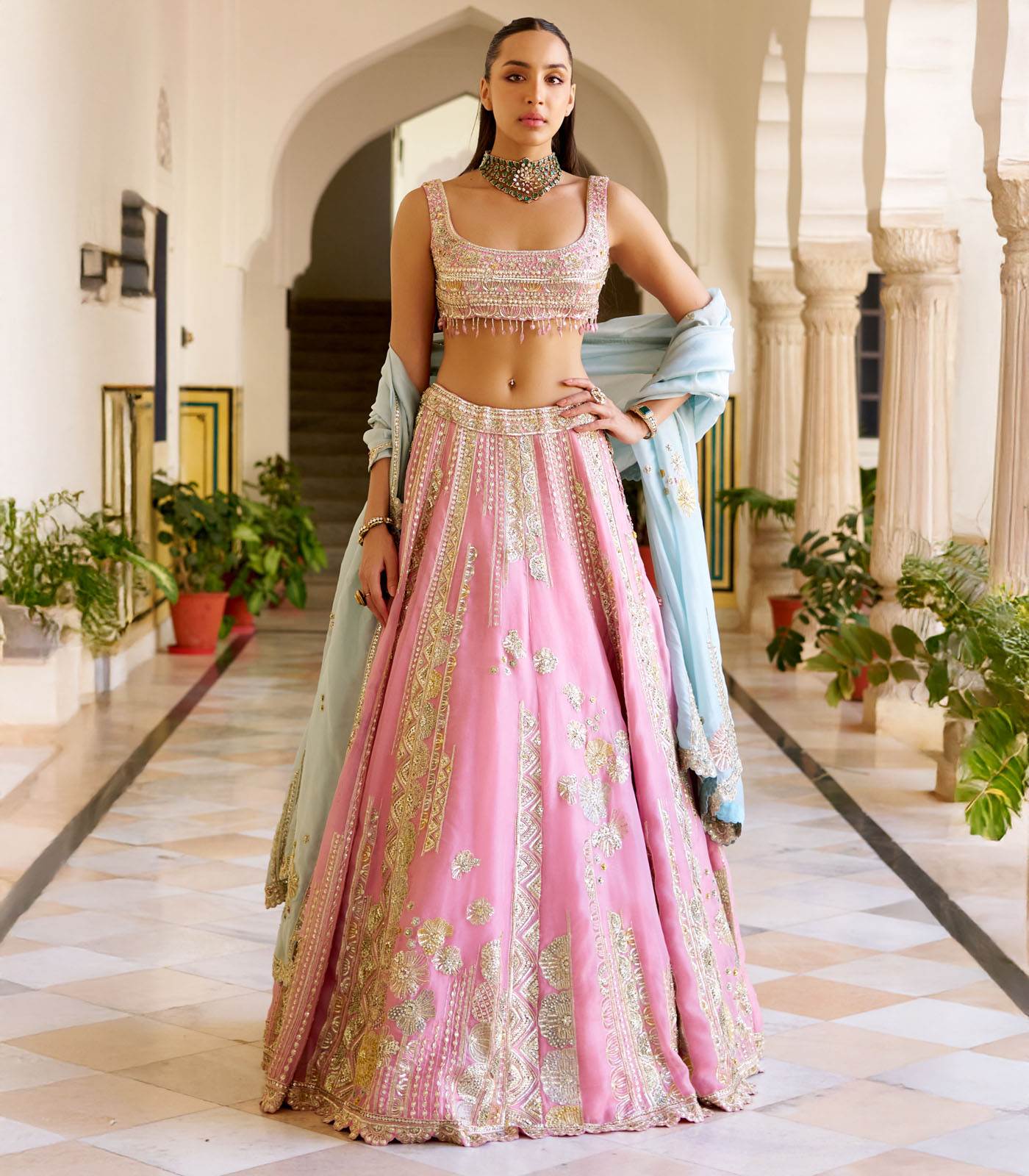 The rosaline pink lehenga set is handcrafted with zardozi, french knots, multi thread embroidery, with applique details