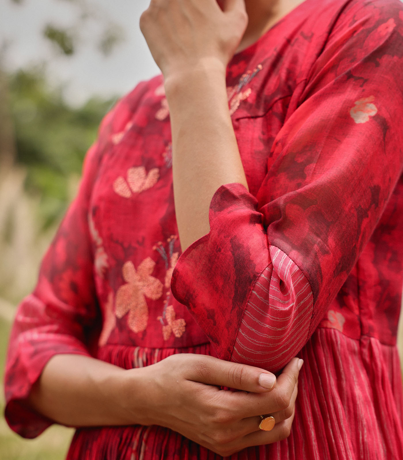 The Rosewood Embroidered Anarkali brings a soft burst of florals to your festive wardrobe. Printed blooms on the kurta and sleeves are elevated with delicate thread embroidery on the bodice, while gathered panels create a flowy, graceful silhouette. It is paired with a matching dupatta, finished with striped borders and signature tassels, offering an effortlessly elegant festive look.