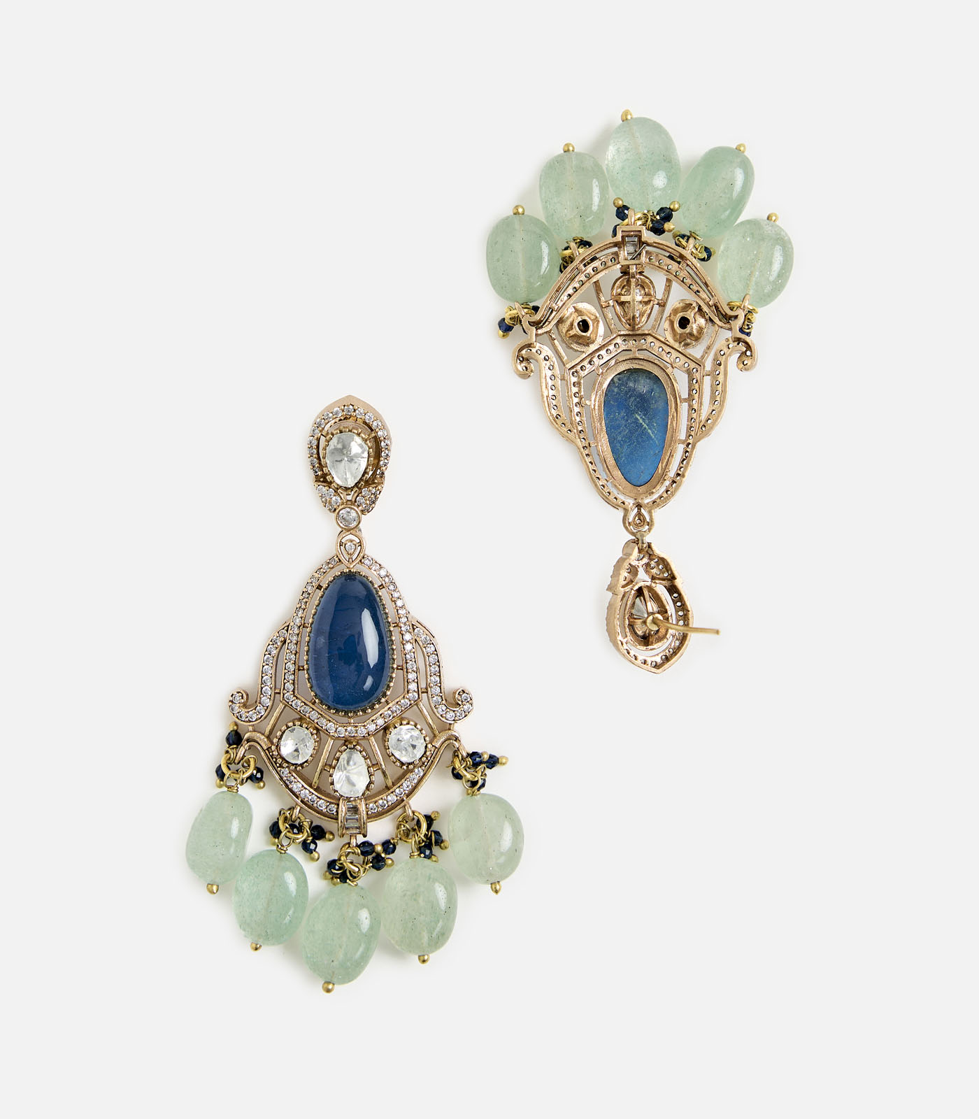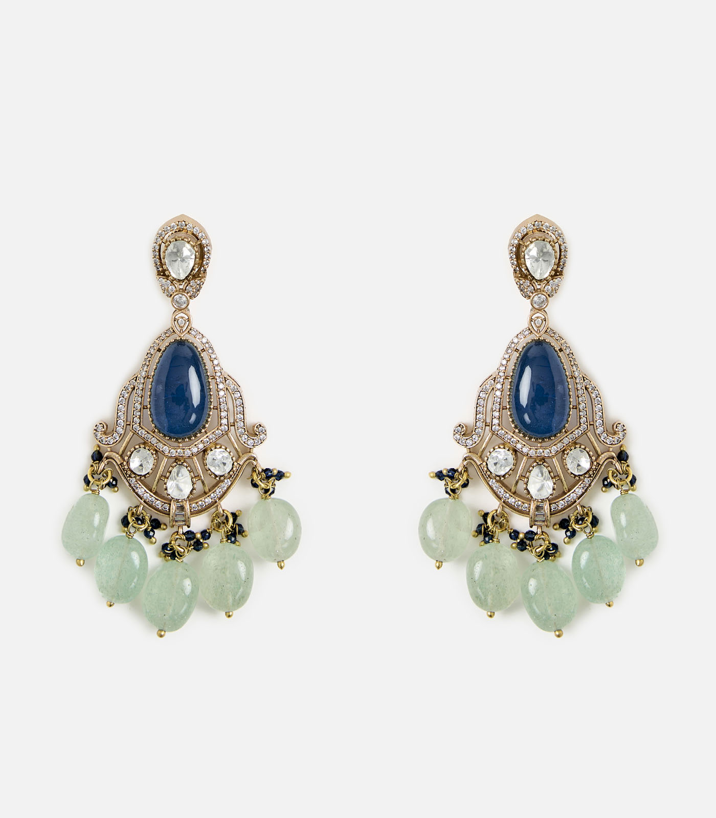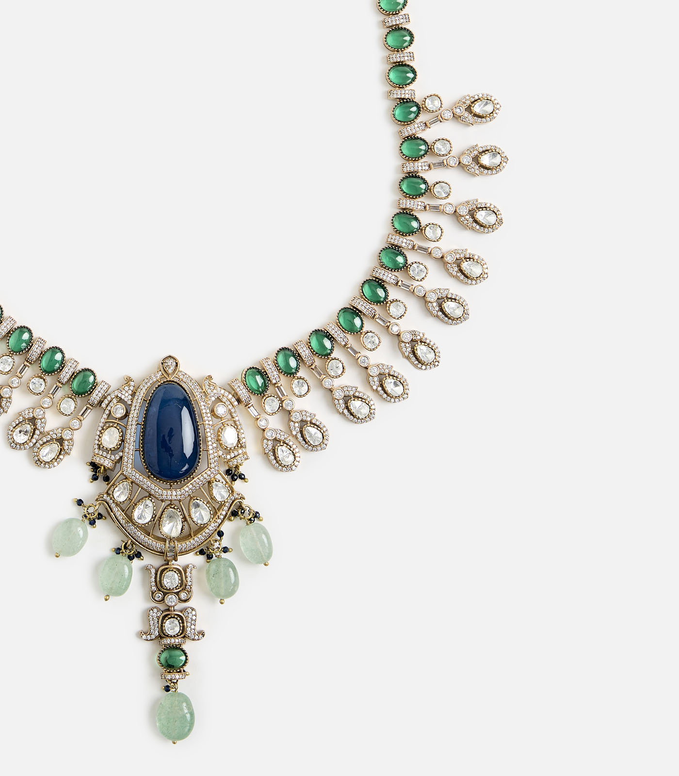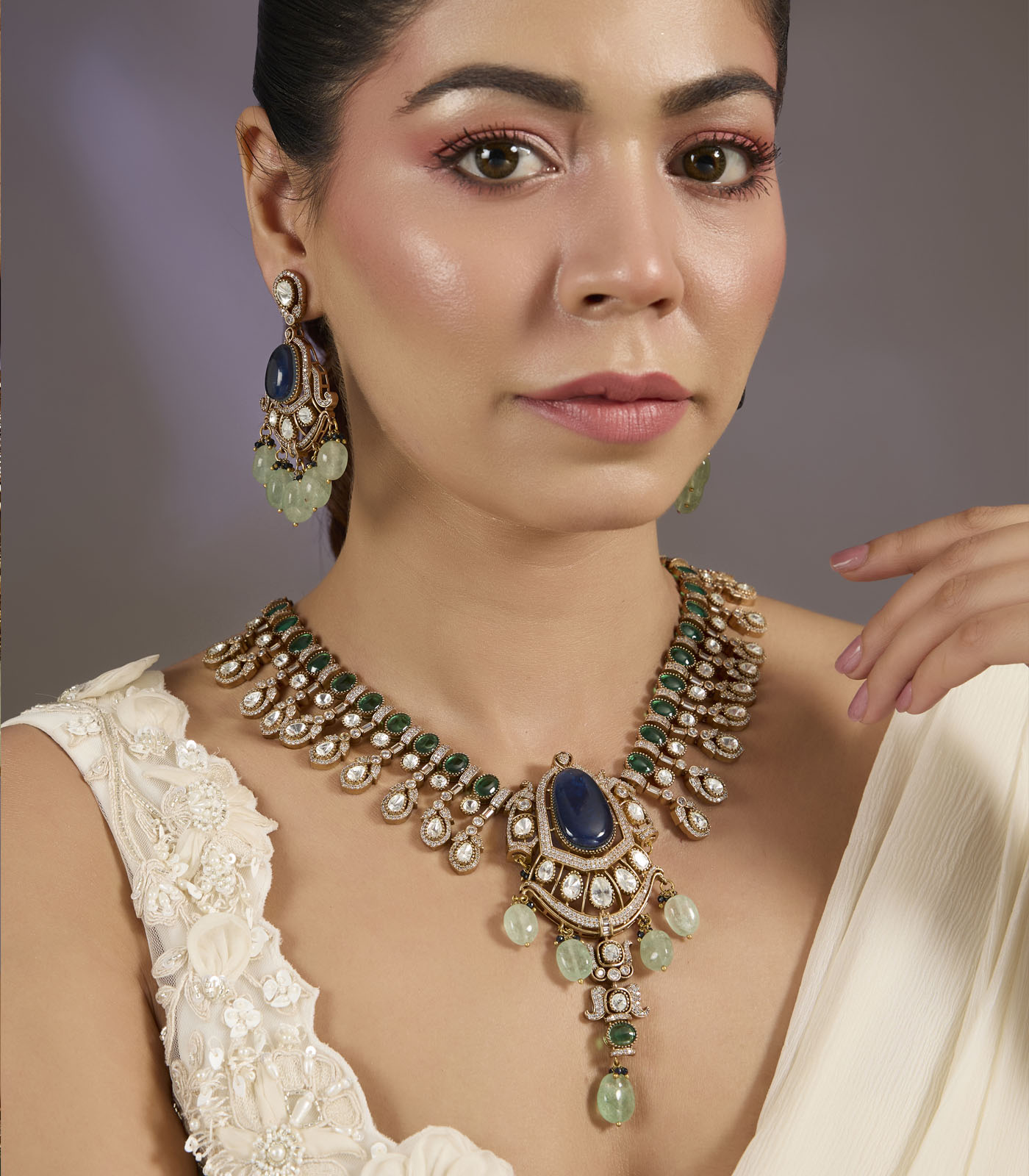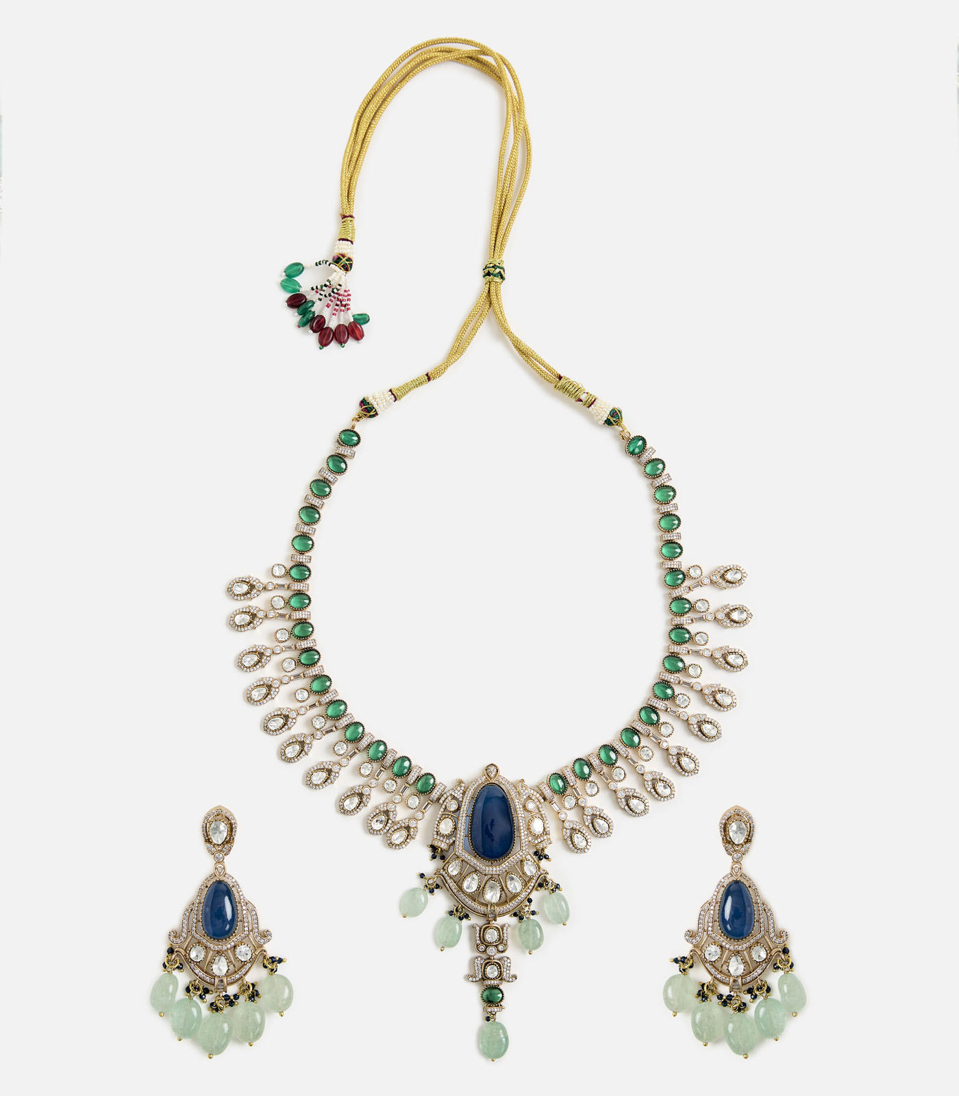 Royal Blue Stone & Green Beaded Kundan Necklace Set