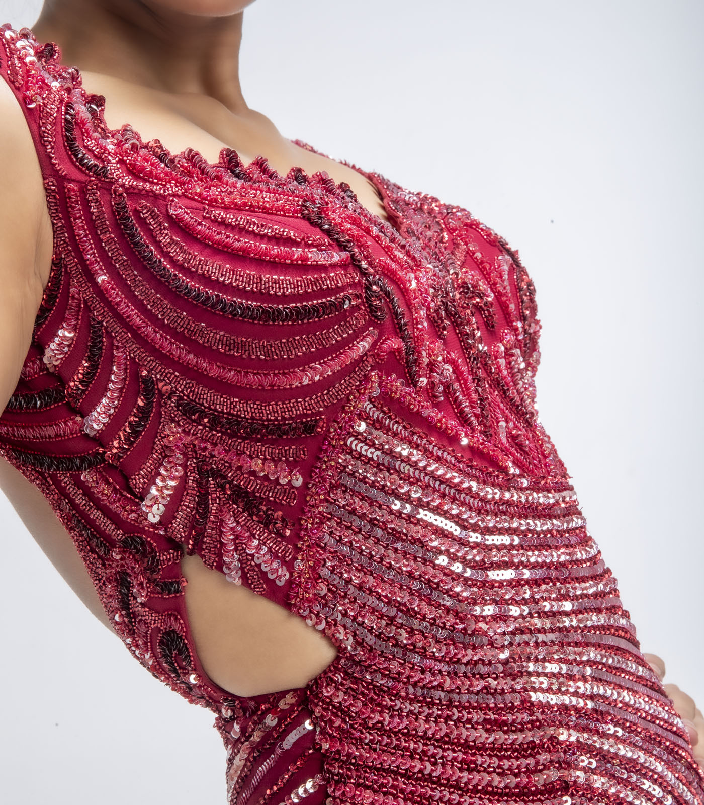 Featuring a ruby red gown in pure silk georgette base with cutdana, sequins and moti embellishment. Accentuate it with statement jewellery, a clutch and block heels for evening soirees or cocktail parties.