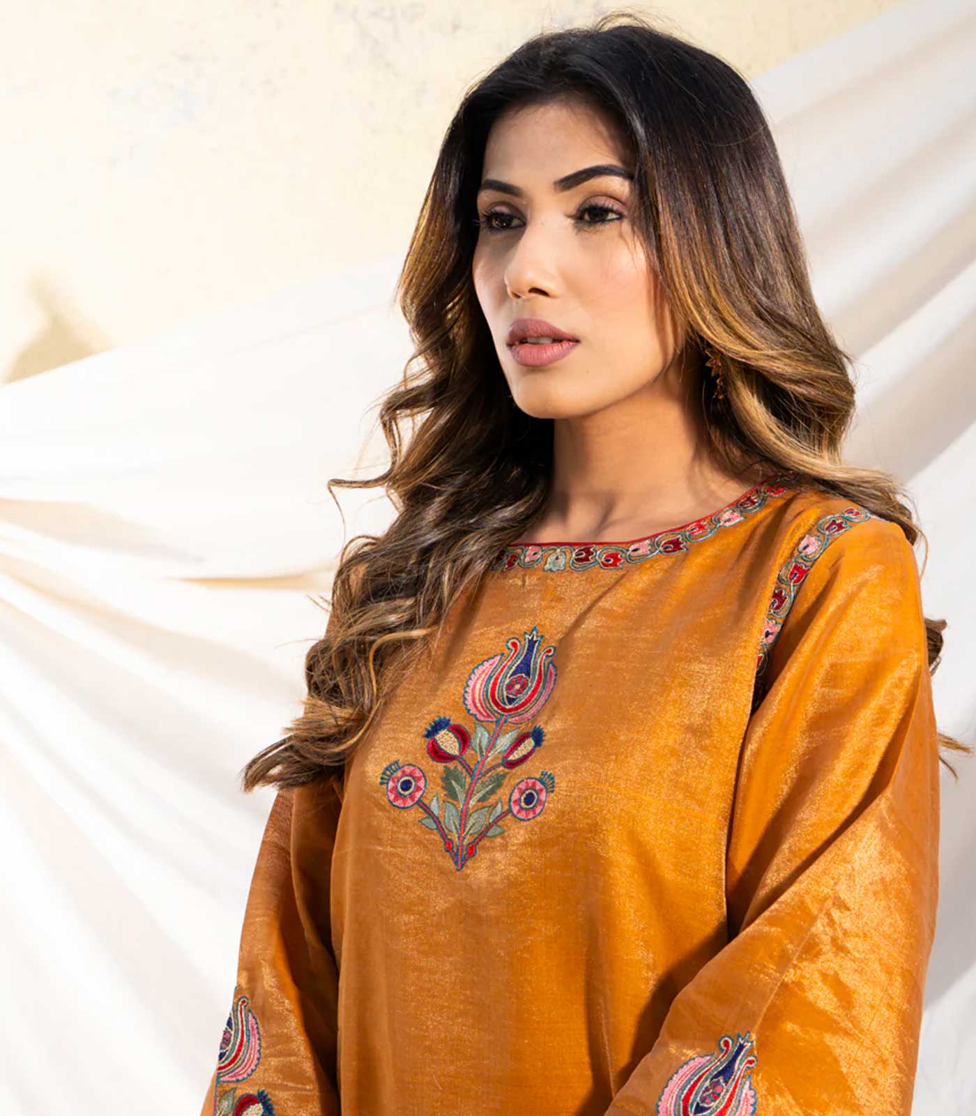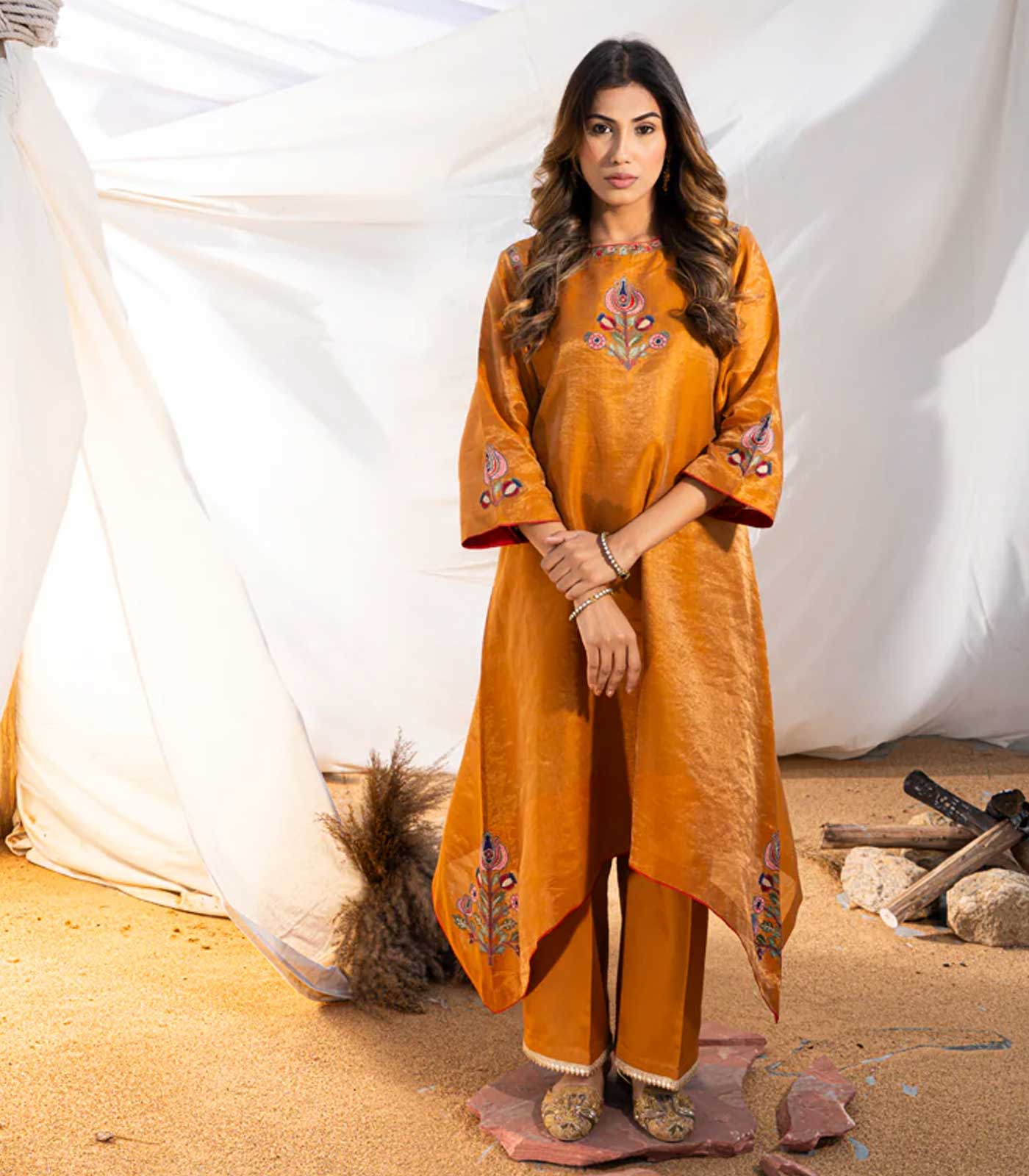 Embroidered motifs grace the corners of the asymmetrical hemline, each stitch meticulously crafted with gold zari and silk threads. The inspiration drawn from Suzani motifs weaves cultural richness into the fabric. Intricate embroidery also adorns the neckline and armholes, adding an extra layer of elegance.Paired seamlessly with glazed cotton pants featuring a gold-embroidered border, this ensemble embodies a perfect balance of tradition and modernity.