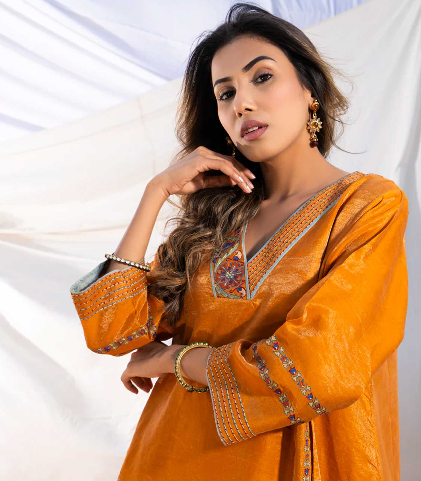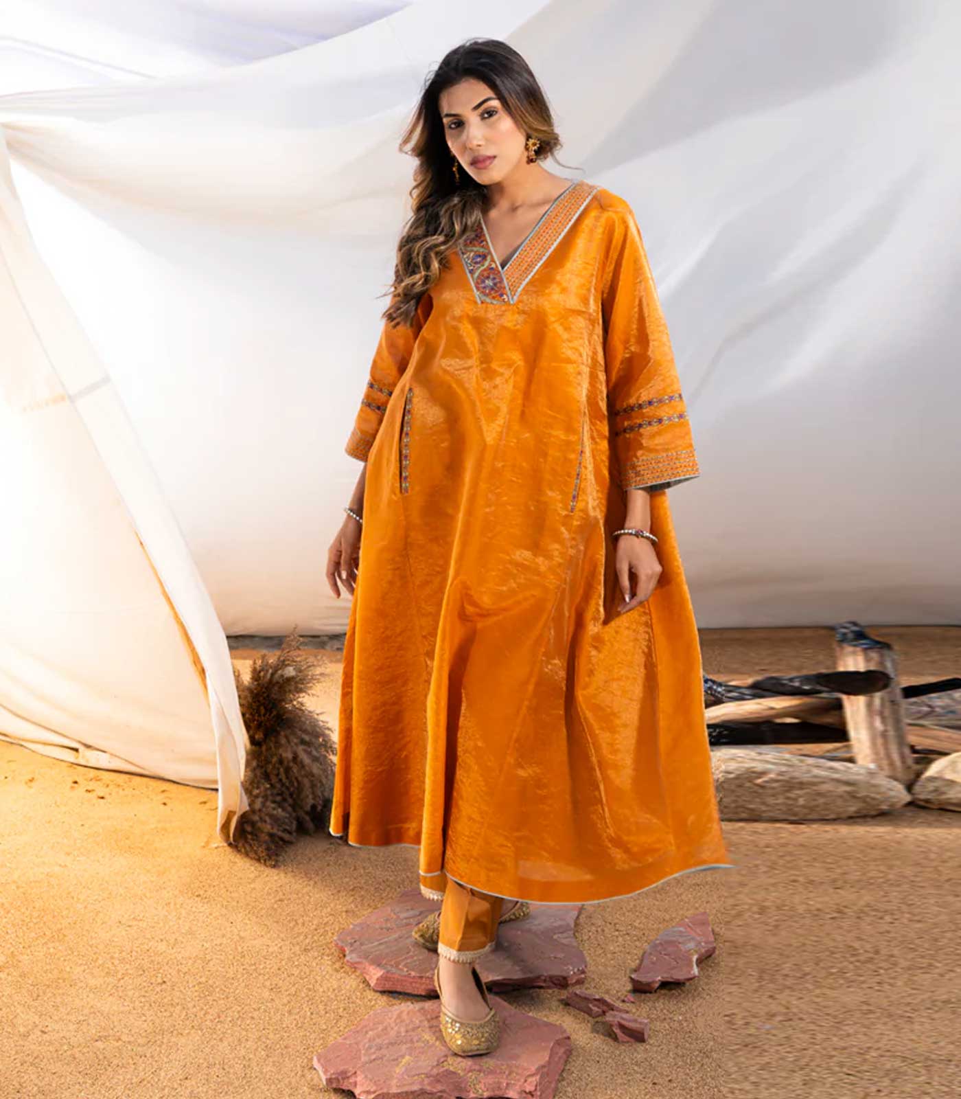 The V-neck is formed with borders inspired by Suzani designs, meticulously crafted using the rich luster of gold zari and the soft sheen of silk threads. This intricate detailing adds a touch of opulence and cultural allure to the kurta.