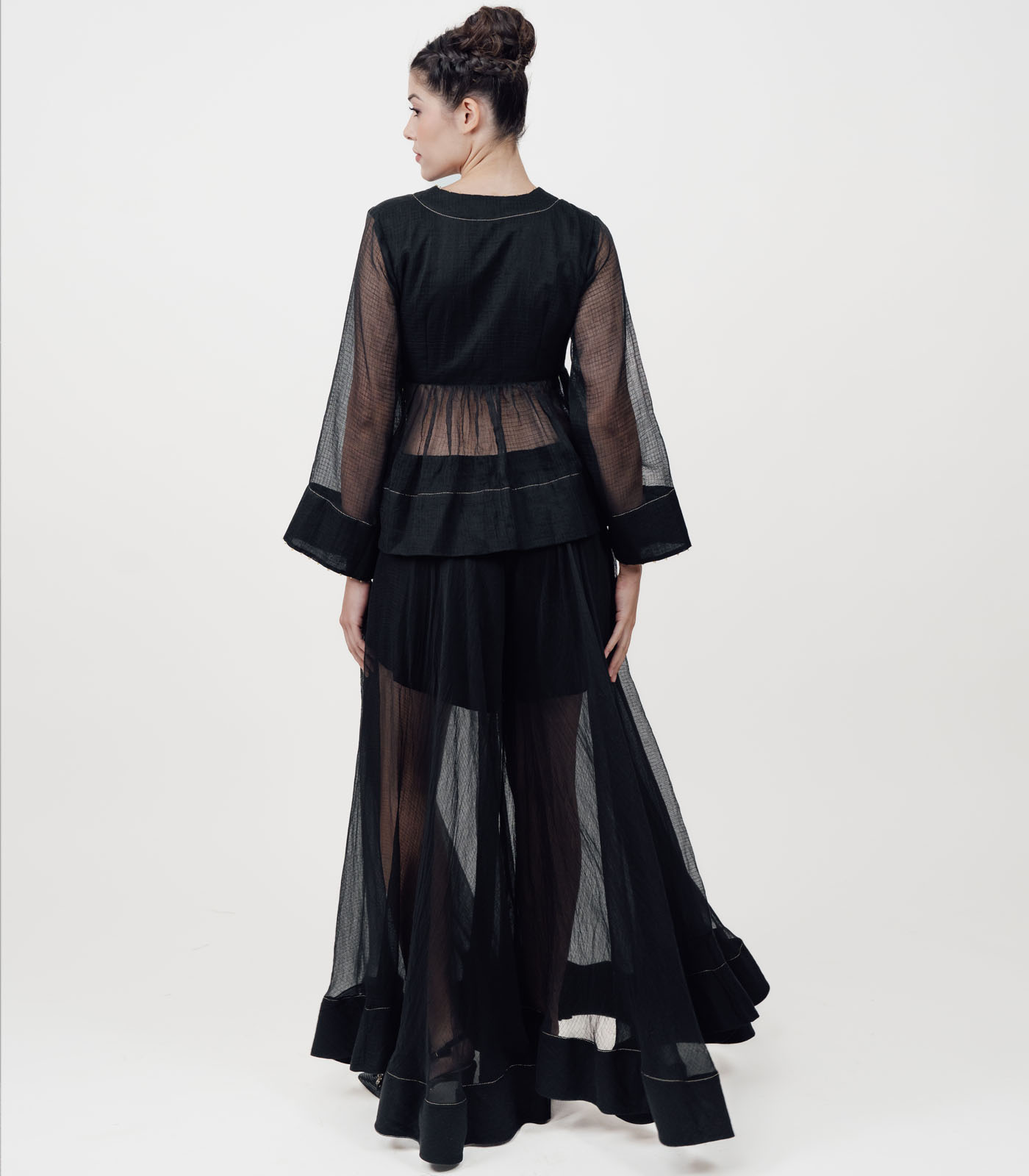 A celebration of tradition with a contemporary twist, this Co-Ord set is crafted in airy and flowy cotton Kota Doria fabric, known for its sheer elegance and lightness. The short peplum angrakha top adorned with Moti and zari, features a flattering wrap silhouette that clinches at the waist and flares gently below, adding movement and charm to the ensemble. Paired with flowing sharara pants, the set strikes a balance between ease and grandeur. Breathable and effortlessly stylish, it transitions beautifully from daytime festivities to evening gatherings, offering comfort without losing its regal appeal. The subtle texture of Kota Doria enhances the outfit’s grace, making it a timeless addition to your festive and occasion wear wardrobe.