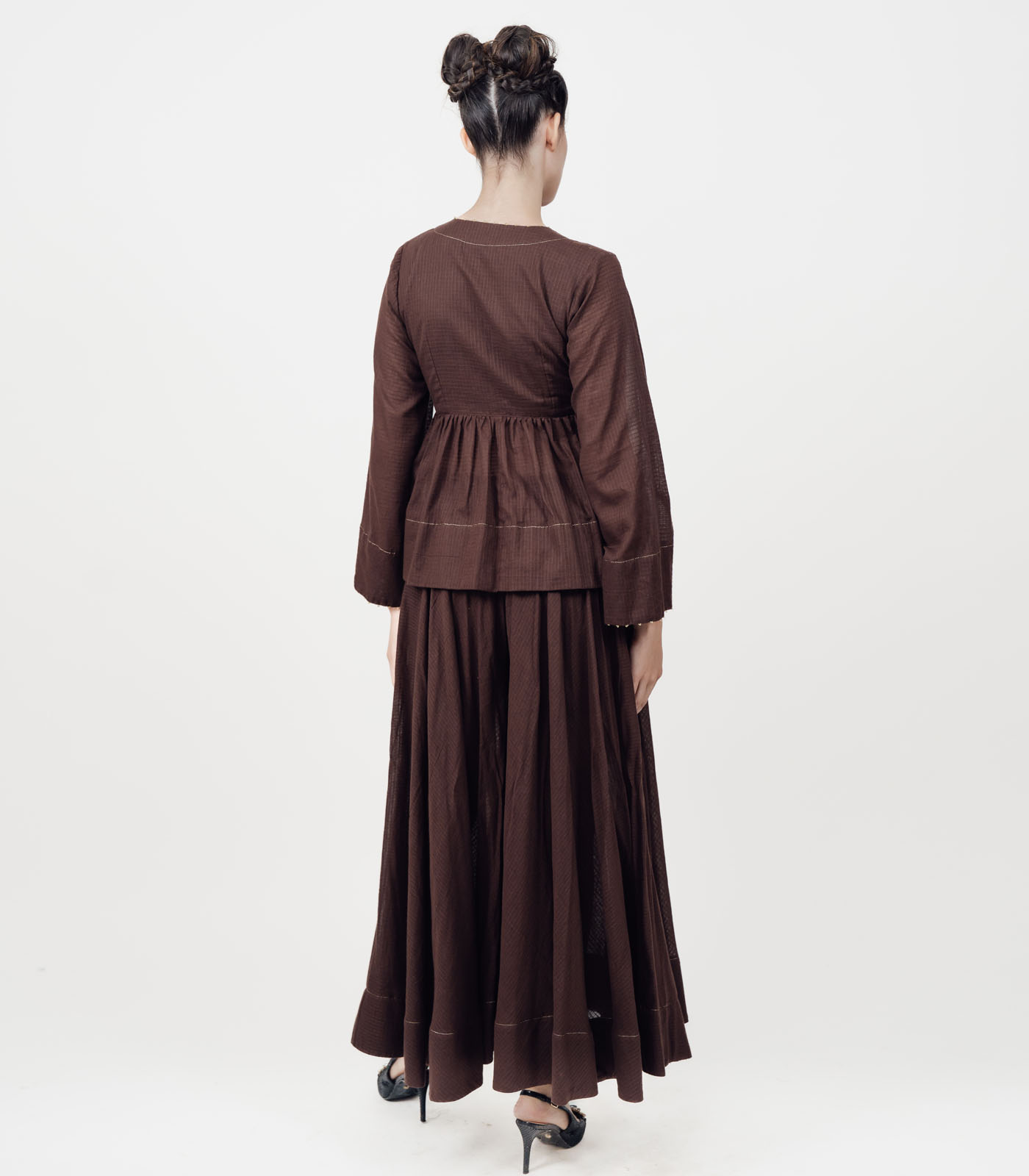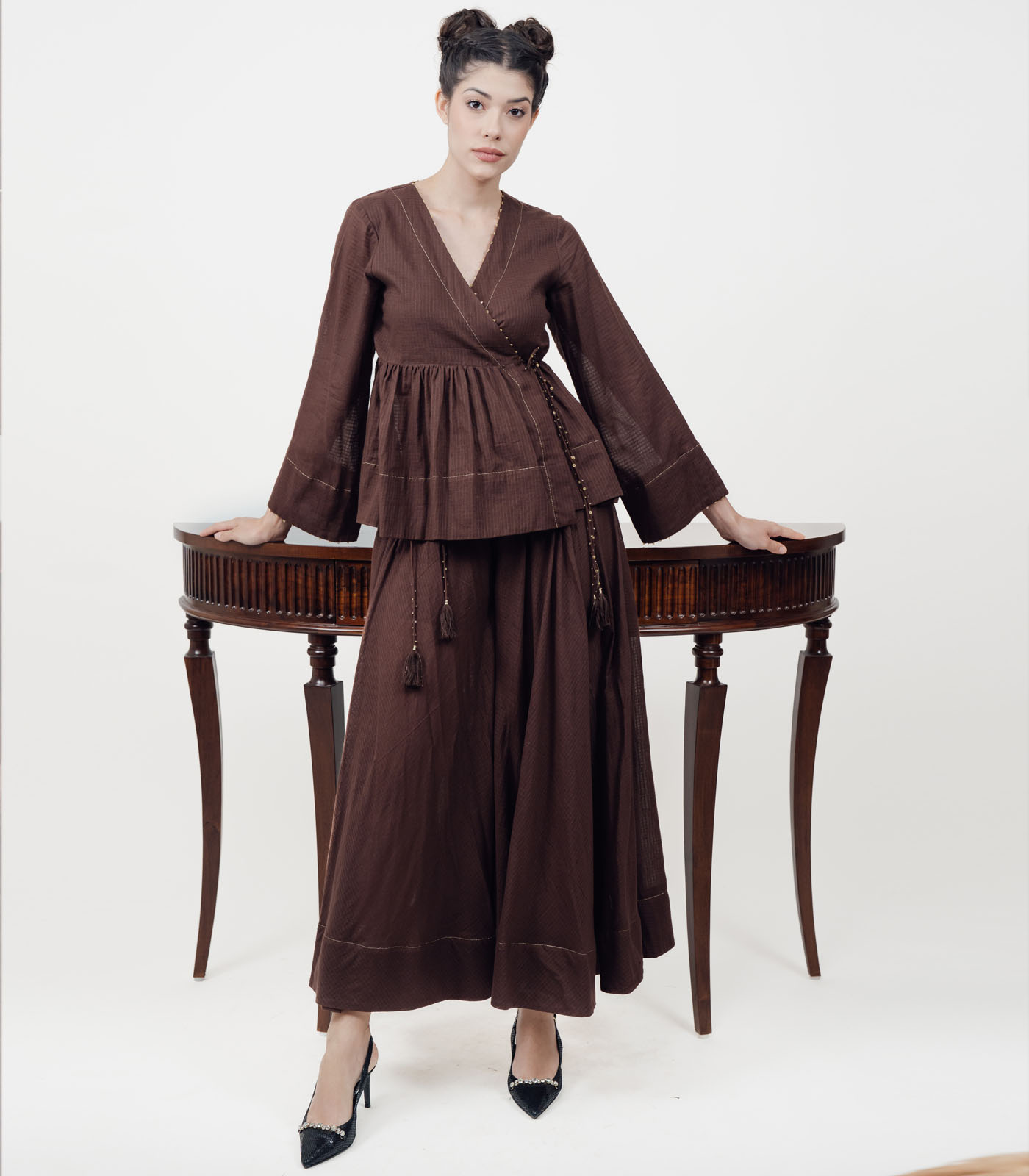 A celebration of tradition with a contemporary twist, this Co-Ord set is crafted in airy and flowy cotton Kota Doria fabric, known for its sheer elegance and lightness. The short peplum angrakha top adorned with Moti and zari, features a flattering wrap silhouette that clinches at the waist and flares gently below, adding movement and charm to the ensemble. Paired with flowing sharara pants, the set strikes a balance between ease and grandeur. Breathable and effortlessly stylish, it transitions beautifully from daytime festivities to evening gatherings, offering comfort without losing its regal appeal. The subtle texture of Kota Doria enhances the outfit’s grace, making it a timeless addition to your festive and occasion wear wardrobe.