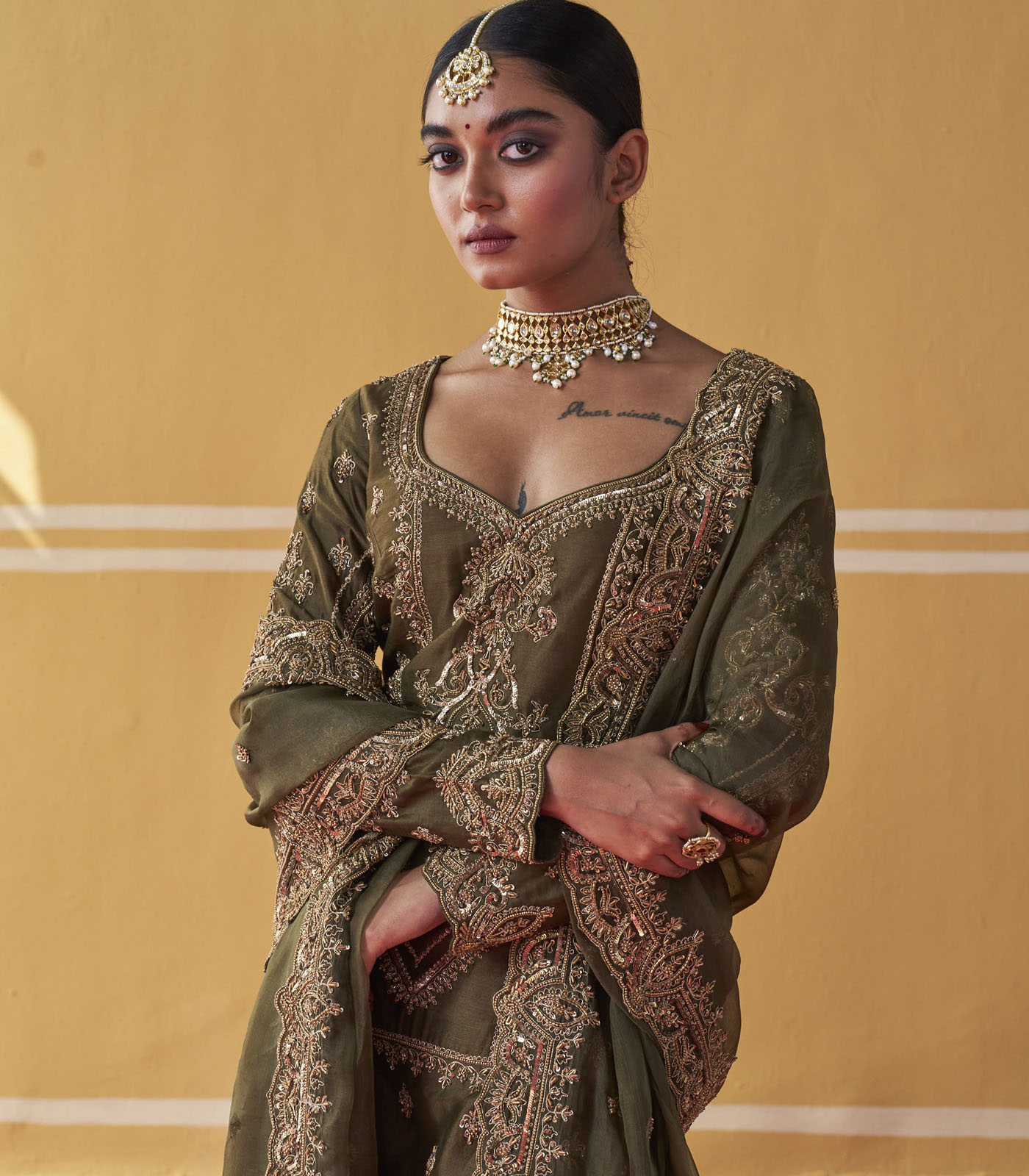 Featuring an olive green chanderi silk sharara set paired with an organza base dupatta with antique gold dori and embellished hand embroidery.