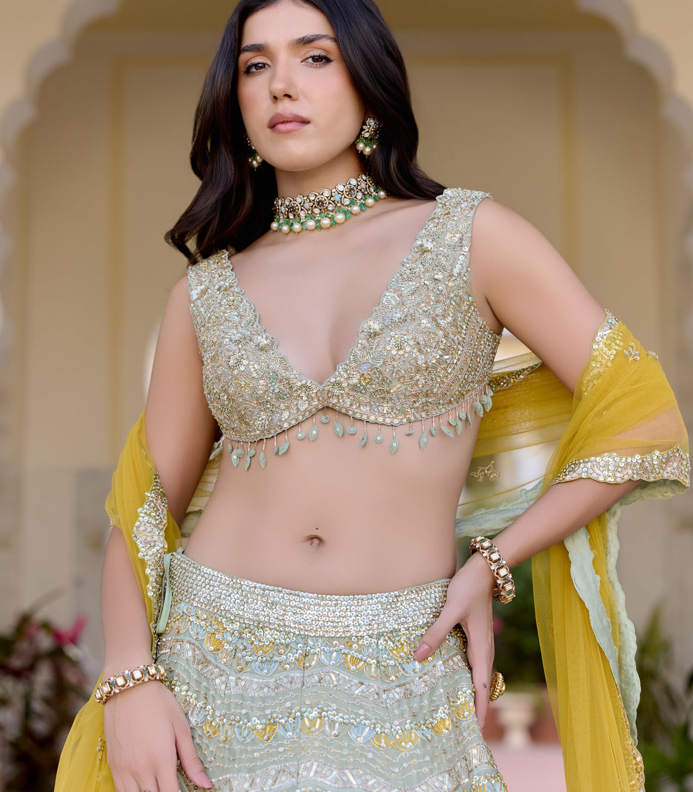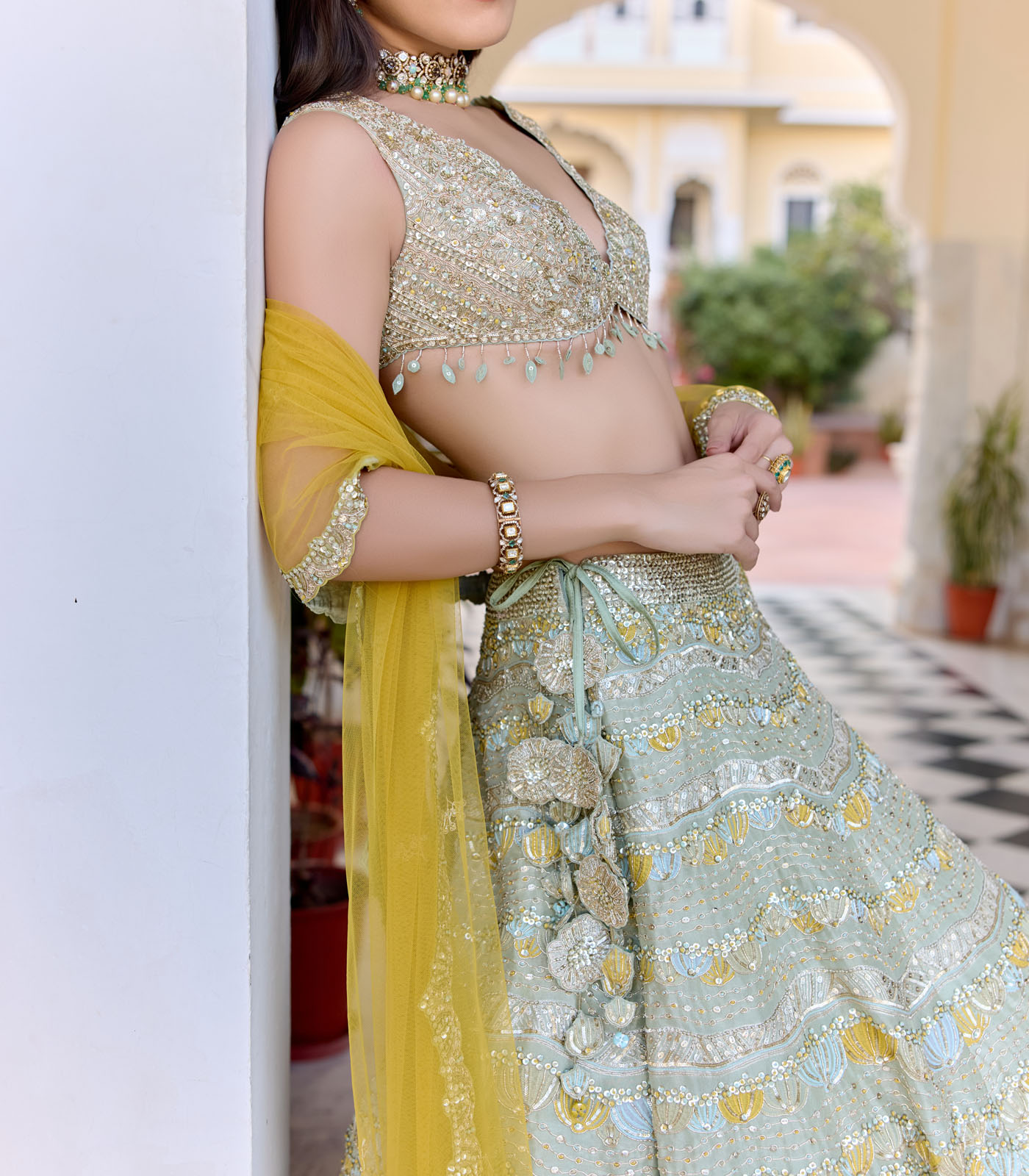 The horizontal embroidered sage lehenga is handcrafted with zardozi, french knots, thread and applique details