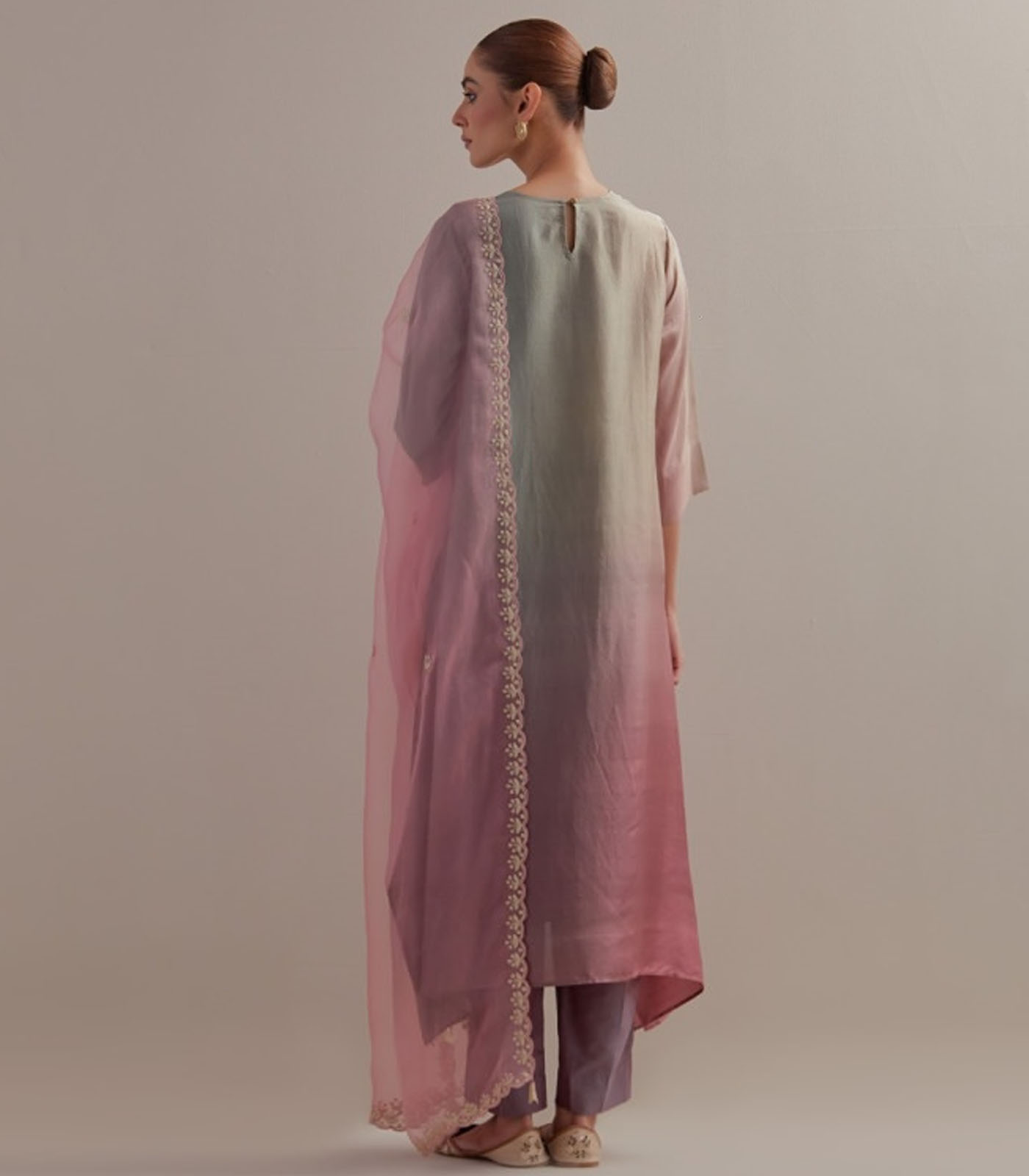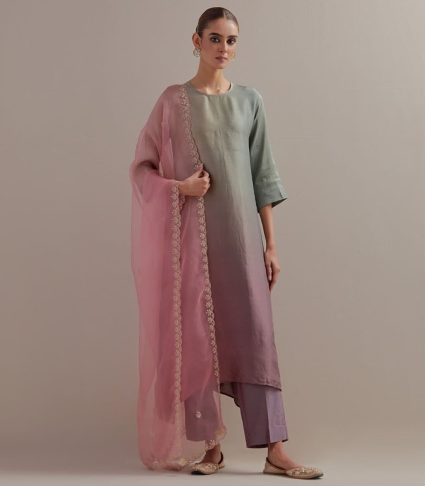 Sage Green Mauve Ombre silk kurta with scallop embroidered organza dupatta and cotton silk pants