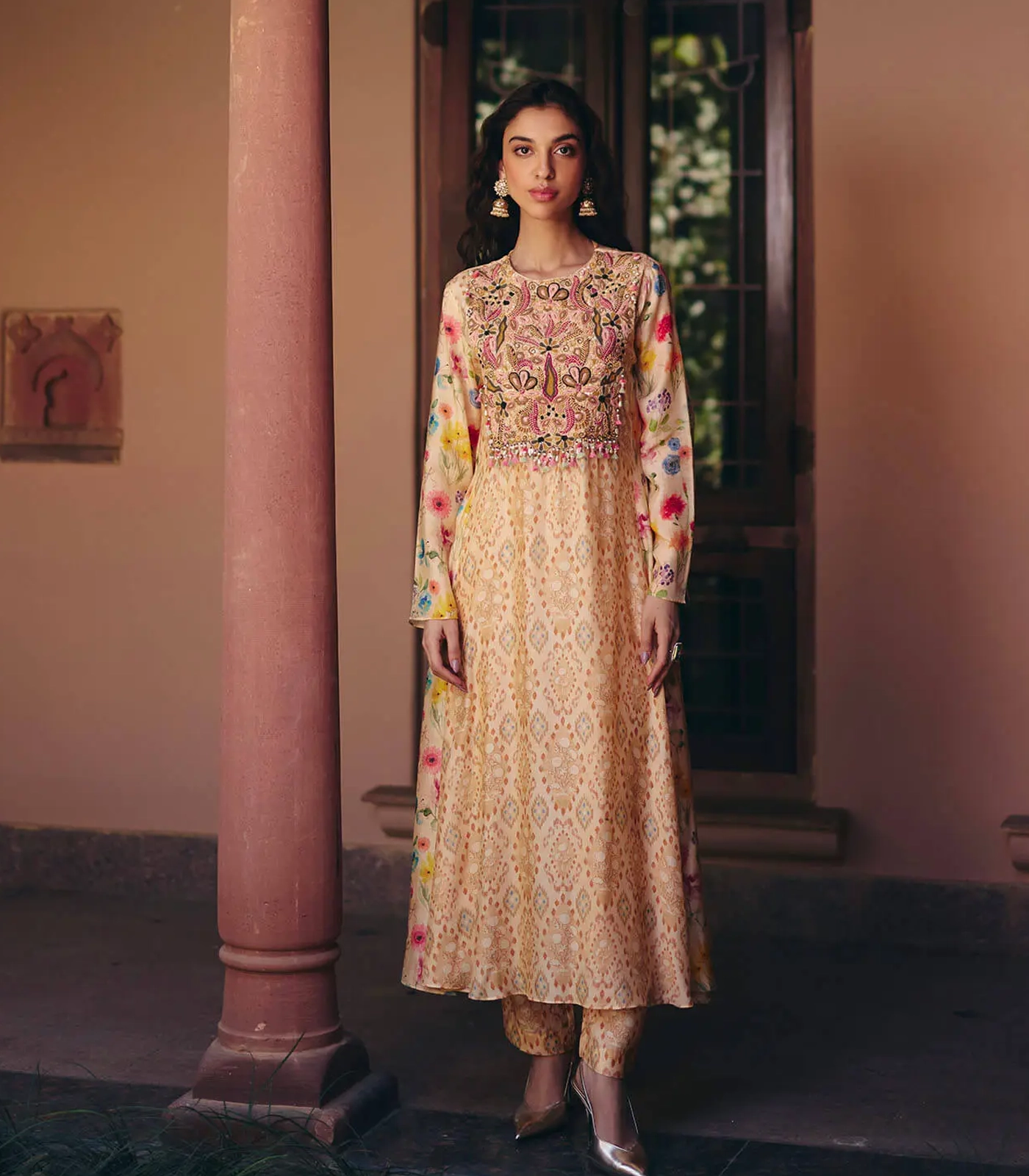 Hand embroidered kurta with a melange of ikkat & floral print teamed with pants.
