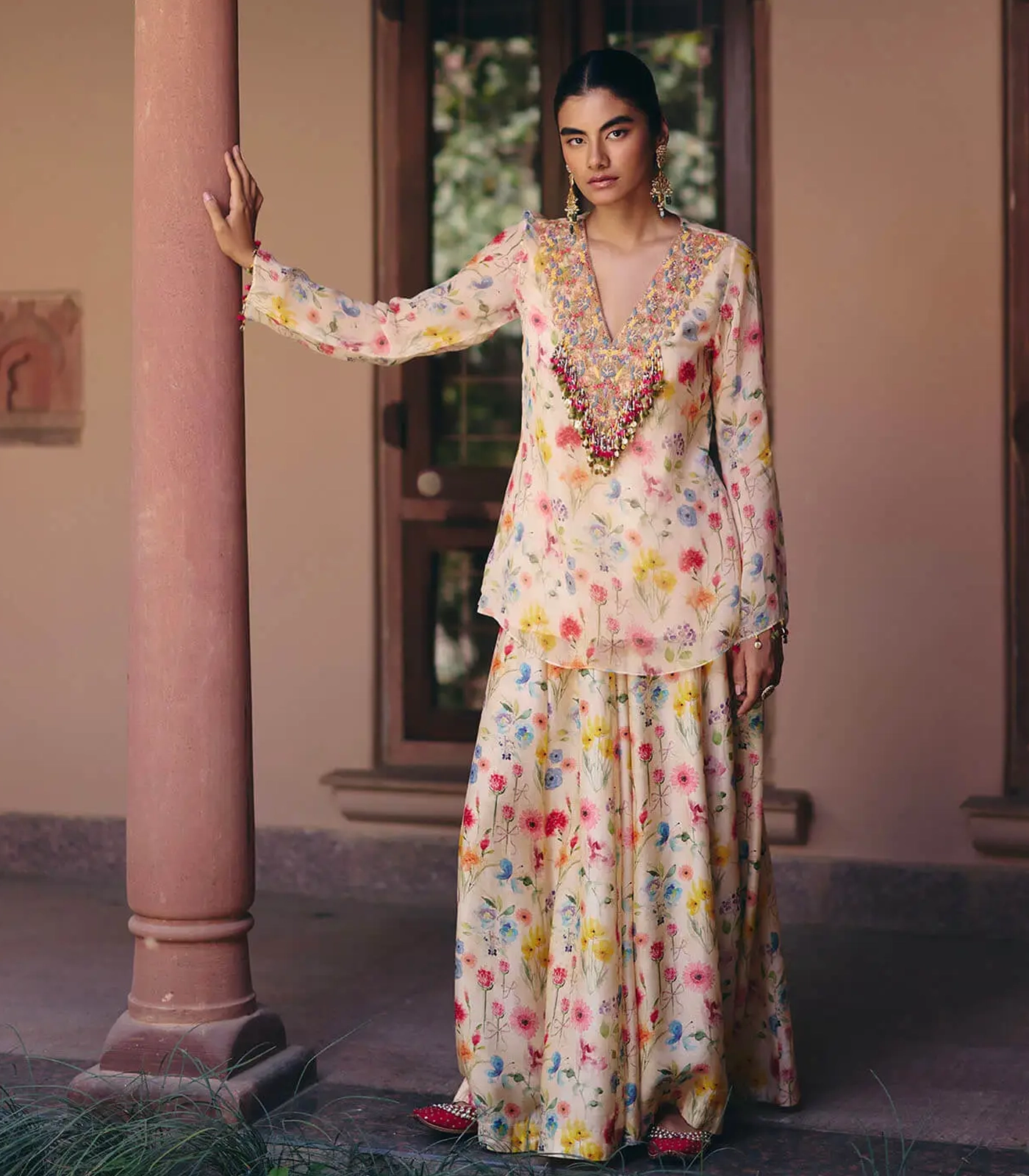 Floral organza kurta sharara set with classic marodi and thread work & colourful tassels.