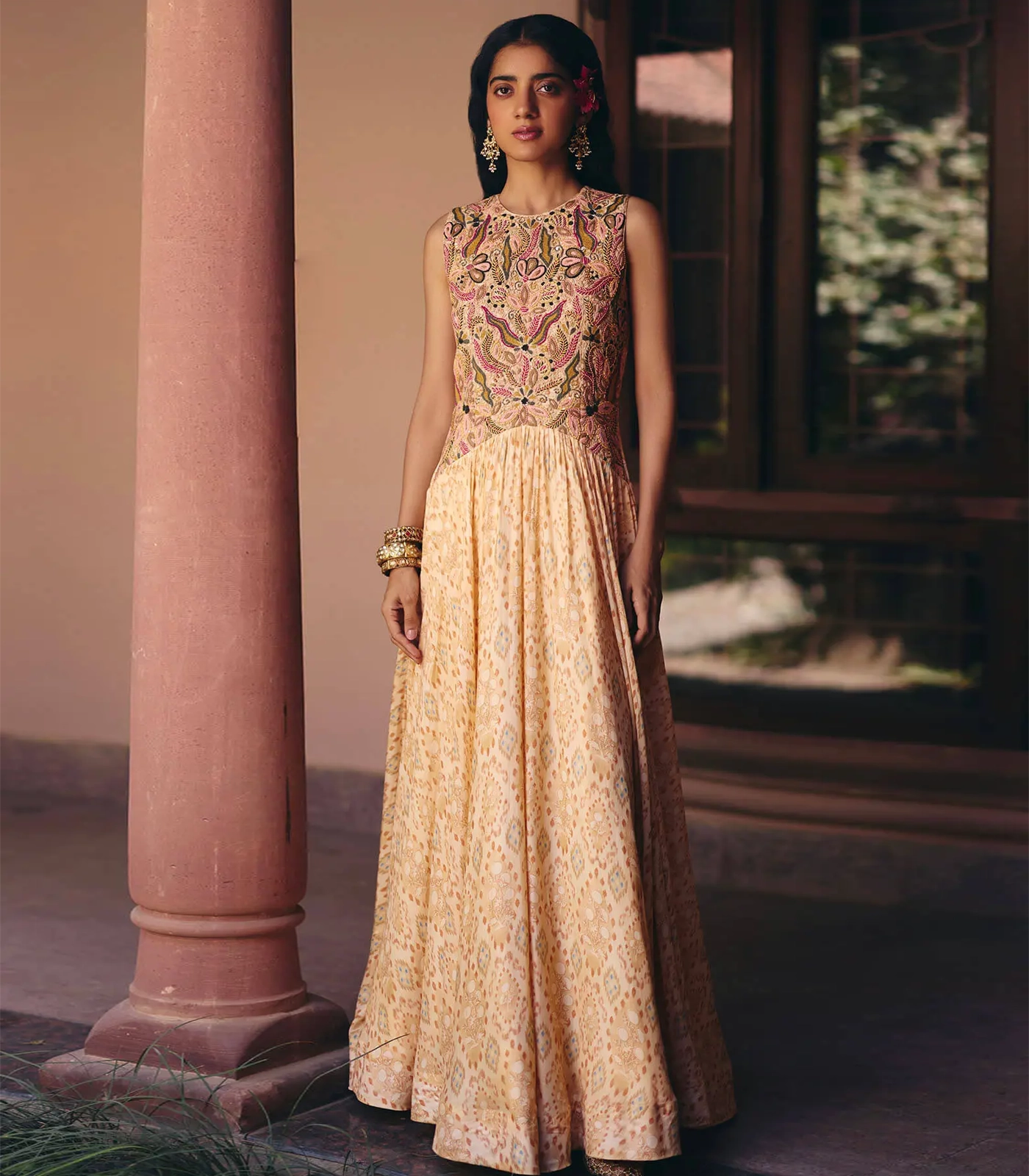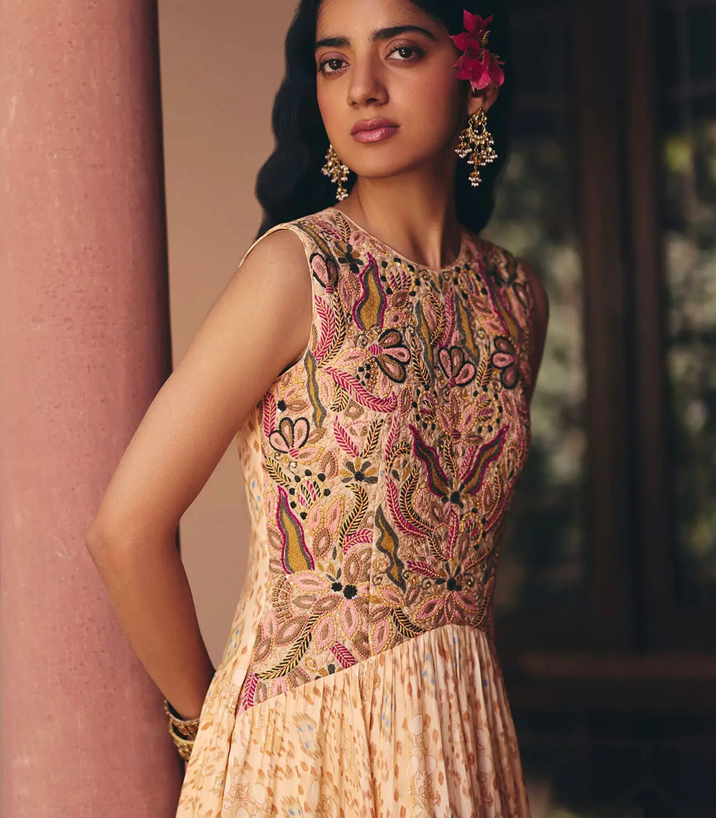 Hand embroidered waist drop maxi dress with intricate hand work in an earthy colour palette.