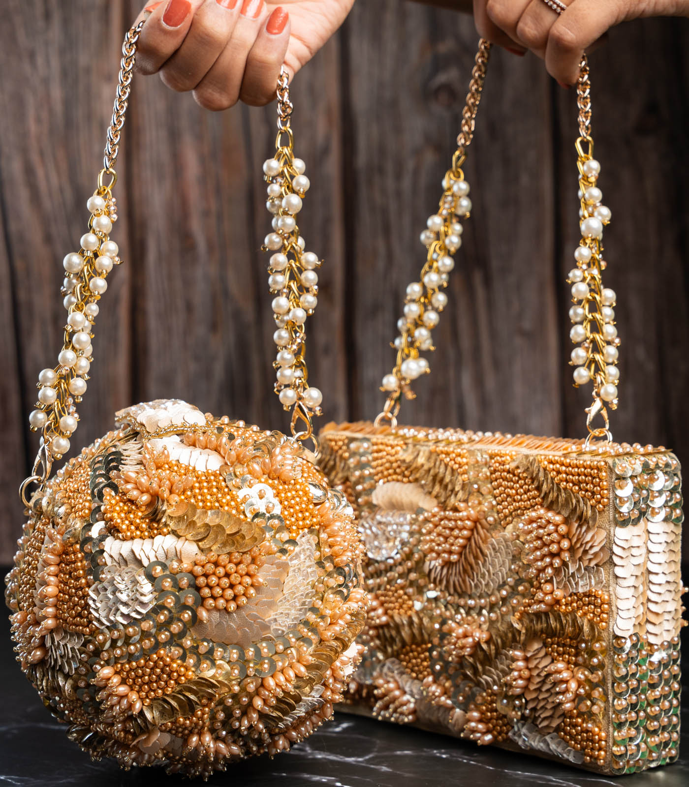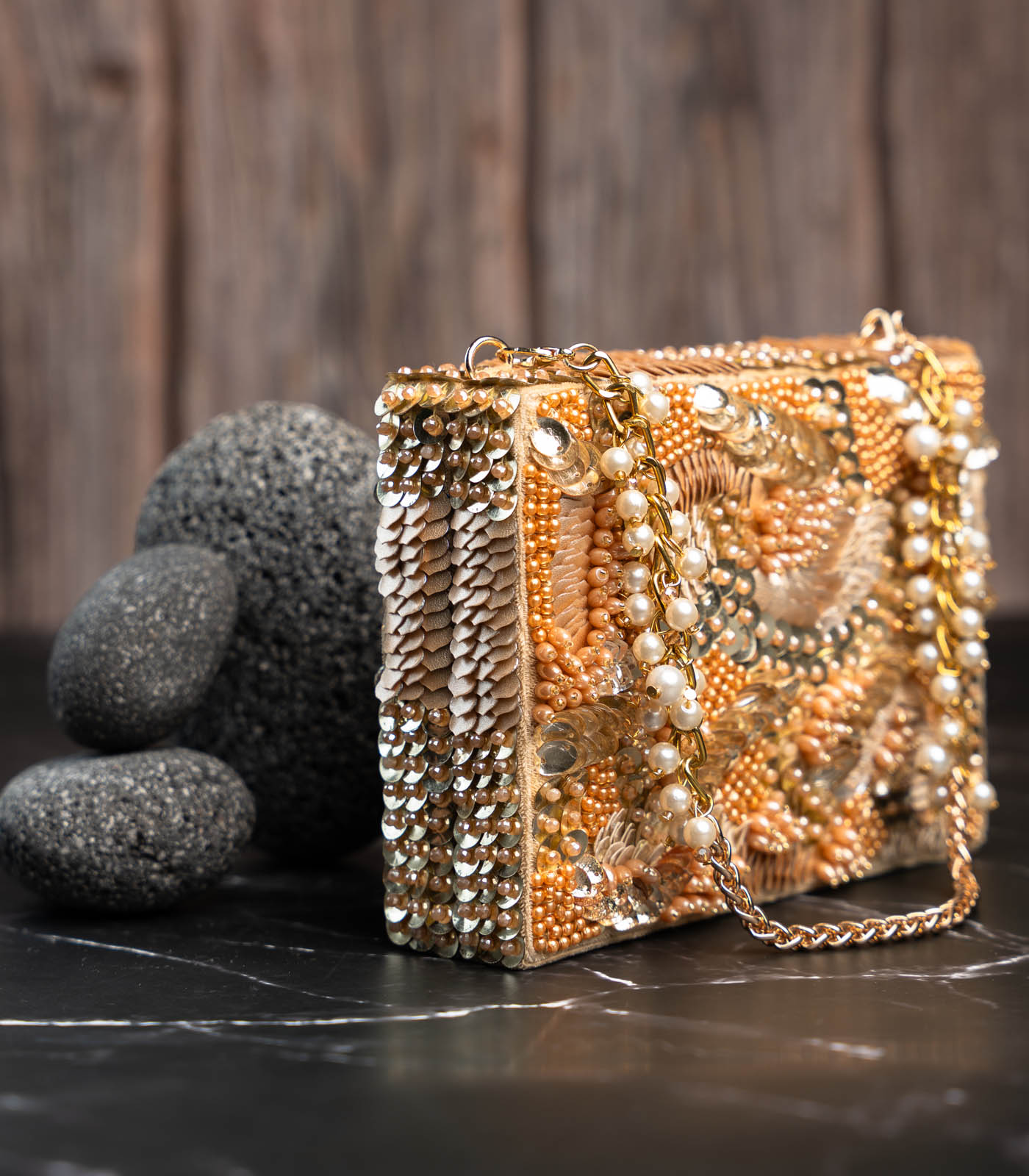 a ritzy, jewel and bead-studded rustic clutch, exuding luxury and opulence comes with shaded sequinns, enhancing its chic appeal.The bag features a delicate pearl handle, adding to its overall glamour. It is designed as a box clutch, offering a structured and stylish look, perfect for making a bold fashion statement.