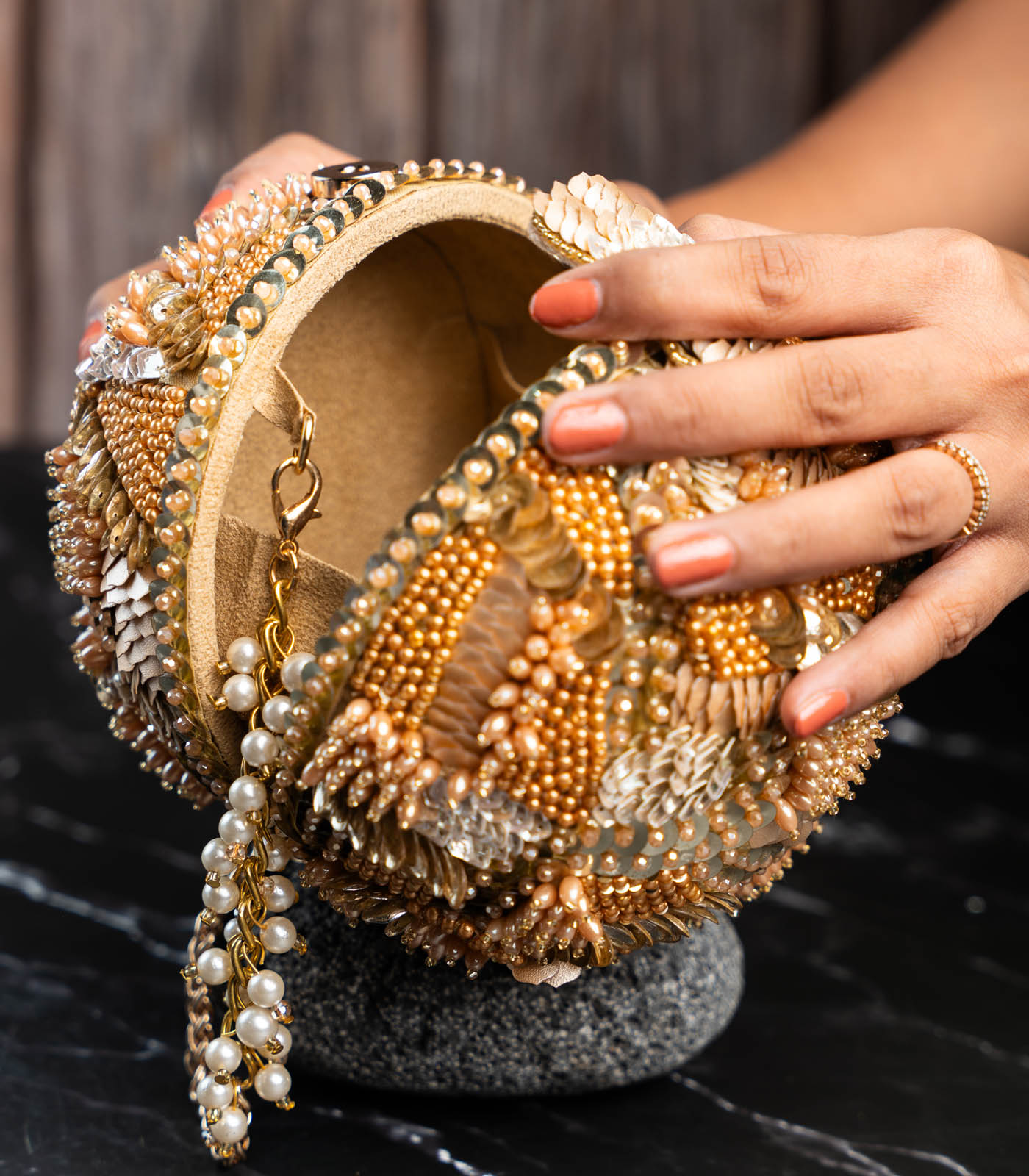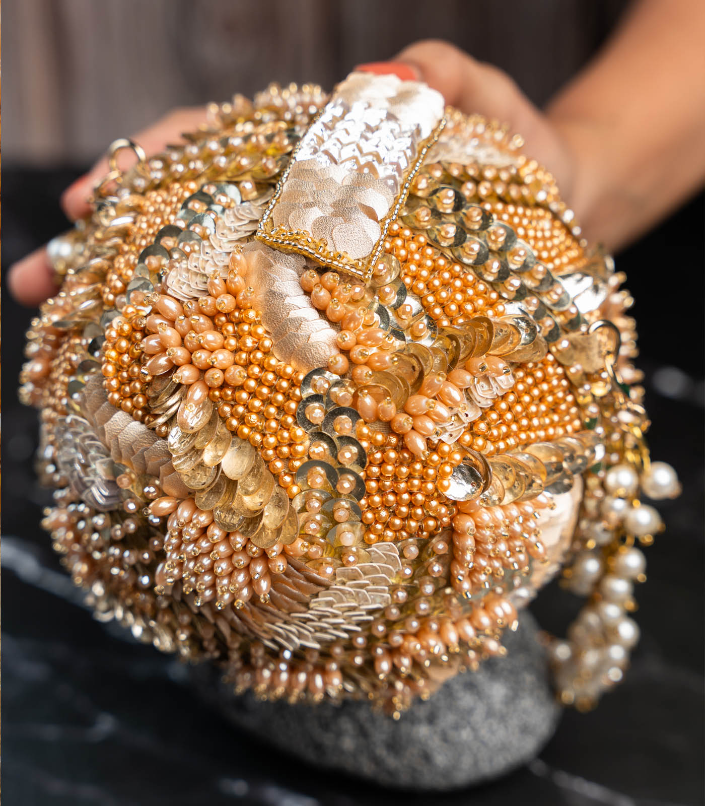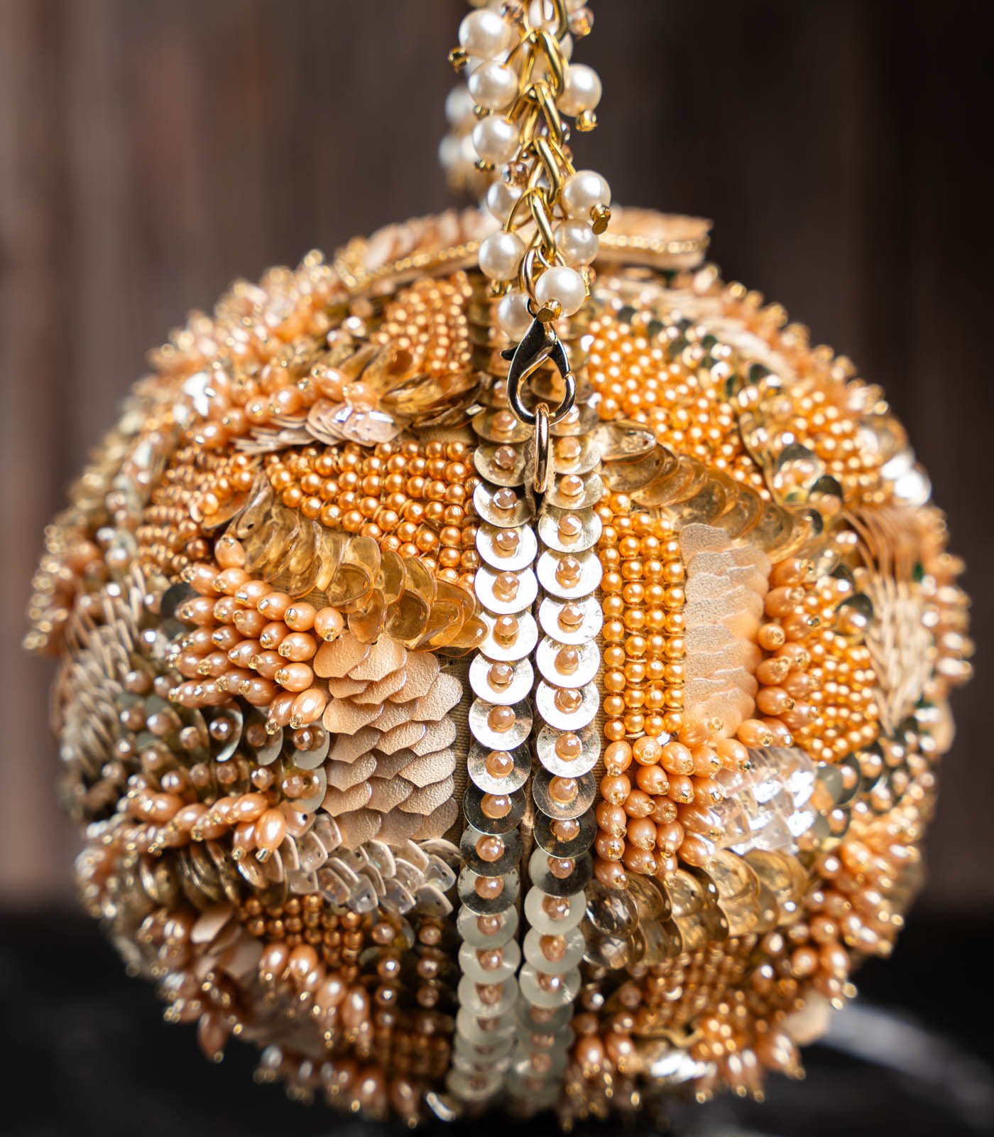 a rustic ball shaped accessory adorned with shaded sequinns and intricate bead work. Perfect for adding a touch of elegance and sparkle to any special occasion, this clutch blends artistry with a modern, sophisticated design