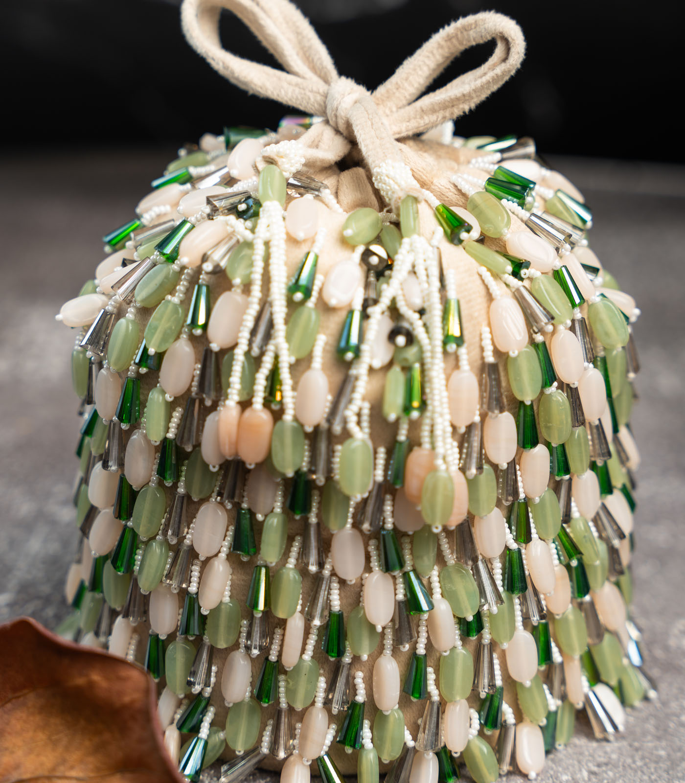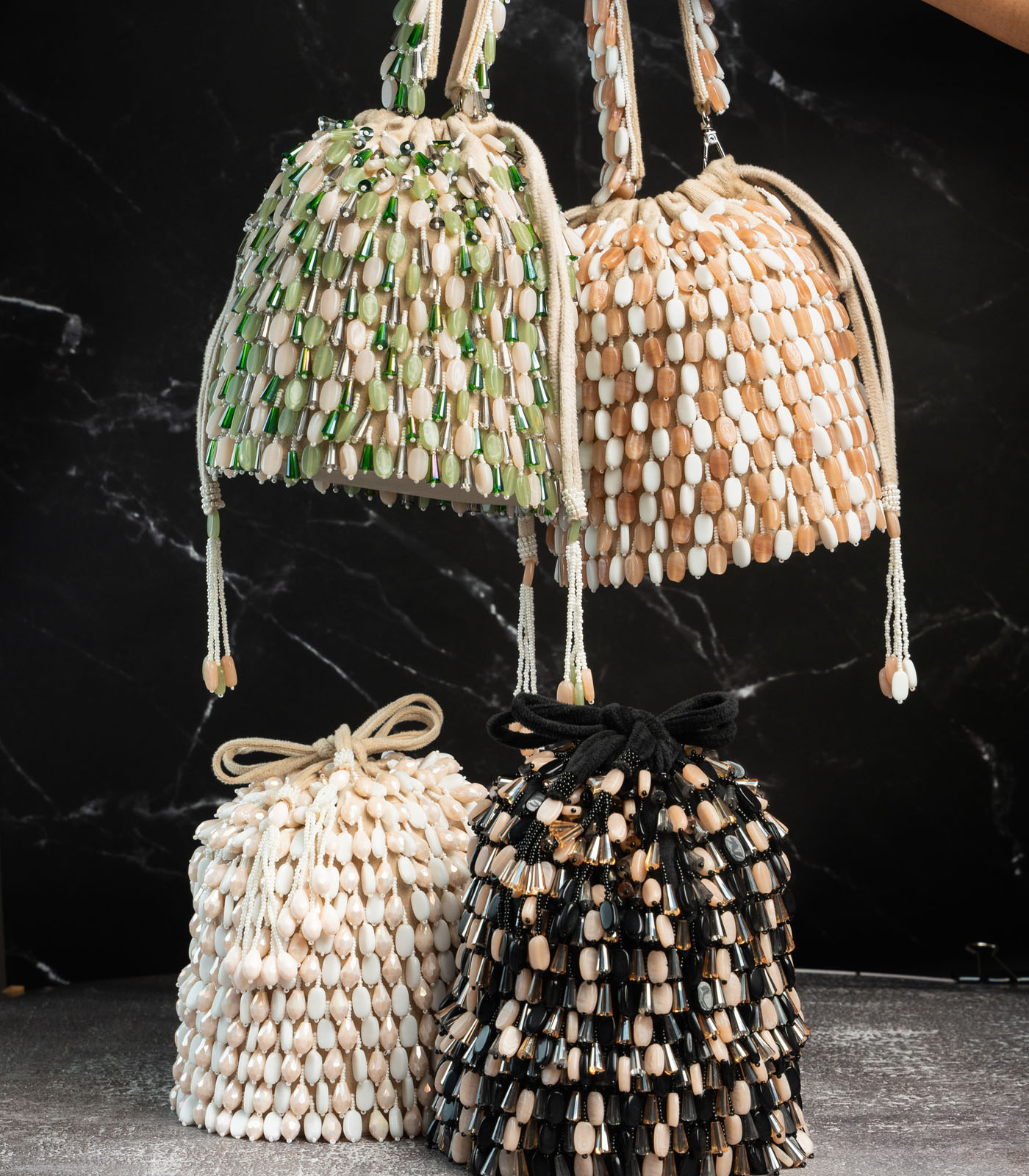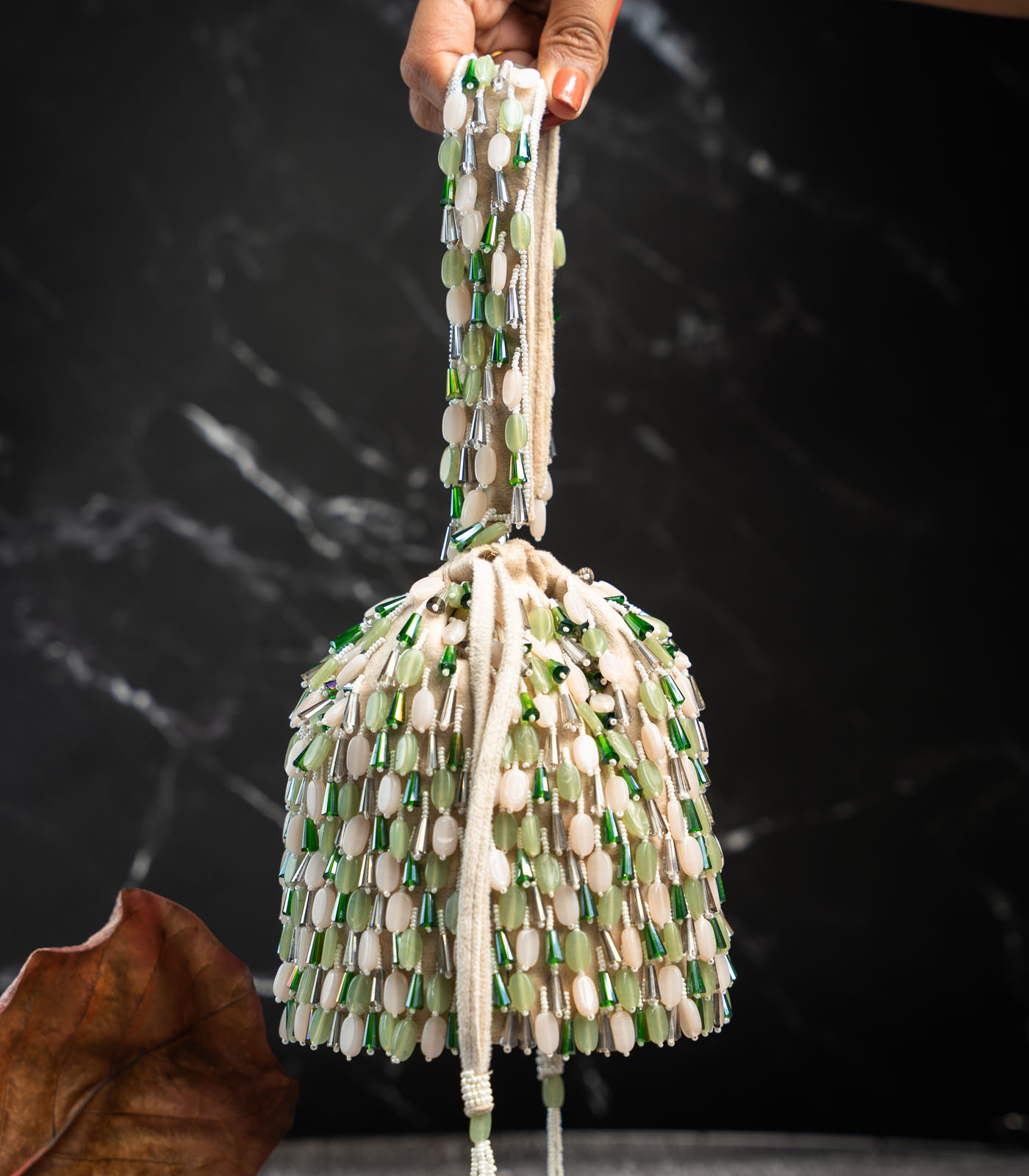 This tasseled potli is a stunning blend of elegance and craftsmanship, featuring lustrous beads and intricate work in a cream and green palette. Finished with delicate tassels, it’s the perfect accessory for weddings, festive events, or evening soirées.