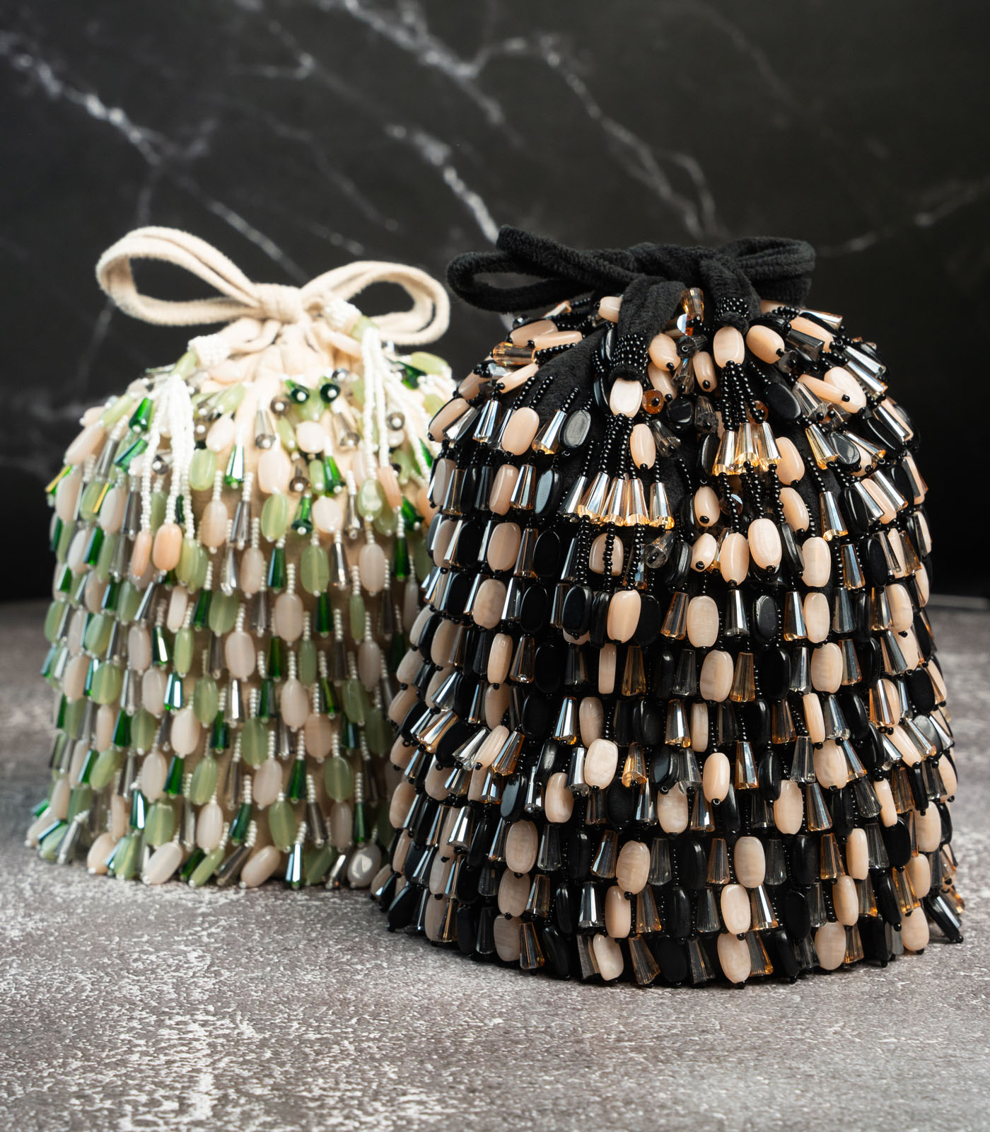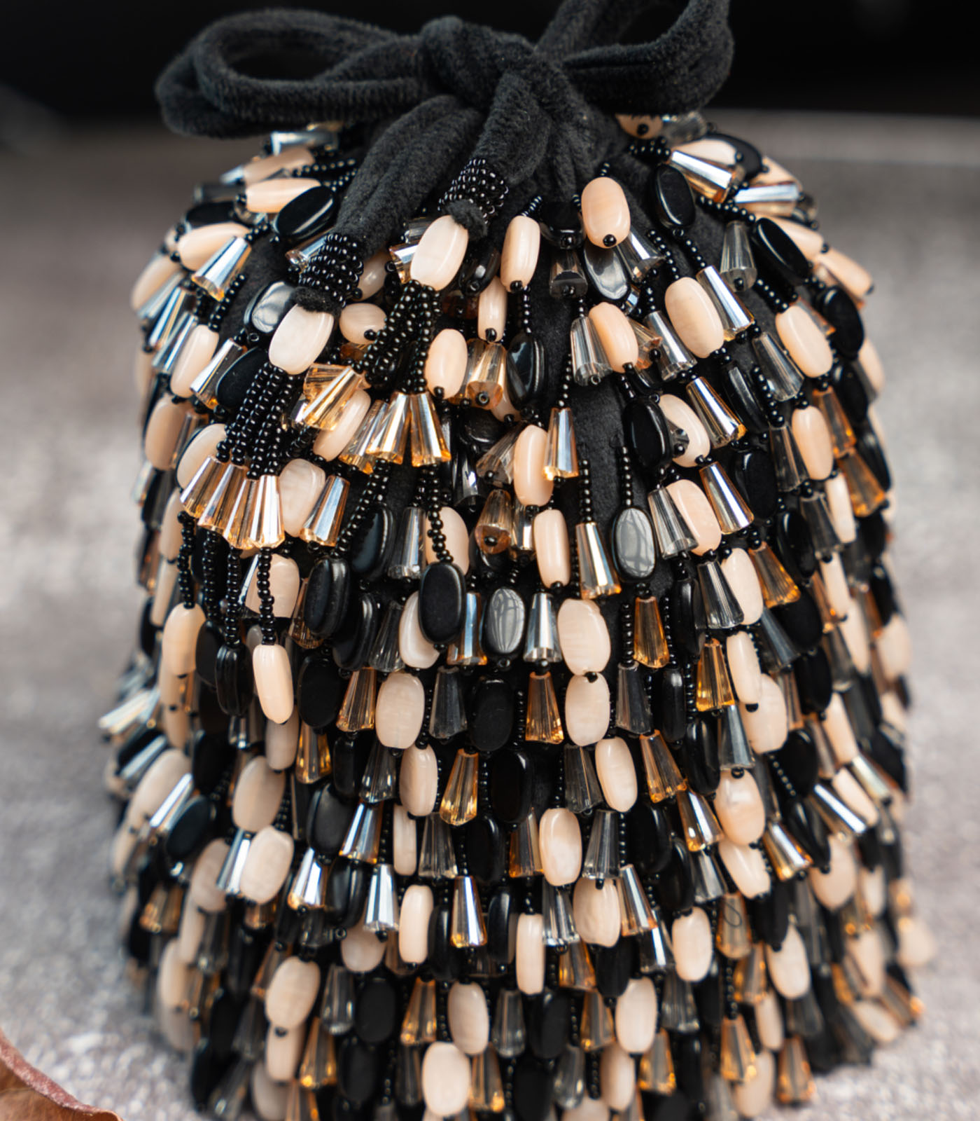 This tasseled potli is a stunning blend of elegance and craftsmanship, featuring lustrous beads and intricate work in a cream and black palette. Finished with delicate tassels, it’s the perfect accessory for weddings, festive events, or evening soirées.