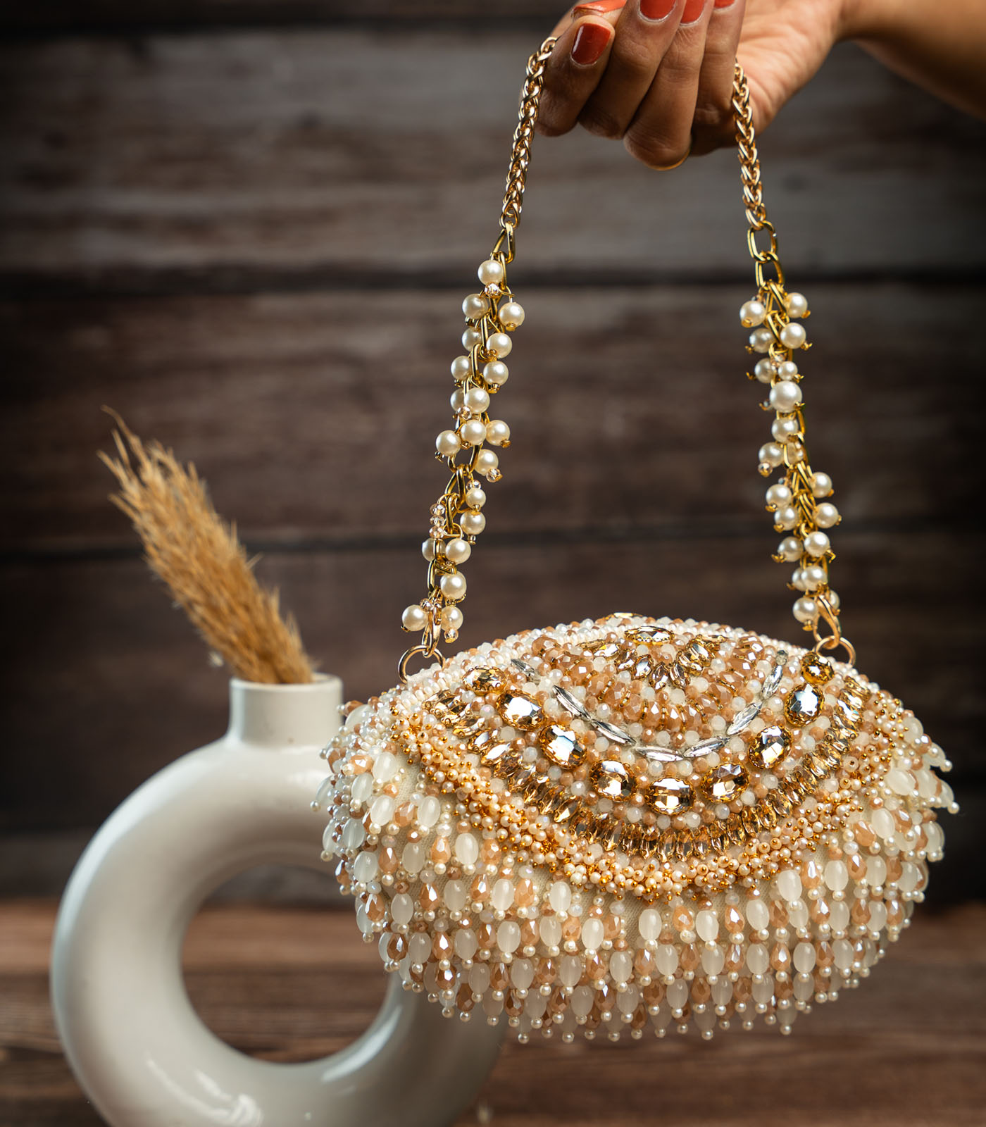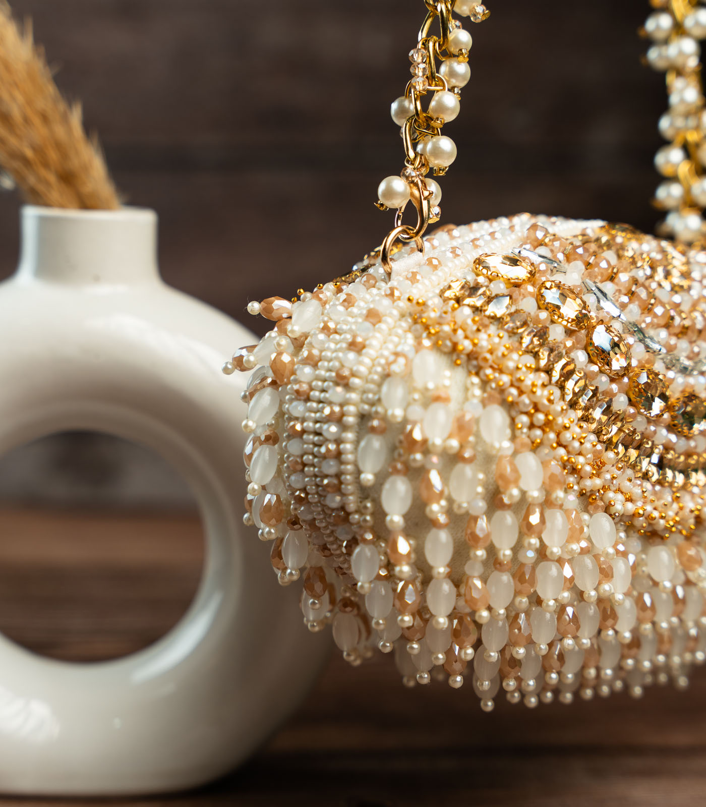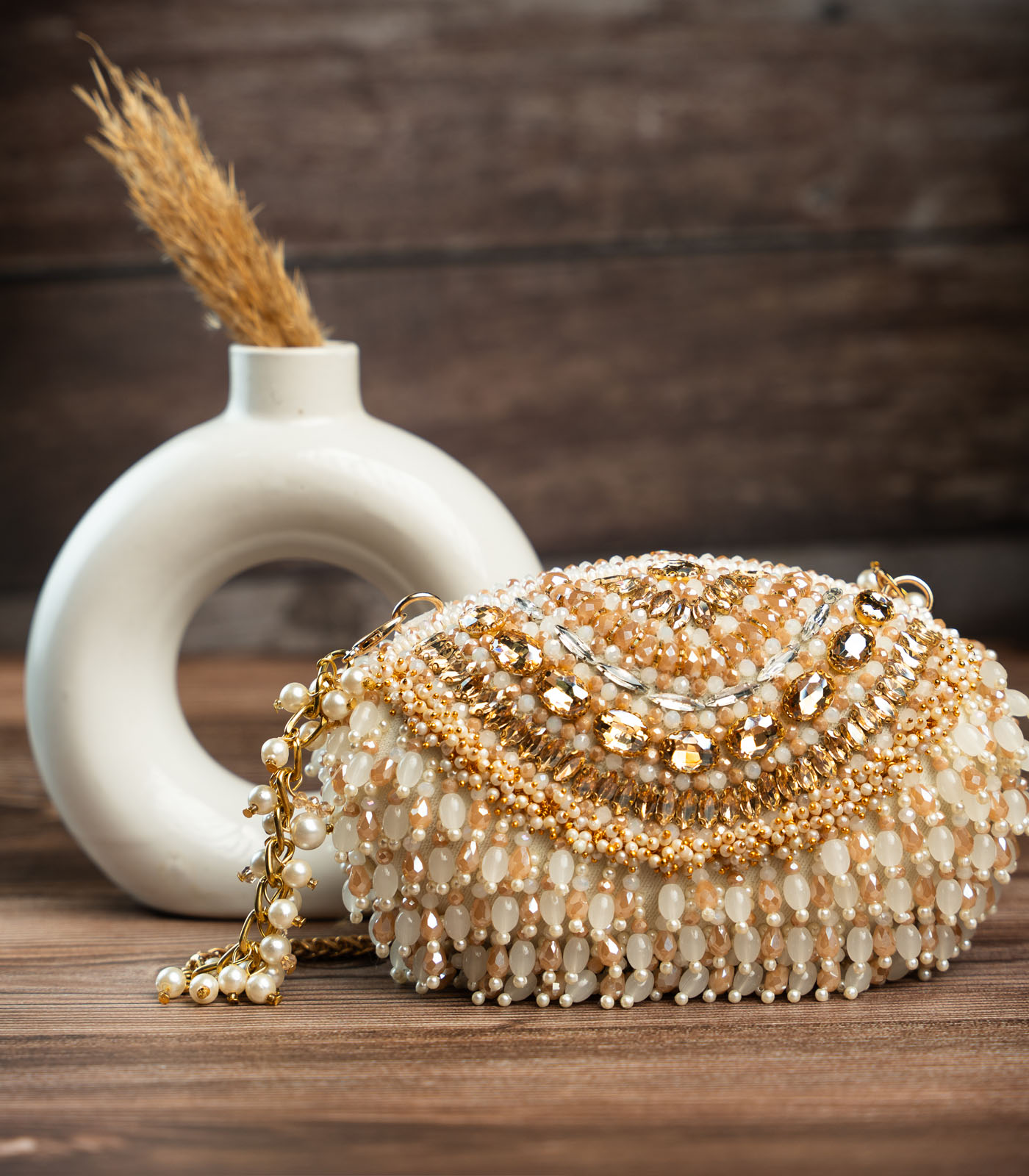 It doesn’t get more modish than this gold and off white beadwork clutch accompanied with beaded tassels throughout making it an “oh la la” addition to any contemporary fit.