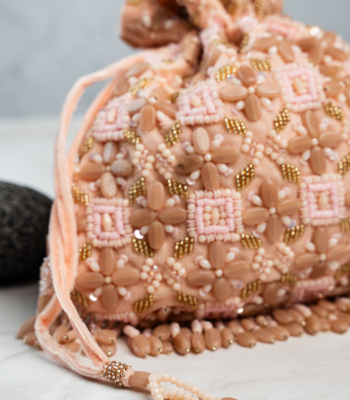 This tasseled potli is a stunning blend of elegance and craftsmanship, featuring lustrous beads and intricate work in a pink and brown palette. Finished with delicate tassels, it’s the perfect accessory for weddings, festive events, or evening soirées.